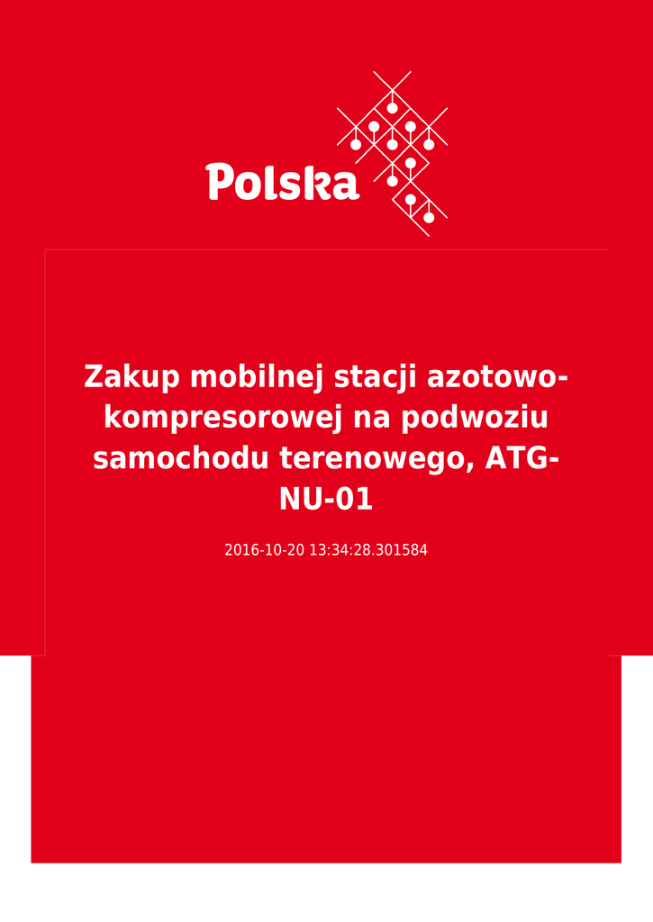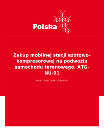 Zakup mobilnej stacji azotowokompresorowej na podwoziu samochodu terenowego, ATGNU-01 2016-10-20 13:34:28.301584 2 3 Ta oferta nie stanowi informacji handlowej Dane kontaktowe “Asia Trans Gas” Sp. z o.o. 100015 Taszkent ul. Afrosiab 12 Uzbekistan Osoba kontaktowa “Asia Trans Gas” Sp. z o.o. Sp. z o.o. [email protected], [email protected] Tel: (+998 71) 1507601 www.atg.uz Opis przedmiotu zamówienia “Asia Trans Gas” Sp. z o.o. ogłasza przetarg nr ATG-NU-01 na zakup mobilnej stacji azotowo-kompresorowej na podwoziu samochodu terenowego. Informacje uzupełniające Komplet dokumentacji w języku rosyjskim lub angielskim (koszt dokumentacji przetargowej – 100 USD) można uzyskać po złożeniu oferty na adres: Republika Uzbekistanu, 100015, Taszkent, ul. Afrosiab 12, “Asia Trans Gas” Sp. z o.o., Tel.: (+998 71) 1507601, faks: (+998 71) 1507610, e-mail: [email protected], [email protected]. Termin składania ofert upływa 22.11.2016 r. o godz. 18:00 czasu lokalnego. 4 CPV ● Maszyny górnicze, do pracy w kamieniołomach, sprzęt budowlany Forma przetargu Międzynarodowy Kraj Uzbekistan Termin składania ofert 22.11.2016 Ważna od 18.10.2016 Branże Maszyny dla górnictwa i budownictwa, Maszyny i urządzenia, 5