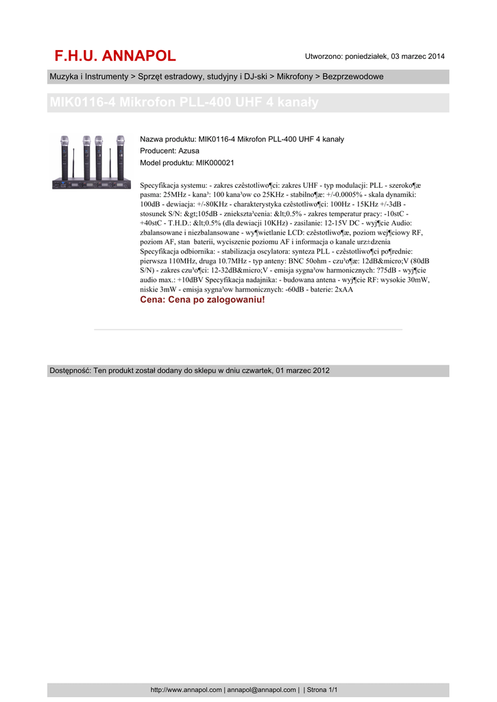 F.H.U. ANNAPOL Utworzono: poniedziałek, 03 marzec 2014 Muzyka i Instrumenty > Sprzęt estradowy, studyjny i DJ-ski > Mikrofony > Bezprzewodowe MIK0116-4 Mikrofon PLL-400 UHF 4 kanały Nazwa produktu: MIK0116-4 Mikrofon PLL-400 UHF 4 kanały Producent: Azusa Model produktu: MIK000021 Specyfikacja systemu: - zakres czêstotliwo¶ci: zakres UHF - typ modulacji: PLL - szeroko¶æ pasma: 25MHz - kana³: 100 kana³ow co 25KHz - stabilno¶æ: +/-0.0005% - skala dynamiki: 100dB - dewiacja: +/-80KHz - charakterystyka czêstotliwo¶ci: 100Hz - 15KHz +/-3dB stosunek S/N: >105dB - zniekszta³cenia: <0.5% - zakres temperatur pracy: -10stC +40stC - T.H.D.: <0.5% (dla dewiacji 10KHz) - zasilanie: 12-15V DC - wyj¶cie Audio: zbalansowane i niezbalansowane - wy¶wietlanie LCD: czêstotliwo¶æ, poziom wej¶ciowy RF, poziom AF, stan baterii, wyciszenie poziomu AF i informacja o kanale urz±dzenia Specyfikacja odbiornika: - stabilizacja oscylatora: synteza PLL - czêstotliwo¶ci po¶rednie: pierwsza 110MHz, druga 10.7MHz - typ anteny: BNC 50ohm - czu³o¶æ: 12dBµV (80dB S/N) - zakres czu³o¶ci: 12-32dBµV - emisja sygna³ow harmonicznych: ?75dB - wyj¶cie audio max.: +10dBV Specyfikacja nadajnika: - budowana antena - wyj¶cie RF: wysokie 30mW, niskie 3mW - emisja sygna³ow harmonicznych: -60dB - baterie: 2xAA Cena: Cena po zalogowaniu! Dostępność: Ten produkt został dodany do sklepu w dniu czwartek, 01 marzec 2012 http://www.annapol.com | [email protected] | | Strona 1/1