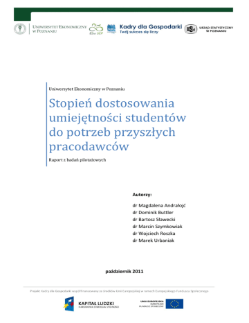 Uniwersytet Ekonomiczny w Poznaniu Stopień dostosowania umiejętności studentów do potrzeb przyszłych pracodawców Raport z badań pilotażowych Autorzy: dr Magdalena Andrałojć dr Dominik Buttler dr Bartosz Sławecki dr Marcin Szymkowiak dr Wojciech Roszka dr Marek Urbaniak październik 2011 Spis treści Wprowadzenie ........................................................................................................................................ 3 1.1. Metoda .................................................................................................................................... 5 1.2. Analiza rzetelności kwestionariusza dla studentów UEP ........................................................ 5 Analiza opisowa, wstępne obserwacje i wnioski............................................................................. 7 2.1. 2.1.1. Charakterystyka respondentów ...................................................................................... 7 2.1.2. Motywy studiowania i dodatkowe pytania ..................................................................... 8 2.1.3. Kompetencje studentów UEP........................................................................................ 12 2.1.4. Cechy pożądane na rynku pracy.................................................................................... 15 2.2. Pracodawcy ........................................................................................................................... 16 2.2.1. Uwagi wstępne i charakterystyka respondentów ......................................................... 16 2.2.2. Kompetencje studentów UEP........................................................................................ 19 2.2.3. Cechy pożądane na rynku pracy i pytanie dodatkowe.................................................. 21 2.3. 3. Studenci................................................................................................................................... 7 Nauczyciele akademiccy........................................................................................................ 22 2.3.1. Uwagi wstępne, charakterystyka respondentów i pytania dodatkowe........................ 22 2.3.2. Kompetencje studentów UEP........................................................................................ 24 2.3.3. Cechy pożądane na rynku pracy.................................................................................. 266 Uwagi do kwestionariuszy........................................................................................................... 288 Załącznik A. Analiza kompetencji studentów UEP – oceny studentów............................................. 33 Załącznik B. Analiza kompetencji studentów UEP – oceny pracodawców........................................ 43 Załącznik C. Analiza kompetencji studentów UEP – oceny nauczycieli akademickich...................... 51 2 2. Analiza rzetelności........................................................................................................................... 5 Strona 1. Wprowadzenie Badanie stopnia dostosowania umiejętności studentów do potrzeb przyszłych pracodawców realizowane jest w ramach projektu Kadry dla Gospodarki (KdG). Celem ogólnym projektu KdG jest zwiększenie atrakcyjności absolwentów Uniwersytetu Ekonomicznego w Poznaniu na rynku pracy poprzez realizację programu rozwojowego w okresie od września 2010 do września 2015. Program obejmuje m.in. wzbogacenie oferty edukacyjnej uczelni o nowy kierunek i zajęcia wyrównawcze z matematyki i fizyki, rozwój współpracy z praktykami biznesu, ukierunkowanie procesu kształcenia na potrzeby rynku pracy i rozwój gospodarki opartej na wiedzy. W pierwszym roku realizacji projektu badawczego (od września 2010r. do sierpnia 2011r.) opracowano metodologię badań, przygotowano kwestionariusz ankiety audytoryjnej w trzech wersjach (wersja dla pracodawców, wersja dla studentów UEP i wersja dla pracowników UEP) oraz przeprowadzono badania pilotażowe. Efektem prac zespołu badawczego pod kierunkiem naukowym prof. Józefa Orczyka jest Raport metodologiczny (data publikacji 30 lipca 2011 r.) oraz zawarty w tej publikacji Raport z badań pilotażowych. Niniejszy raport koncentruje się na analizie wyników badań pilotażowych przeprowadzonych wśród pracodawców oraz studentów i pracowników UEP. Obok analizy opisowej wyników badań, wstępnych obserwacji i wniosków, prezentowany dokument zawiera także uwagi do kwestionariuszy i propozycje ich modyfikacji. Celem raportu jest zatem w pierwszej kolejności przedstawienie wniosków na temat rzetelności i trafności przygotowanych narzędzi badawczych oraz przedłożenie propozycji zmian kwestionariuszy w oparciu o rezultaty badań pilotażowych. Badania pilotażowe zostały przeprowadzone w okresie od maja do sierpnia 2011 r. Rozpoczęto je tuż po zakończeniu prac nad pierwszą wersją kwestionariuszy ankiet. Celem badań pilotażowych było przetestowanie narzędzi badawczych, sprawdzenie ich rzetelności oraz uzyskanie informacji zwrotnej od respondentów dotyczących przygotowanych kwestionariuszy. Uczestnicy badań byli proszeni nie tylko o wypełnienie kwestionariusza ale także o umieszczenie na nich w formie pisemnej wszelkich wątpliwości, pytań, uwag, opinii i propozycji zmian dotyczących zarówno formy, jak i treści kwestionariuszy. Część respondentów przekazała także swoje uwagi ustnie osobom odpowiedzialnym za realizację badań. Strona Raport składa się z 4 części. W pierwszej zaprezentowano wyniki analizy rzetelności kwestionariusza w wersji dla studentów UEP. Z uwagi na niewielką liczbę pracodawców i pracowników uczelni nie było możliwości przeprowadzenia podobnych analiz dla pozostałych wersji kwestionariusza. Druga część raportu zawiera analizę opisową zebranych danych, wstępne obserwacje i wnioski. Rezultaty analiz przedstawiono