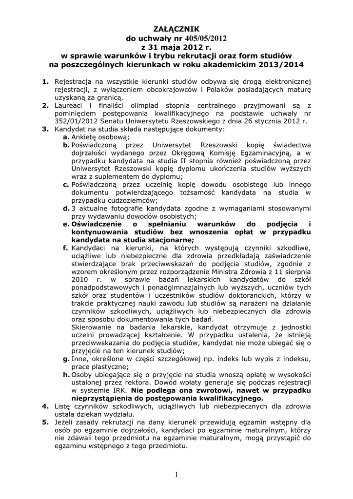 ZAŁĄCZNIK do uchwały nr 405/05/2012 z 31 maja 2012 r. w sprawie warunków i trybu rekrutacji oraz form studiów na poszczególnych kierunkach w roku akademickim 2013/2014 1. Rejestracja na wszystkie kierunki studiów odbywa się drogą elektronicznej rejestracji, z wyłączeniem obcokrajowców i Polaków posiadających maturę uzyskaną za granicą. 2. Laureaci i finaliści olimpiad stopnia centralnego przyjmowani są z pominięciem postępowania kwalifikacyjnego na podstawie uchwały nr 352/01/2012 Senatu Uniwersytetu Rzeszowskiego z dnia 26 stycznia 2012 r. 3. Kandydat na studia składa następujące dokumenty: a. Ankietę osobową; b. Poświadczoną przez Uniwersytet Rzeszowski kopię świadectwa dojrzałości wydanego przez Okręgową Komisję Egzaminacyjną, a w przypadku kandydata na studia II stopnia również poświadczoną przez Uniwersytet Rzeszowski kopię dyplomu ukończenia studiów wyższych wraz z suplementem do dyplomu; c. Poświadczoną przez uczelnię kopię dowodu osobistego lub innego dokumentu potwierdzającego tożsamość kandydata na studia w przypadku cudzoziemców; d. 3 aktualne fotografie kandydata zgodne z wymaganiami stosowanymi przy wydawaniu dowodów osobistych; e. Oświadczenie o spełnianiu warunków do podjęcia i kontynuowania studiów bez wnoszenia opłat w przypadku kandydata na studia stacjonarne; f. Kandydaci na kierunki, na których występują czynniki szkodliwe, uciążliwe lub niebezpieczne dla zdrowia przedkładają zaświadczenie stwierdzające brak przeciwwskazań do podjęcia studiów, zgodnie z wzorem określonym przez rozporządzenie Ministra Zdrowia z 11 sierpnia 2010 r. w sprawie badań lekarskich kandydatów do szkół ponadpodstawowych i ponadgimnazjalnych lub wyższych, uczniów tych szkół oraz studentów i uczestników studiów doktoranckich, którzy w trakcie praktycznej nauki zawodu lub studiów są narażeni na działanie czynników szkodliwych, uciążliwych lub niebezpiecznych dla zdrowia oraz sposobu dokumentowania tych badań. Skierowanie na badania lekarskie, kandydat otrzymuje z jednostki uczelni prowadzącej kształcenie. W przypadku ustalenia, że istnieją przeciwwskazania do podjęcia studiów, kandydat nie może ubiegać się o przyjęcie na ten kierunek studiów; g. Inne, określone w części szczegółowej np. indeks lub wypis z indeksu, prace plastyczne; h. Osoby ubiegające się o przyjęcie na studia wnoszą opłatę w wysokości ustalonej przez rektora. Dowód wpłaty generuje się podczas rejestracji w systemie IRK. Nie podlega ona zwrotowi, nawet w przypadku nieprzystąpienia do postępowania kwalifikacyjnego. 4. Listę czynników szkodliwych, uciążliwych lub niebezpiecznych dla zdrowia ustala dziekan wydziału. 5. Jeżeli zasady rekrutacji na dany kierunek przewidują egzamin wstępny dla osób po egzaminie dojrzałości, kandydaci po egzaminie maturalnym, którzy nie zdawali tego przedmiotu na egzaminie maturalnym, mogą przystąpić do egzaminu wstępnego z tego przedmiotu. 1 6. W przypadku studiów II stopnia, gdzie jako kryterium brana jest pod uwagę ocena z zaliczenia, zapisowi „zal” przypisuję się wartość oceny dostatecznej. 7. Dla kandydatów posiadających świadectwo dojrzałości uzyskane za granicą mogą być przeprowadzane dodatkowe egzaminy wstępne. 8. Obywatele polscy, posiadający świadectwo dojrzałości uzyskane za granicą, powinni dołączyć zaświadczenie o nostryfikacji, które jest ważne z oryginałem świadectwa uzyskanego za granicą. Świadectwo dojrzałości powinno być przetłumaczone przez tłumacza przysięgłego. W przypadku uzyskania dyplomu ukończenia studiów wyższych I stopnia za granicą, kandydata ubiegającego się o przyjęcie na studia II stopnia obowiązuje również obowiązek nostryfikacji wg odrębnych przepisów. 9. Obywatele polscy, którzy nie mają możliwości złożenia świadectwa dojrzałości w ustalonym terminie z powodu zdawania egzaminu maturalnego za granicą w późniejszym terminie, zobowiązani są dostarczyć je nie później niż na 14 dni przed rozpoczęciem roku akademickiego. Niespełnienie tego warunku spowoduje skreślenie ich z listy osób przyjętych na studia. Warunkiem dopuszczenia tej grupy kandydatów do postępowania rekrutacyjnego jest przedłożenie stosownego zaświadczenia. To samo dotyczy kandydatów zdających maturę międzynarodową. 10. Ustala się następujące przeliczanie ocen ze świadectwa dojrzałości kandydatów posiadających Maturę Międzynarodową IB: Exellent – 100 pkt, Very good – 85 pkt, Good – 70 pkt, Satisfactory – 50 pkt, Mediocre – 30 pkt. 11. Maturzysta zdający maturę dwujęzyczną z języka obcego nie przystępuje do części podstawowej, zatem uznaje się, że jest zwolniony z tego poziomu egzaminu, czyli przyznaje się maksymalną liczbę 100% punktów. Do przeliczenia wyniku egzaminu zdanego na poziomie dwujęzycznym za wynik egzaminu na poziomie rozszerzonym przyjmuje się, że 30% punktów z matury jest równoważne 40% z matury na poziomie rozszerzonym. 12. Zasady przyjmowania na studia cudzoziemców nie będących obywatelami państw-członków Unii Europejskiej regulują odrębne przepisy. 13. Limit miejsc na poszczególne kierunki ustala Rektor na podstawie propozycji Dziekana Wydziału, z wyjątkiem Wydziału Medycznego, na którym limity miejsc ustala Minister Zdrowia. Na I rok studiów są przyjmowane osoby, które pozytywnie zaliczyły postępowanie kwalifikacyjne, wg zasad określonych w części szczegółowej uchwały Senatu, do wyczerpania limitu miejsc. 14. Termin składania dokumentów na studia ustala Rektor. 15. Dokumenty kandydatów przyjmują komisje rekrutacyjne. 16. Postępowania kwalifikacyjne na I rok studiów przeprowadzają komisje rekrutacyjne w terminach zatwierdzonych przez Rektora. Szczegółowe obowiązki Komisji Rekrutacyjnych określa zarządzenie Rektora. 17. Prace pisemne kandydata poprawiają dwaj egzaminatorzy – specjaliści z daneg