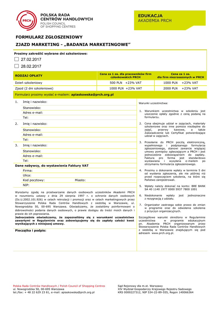 FORMULARZ ZGŁOSZENIOWY ZJAZD MARKETING - „BADANIA MARKETINGOWE” Prosimy zakreślić wybrane dni szkoleniowe: 27.02.2017 28.02.2017 Cena za 1 os. dla pracowników firm członkowskich PRCH RODZAJ OPŁATY Cena za 1 os. dla firm niezrzeszonych w PRCH Dzień szkoleniowy 500 PLN +23% VAT 1000 PLN +23% VAT Zjazd (2 dni szkoleniowe) 1000 PLN +23% VAT 2000 PLN +23% VAT Formularz prosimy wysłać e-mailem: [email protected] 1. Imię i nazwisko: Warunki uczestnictwa: Stanowisko: Adres e-mail: 1. Warunkiem uczestnictwa w szkoleniu jest uiszczenie opłaty zgodnie z ceną podaną na formularzu. 2. Cena obejmuje udział w zajęciach, materiały szkoleniowe oraz inne pomoce niezbędne do zajęć, przerwy kawowe, a także Zaświadczenie lub Certyfikat potwierdzające udział w zajęciach. 3. Przesłanie do PRCH pocztą elektroniczną, wypełnionego i podpisanego formularza zgłoszeniowego, stanowi zawarcie wiążącej umowy pomiędzy zgłaszającym a PRCH i jest jednocześnie zobowiązaniem do zapłaty. Faktura pro forma jest standardowo wystawiana i wysyłana e-mailem po otrzymaniu formularza zgłoszeniowego. 4. Prosimy o dokonanie wpłaty w terminie 5 dni od wysłania zgłoszenia, ale nie później niż przed rozpoczęciem szkolenia, na które się Państwo zarejestrowali. 5. Wpłaty należy dokonać na konto: BRE BANK SA 40 1140 1977 0000 5937 7800 1001 6. Niedokonanie wpłaty z rezygnacją z udziału. 7. Organizator zastrzega sobie prawo do zmian w programie oraz do odwołania szkolenia z przyczyn organizacyjnych. Tel: 2. Imię i nazwisko: Stanowisko: Adres e-mail: Tel: 3. Imię i nazwisko: Stanowisko: Adres e-mail: Tel: Dane nabywcy, do wystawienia Faktury VAT Firma: Ulica: Kod pocztowy: Miasto: NIP: Wyrażamy zgodę na przetwarzanie danych osobowych uczestników Akademii PRCH w rozumieniu ustawy z dnia 29 sierpnia 1997 r. o ochronie danych osobowych (Dz.U.2002.101.926) w celach rekrutacji i promocji oraz w celach marketingowych przez Stowarzyszenie Polska Rada Centrów Handlowych z siedzibą w Warszawie, ul. Nowogrodzka 50, 00-695 Warszawa. Oświadczamy, że zostaliśmy poinformowani o dobrowolności podania danych osobowych, o prawie dostępu do treści moich danych i prawie do ich poprawiania. Jednocześnie oświadczamy, że zapoznaliśmy się z warunkami uczestnictwa zawartymi w Regulaminie oraz zobowiązujemy się do zapłaty całości kwot wynikających z niniejszej umowy. Pieczątka i podpis: Polska Rada Centrów Handlowych / Polish Council of Shopping Centres ul. Nowogrodzka 50, 00-695 Warszawa tel./fax: + 48 22 629 23 81, e-mail: [email protected] jest jednoznaczne Szczegółowe warunki określono w Regulaminie uczestnictwa w programie edukacyjnym pn. Akademia PRCH organizowanym przez Stowarzyszenie Polska Rada Centrów Handlowych z siedzibą w Warszawie znajdującym się pod adresem www.prch.org.pl. Sąd Rejonowy dla m.st. Warszawy XIV Wydział Gospodarczy Krajowego Rejestru Sadowego KRS 0000227312, NIP 534-22-89-555, Regon 140066364