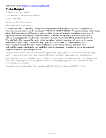 Adres URL strony http://www.emiasto.org/260485 Moto-Rozpęd Koluszki, 97-221, woj. łódzkie Ulica: Klonowa 42 Nowe Chrusty Rokiciny Telefon: 790359601 Strona www: http://rozped.com.pl Email: [email protected] O firmie Firma MOTO-ROZPĘD jest dynamiczną oraz prężnie rozwijającą się firmą. Zajmujemy się: Sprzedażą maszyn budowlanych i rolniczych - NOWYCH i UŻYWANYCH Wynajmem sprzętu budowlanego długo i krótkoterminowym Usługami w zakresie robót ziemnych Sprzedażą samochodów oraz nowych oryginalnych części zamiennych i używanych marki FORD W naszej ofercie maszyn budowlanych i rolniczych znajdą państwo: Ładowarki Teleskopowe Koparko-Ładowarki Minikoparki Miniładowarki Wozidła Walce Zagęszczarki W swojej ofercie posiadamy również szeroki wybór osprzętu do maszyn budowlanych: łyżki, młoty, zamiatarki, pługi, pomosty (kosze) robocze. Dostosowujemy się do indywidualnych potrzeb Klientów. Maszyny przez nas oferowane są starannie dobierane przez wykwalifikowanych mechaników pod względem stanu technicznego i wizualnego, co pozwala uniknąć kłopotów w późniejszym jej użytkowaniu. Kategorie: Budownictwo Koluszki, Budowlane maszyny, sprzęt - kupno, sprzedaż Koluszki, Budowlane maszyny, sprzęt - wynajem Koluszki, Motoryzacja i transport Koluszki, Samochody - części, akcesoria - detal Koluszki Słowa kluczowe: maszyny budowlane, maszyny rolnicze, wynajem sprzętu budowlanego, części samochodowe, ford, części nowe, części używane, wykopy, sprzedaż maszyn, sklep motoryzacyjny, auto, części, osprzęt do maszyn budowlanych, wypożyczalnia Numer ID: 260485, liczba odsłon: 219, aktywacja: 04/07/2011 12:38:45, edycja: 04/07/2011 12:56:20 Strona 1 / 1