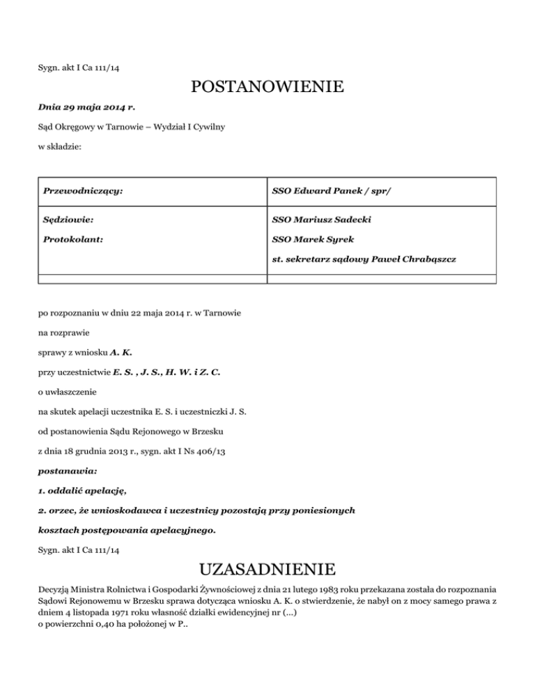 Sygn. akt I Ca 111/14 POSTANOWIENIE Dnia 29 maja 2014 r. Sąd Okręgowy w Tarnowie – Wydział I Cywilny w składzie: Przewodniczący: SSO Edward Panek / spr/ Sędziowie: SSO Mariusz Sadecki Protokolant: SSO Marek Syrek st. sekretarz sądowy Paweł Chrabąszcz po rozpoznaniu w dniu 22 maja 2014 r. w Tarnowie na rozprawie sprawy z wniosku A. K. przy uczestnictwie E. S. , J. S., H. W. i Z. C. o uwłaszczenie na skutek apelacji uczestnika E. S. i uczestniczki J. S. od postanowienia Sądu Rejonowego w Brzesku z dnia 18 grudnia 2013 r., sygn. akt I Ns 406/13 postanawia: 1. oddalić apelację, 2. orzec, że wnioskodawca i uczestnicy pozostają przy poniesionych kosztach postępowania apelacyjnego. Sygn. akt I Ca 111/14 UZASADNIENIE Decyzją Ministra Rolnictwa i Gospodarki Żywnościowej z dnia 21 lutego 1983 roku przekazana została do rozpoznania Sądowi Rejonowemu w Brzesku sprawa dotycząca wniosku A. K. o stwierdzenie, że nabył on z mocy samego prawa z dniem 4 listopada 1971 roku własność działki ewidencyjnej nr (...) o powierzchni 0,40 ha położonej w P.. Wnioskodawca A. K. przedmiotowy wniosek ostatecznie podtrzymał w postępowaniu sądowym i zaprzeczył jakoby uczestnicy E. i J. S. byli samoistnymi posiadaczami wymienionej działki na datę istotną do nabycia prawa własności nieruchomości w trybie ustawy z dnia 26 października 1971 roku . Uczestnicy : E. S. i J. S. - działający także jako pełnomocnicy Z. C. - wnieśli o oddalenie przedmiotowego wniosku oraz o stwierdzenie , że to oni z dniem 4 listopada 1971 roku – z mocy samego prawa - nabyli na prawach małżeńskiej wspólności ustawowej własność działki ewidencyjnej nr (...) o powierzchni 0,40 ha w P.. Na uzasadnienie swojego stanowiska uczestnicy podali , iż w dniu 4 listopada 1971 roku władali przedmiotową działką jak właściciele . Pod koniec lat sześćdziesiątych ubiegłego stulecia darowali im bowiem przedmiotową działkę W. i. R. C., nie zachowując wówczas prawem przewidzianej formy dla dokonania czynności. Następnie darowizna ta została potwierdzona aktem notarialnym z dnia 12 maja 1978 roku . Na rozprawie w dniu 6 listopada 2013 roku uczestniczka H. W. poparła wniosek A. K.. Sąd Rejonowy w Brzesku postanowieniem z dnia 18 grudnia 2013 roku ( sygn. akt I Ns 406/13 ) - w punkcie I – stwierdził, że A. K. s. M. i K. nabył z mocy samego prawa z dniem 4 listopada 1971 roku własność działki ewidencyjnej nr (...) w P. o powierzchni 0,40 ha , która powstała z parcel gruntowych : (...)objętych w przeszłości Lwh (...) P., a obecnie objętej KW (...). W punkcie II Sąd Rejonowy orzekł, że wnioskodawca i uczestnicy ponoszą koszty postępowania związane ze swym udziałem w sprawie. Rozstrzygnięcie Sądu Rejonowego poprzedziły następujące ustalenia faktyczne: Działka ewidencyjna nr (...) w P. o powierzchni 0,40 ha powstała z parcel gruntowych : (...)objętych zaginionym Lwh (...) P.. Działka zabudowana jest budynkiem mieszkalnym i gospodarczym od strony drogi, a w pozostałej części użytkowana jest jako grunt rolny. W. C. nie budował tego domu sam, lecz wspólnie z A. K. i jego żoną. Ten dom był budowany za pieniądze, które przysłała rodzina z USA, a przede wszystkim M. L.. Wtedy kiedy ten dom był budowany było wiadomym, że W. C. pojedzie do USA. Dom został wybudowany w surowym stanie w 1959 roku . Przed wybudowaniem domu ta działka była gruntem rolnym w użytkowaniu A. K. od 1947 roku , kiedy to ożenił się z żoną S. K.. Przedmiotowa działka w przeszłości należała do ojca S. K. - F. C.. Pozostałe rodzeństwo S. K. zgodziło się , aby działkę użytkował wnioskodawca i jego żona. Od 1947 roku A. K. uważał się za właściciela tej działki. W. C. uzgodnił z A. K. , że ten dom będzie budowany właśnie na działce, którą on użytkował. W. C. wyjechał do USA w 1961 roku. Przed wyjazdem W. C. mieszkał w tym domu około pół roku. A. K. uzgodnił z W. C., że jak on pojedzie do USA, to ten dom będzie dla niego i jego żony. Wyjeżdżając do USA klucze do domu pozostawił A. K.. W momencie wyjazdu tylko jeden pokój nadawał się do zamieszkania. Przez okres około pół roku dom stał pusty, później wnioskodawca zaczął go używać, mieszkał w nim sporadycznie. Mieszkały tam również jego dzieci. Na stałe w tym domu zamieszkała córka H. W.. Przed H. W. mieszkała tam jeszcze siostra wnioskodawcy - S. K. , około pół roku wcześniej, tj. od 1974 roku do jej śmierci w 1998 roku . Wnioskodawca dał siostrze S. klucze do tego domu. Wnioskodawca uważał się za właściciela tej działki od 1947 roku do momentu przekazania tej działki córce H. W.. Żona wnioskodawcy zmarła w 1959 roku . Część tej działki poza budynkiem była wykorzystywana rolniczo. Wnioskodawca decydował o sposobie jej uprawy i opłacał podatek od tej działki. Gdy W. C. budował dom , to wnioskodawca mu pomagał, woził żwir, dawał również pieniądze. F. C. zmarł w dniu 19 sierpnia 1945 roku , a spadek po nim nabyły dzieci: M. L., Z. B., R. C., J. C., S. C. (1), S. C. (2), W. C. - wszyscy po 1/7 części. W. C. zmarł w dniu 30 grudnia 1974 roku . Posiadał on polskie obywatelstwo. Aktem notarialnym z dnia 12 maja 1979 roku sporządzonym w USA R. C., G. K. i Z. C. darowali E. S. i J. S. parcele gruntowe : (...)w P.. Powyższy stan faktyczny Sąd Rejonowy ustalił na podstawie dokumentów, zeznań świadków i stron. Dokonując oceny jurydycznej żądania Sąd Rejonowy wskazał, iż zgodnie z art. 1 ust.1 ustawy z dnia 26 października 1971 roku o uregulowaniu własności gospodarstw rolnych , nieruchomości wchodzące w skład gospodarstw rolnych znajdujące się w dniu wejścia w życie ustawy, tj. w dniu 4 listopada 1971 roku w samoistnym posiadaniu rolników stają się z mocy samego prawa własnością rolników, jeżeli oni sami lub ich poprzednicy objęli te nieruchomości w posiadanie na podstawie zawartej bez prawem przewidzianej form