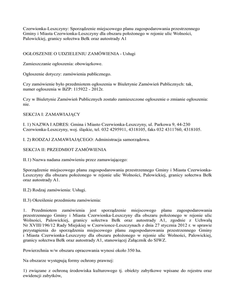 Czerwionka-Leszczyny: Sporządzenie miejscowego planu zagospodarowania przestrzennego Gminy i Miasta Czerwionka-Leszczyny dla obszaru położonego w rejonie ulic Wolności, Palowickiej, granicy sołectwa Bełk oraz autostrady A1 OGŁOSZENIE O UDZIELENIU ZAMÓWIENIA - Usługi Zamieszczanie ogłoszenia: obowiązkowe. Ogłoszenie dotyczy: zamówienia publicznego. Czy zamówienie było przedmiotem ogłoszenia w Biuletynie Zamówień Publicznych: tak, numer ogłoszenia w BZP: 115922 - 2012r. Czy w Biuletynie Zamówień Publicznych zostało zamieszczone ogłoszenie o zmianie ogłoszenia: nie. SEKCJA I: ZAMAWIAJĄCY I. 1) NAZWA I ADRES: Gmina i Miasto Czerwionka-Leszczyny, ul. Parkowa 9, 44-230 Czerwionka-Leszczyny, woj. śląskie, tel. 032 4295911, 4318105, faks 032 4311760, 4318105. I. 2) RODZAJ ZAMAWIAJĄCEGO: Administracja samorządowa. SEKCJA II: PRZEDMIOT ZAMÓWIENIA II.1) Nazwa nadana zamówieniu przez zamawiającego: Sporządzenie miejscowego planu zagospodarowania przestrzennego Gminy i Miasta CzerwionkaLeszczyny dla obszaru położonego w rejonie ulic Wolności, Palowickiej, granicy sołectwa Bełk oraz autostrady A1. II.2) Rodzaj zamówienia: Usługi. II.3) Określenie przedmiotu zamówienia: 1. Przedmiotem zamówienia jest sporządzenie miejscowego planu zagospodarowania przestrzennego Gminy i Miasta Czerwionka-Leszczyny dla obszaru położonego w rejonie ulic Wolności, Palowickiej, granicy sołectwa Bełk oraz autostrady A1, zgodnie z Uchwałą Nr XVIII/196/12 Rady Miejskiej w Czerwionce-Leszczynach z dnia 27 stycznia 2012 r. w sprawie przystąpienia do sporządzenia miejscowego planu zagospodarowania przestrzennego Gminy i Miasta Czerwionka-Leszczyny dla obszaru położonego w rejonie ulic Wolności, Palowickiej, granicy sołectwa Bełk oraz autostrady A1, stanowiącej Załącznik do SIWZ. Powierzchnia w/w obszaru opracowania wynosi około 350 ha. Na obszarze występują formy ochrony prawnej: 1) związane z ochroną środowiska kulturowego tj. obiekty zabytkowe wpisane do rejestru oraz ewidencji zabytków, 2) związane z ochroną środowiska przyrodniczego tj.: a) obszar ochronny zbiornika wód podziemnych, b) Park Krajobrazowy Cysterskie Kompozycje Krajobrazowe Rud Wielkich. 2. Zakres przedmiotu zamówienia obejmuje: 1) sporządzenie tekstu i rysunku projektu miejscowego planu zagospodarowania przestrzennego, o którym mowa w pkt 1, zgodnie z obowiązującą ustawą z dnia 27 marca 2003 r. o planowaniu i zagospodarowaniu przestrzennym (Dz.U. Nr 80, poz. 717 z późn. zm.) w zakresie określonym w rozporządzeniu Ministra Infrastruktury z dnia 26 sierpnia 2003 r. w sprawie wymaganego zakresu projektu miejscowego planu zagospodarowania przestrzennego (Dz.U. Nr 164, poz. 1587), oraz zgodnie z przepisami innych ustaw związanych z problematyką planowania przestrzennego, 2) opracowanie prognozy oddziaływania na środowisko spełniającej wymagania określone w ustawie z dnia 3 października 2008 r. o udostępnianiu informacji o środowisku i jego ochronie, udziale społeczeństwa w ochronie środowiska oraz o ocenach oddziaływania na środowisko (Dz.U. Nr 199, poz. 1227 z późn. zm.) wraz z pisemną informacją, w jaki sposób i w jakim zakresie zostały uwzględnione w projekcie planu ustalenia zawarte w prognozie oddziaływania na środowisko, 3) sporządzenie prognozy skutków finansowych uchwalenia planu, uwzględniającej wymagania rozporządzenia Ministra Infrastruktury z dnia 26 sierpnia 2003 r. w sprawie wymaganego zakresu projektu miejscowego planu zagospodarowania przestrzennego (Dz.U. Nr 164, poz. 1587), 4) przygotowanie wymaganych przepisami zawiadomień, pism, ogłoszeń, obwieszczeń, wykazów, zestawień, wystąpień, uchwał niezbędnych do wykonania czynności określonych w art. 17 ustawy o planowaniu i zagospodarowaniu przestrzennym, 5) wykonanie inwentaryzacji urbanistycznej wraz z niezbędną dokumentacją fotograficzną - prace terenowe (wizja terenowa zainwestowania i uzbrojenia terenu oraz elementów przyrodniczych), 6) kompletowanie dokumentacji formalno-prawnej w ciągu całego okresu sporządzania projektu planu, 7) skoordynowanie ustaleń projektu planu w rejonie granic jego opracowania z zapisami obowiązujących planów sąsiednich, 8) opracowanie rysunku projektu miejscowego planu zagospodarowania przestrzennego w wersji elektronicznej w formacie .DAT, .MAP .TAB, .ID lub .WOR lub .SHP lub równoważnych, na nośnikach cyfrowych oraz doprowadzenie do jego poprawnego działania na sprzęcie i oprogramowaniu będącym w posiadaniu Zamawiającego. Prace projektowe powinny być zarejestrowane w układzie współrzędnych 2000, 9) opracowanie rysunku projektu miejscowego planu zagospodarowania przestrzennego w wersji papierowej, usztywniony i zalaminowany w skali 1:2000, 10) wprowadzenie projektu planu do Edytora Aktów Prawnych. 3. Przedmiot zamówienia wykonany zostanie etapami, stanowiącymi przedmiot odrębnych odbiorów, zgodnie z terminami ich realizacji określonymi w Harmonogramie rzeczowofinansowym stanowiącym Załącznik Nr 8 do SIWZ. 4. Wykonawca odpowiedzialny będzie za pozytywne uzgodnienie projektów przez właściwe organy, w zakresie wynikającym z rzetelności realizacji przedmiotu zamówienia. Wymaga się również aby wykonawca wprowadzał wymagane zmiany do projektów, brał udział w dyskusjach publicznych, analizował uwagi. 5. Wykonawca ponosi odpowiedzialność za prawidłowość procedury i wymaganych uzgodnień a także za kompletność uwzględnienia w projekcie planu wymogów, wymagań, walorów i potrzeb określonych w art.1 ust. 2 ustawy o planowaniu i zagospodarowaniu przestrzennym. II.4) Wspólny Słownik Zamówień (CPV): 71.41.00.00-5. SEKCJA III: PROCEDURA III.1) TRYB UDZIELENIA ZAMÓWIENIA: Przetarg nieograniczony III.2) INFORMACJE ADMINISTRACYJNE • Zamówienie dotyczy projektu/programu finansowanego ze środków Unii Europejskiej: nie SEKCJA IV: UDZIELENIE ZAMÓWIENIA IV.1) DATA UDZIELENIA ZAMÓWIENIA: 18.05.2012.