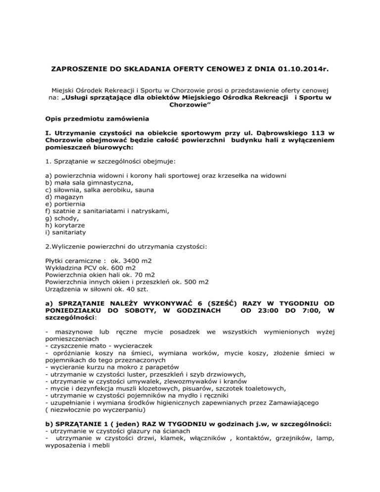 ZAPROSZENIE DO SKŁADANIA OFERTY CENOWEJ Z DNIA 01.10.2014r. Miejski Ośrodek Rekreacji i Sportu w Chorzowie prosi o przedstawienie oferty cenowej na: „Usługi sprzątające dla obiektów Miejskiego Ośrodka Rekreacji i Sportu w Chorzowie” Opis przedmiotu zamówienia I. Utrzymanie czystości na obiekcie sportowym przy ul. Dąbrowskiego 113 w Chorzowie obejmować będzie całość powierzchni budynku hali z wyłączeniem pomieszczeń biurowych: 1. Sprzątanie w szczególności obejmuje: a) powierzchnia widowni i korony hali sportowej oraz krzesełka na widowni b) mała sala gimnastyczna, c) siłownia, salka aerobiku, sauna d) magazyn e) portiernia f) szatnie z sanitariatami i natryskami, g) schody, h) korytarze i) sanitariaty 2.Wyliczenie powierzchni do utrzymania czystości: Płytki ceramiczne : ok. 3400 m2 Wykładzina PCV ok. 600 m2 Powierzchnia okien hali ok. 70 m2 Powierzchnia innych okien i przeszkleń ok. 500 m2 Urządzenia w siłowni ok. 40 szt. a) SPRZĄTANIE NALEŻY WYKONYWAĆ 6 (SZEŚĆ) RAZY W TYGODNIU OD PONIEDZIAŁKU DO SOBOTY, W GODZINACH OD 23:00 DO 7:00, W szczególności: - maszynowe lub ręczne mycie posadzek we wszystkich wymienionych wyżej pomieszczeniach - czyszczenie mato - wycieraczek - opróżnianie koszy na śmieci, wymiana worków, mycie koszy, złożenie śmieci w pojemnikach do tego przeznaczonych - wycieranie kurzu na mokro z parapetów - utrzymanie w czystości luster, przeszkleń i szyb drzwiowych, - utrzymanie w czystości umywalek, zlewozmywaków i kranów - mycie i dezynfekcja muszli klozetowych, pisuarów, szczotek toaletowych, - utrzymanie w czystości pojemników na mydło i ręczniki - uzupełnianie i wymiana środków higienicznych zapewnianych przez Zamawiającego ( niezwłocznie po wyczerpaniu) b) SPRZĄTANIE 1 ( jeden) RAZ W TYGODNIU w godzinach j.w, w szczególności: - utrzymanie w czystości glazury na ścianach - utrzymanie w czystości drzwi, klamek, włączników , kontaktów, grzejników, lamp, wyposażenia i mebli - usuwanie pajęczyn - wycieranie i mycie balustrad i poręczy c) SPRZĄTANIE 1 (jeden) RAZ NA KWARTAŁ w szczególności: - mycie okien otwieranych dwustronnie ( termin uzgodnić z Zamawiającym) d) SPRZĄTANIE 2 (DWA) RAZY W ROKU ( WIOSNA, JESIEŃ) w szczególności: - mycie okien hali oraz salki gimnastycznej – raz do roku ( termin uzgodnić z Zamawiającym) II. Utrzymanie czystości na obiekcie sportowym „Hajduki” przy ul. Granicznej 92 w Chorzowie obejmować będzie całość powierzchni budynku hali z wyłączeniem pomieszczeń biurowych i basenu: 1. Sprzątanie w szczególności obejmuje: a) powierzchnia widowni i korony hali sportowej oraz krzesełka na widowni b) salka aerobiku, c) szatnie z sanitariatami i natryskami, d) sanitariaty e) schody, f) korytarze g) salka konferencyjna 2. Wyliczenie powierzchni do utrzymania czystości: Płytki ceramiczne ok. 880 m2 Wykładzina PCV ok. 80 m2 Powierzchnia okien i przeszkleń ok. 700 m2 a) SPRZĄTANIE NALEŻY WYKONYWAĆ 6 ( SZEŚĆ) RAZY W TYGODNIU OD PONIEDZIAŁKU DO SOBOTY- SPRZĄTANIE NA ZMIANY: I ZMIANA W GODZINACH OD 14:00 – 20:00 ( MIN. 1 OSOBA) II ZMIANA W GODZINACH OD 23:00 – 5:00 ( MIN. 1 OSOBA) w szczególności: - maszynowe lub ręczne mycie posadzek w wszystkich wymienionych wyżej pomieszczeniach - czyszczenie mato - wycieraczek - opróżnianie koszy na śmieci, wymiana worków mycie koszy, złożenie śmieci w pojemnikach do tego przeznaczonych - wycieranie na mokro kurzu z parapetów - utrzymanie w czystości luster, przeszkleń i szyb drzwiowych - utrzymanie w czystości umywalek, zlewozmywaków i kranów - mycie i dezynfekcja muszli klozetowych, pisuarów, szczotek toaletowych, - utrzymanie w czystości pojemników na mydło i ręczniki - uzupełnianie i wymiana środków higienicznych zapewnianych przez Zamawiającego (niezwłocznie po wyczerpaniu) b) SPRZĄTANIE 1 ( jeden) RAZ W TYGODNIU w szczególności: - utrzymanie w czystości glazury na ścianach - utrzymanie w czystości drzwi, klamek, włączników , kontaktów, grzejników, lamp, wyposażenia i mebli - usuwanie pajęczyn - wycieranie i mycie balustrad i poręczy c) SPRZĄTANIE 1 (jeden) RAZ NA KWARTAŁ w szczególności: – mycie okien ( terminy uzgodnić z Zamawiającym) – 3. Inne uwarunkowania a) Zamawiający wymaga od Wykonawcy odpowiednich ilości osób sprzątających. Podyktowane jest to wielkością obiektów oraz doświadczeniem Zamawiającego przy nadzorowaniu prac, a mianowicie: - obiekt przy ul. Dąbrowskiego 113 – minimum 4 osoby ( ZMIANA NOCNA) - obiekt przy ul. Granicznej 92 – minimum 2 osoby ( 2 ZMIANY: POPOŁUDNIOWA/ NOCNA, na każdej zmianie po min. 1 osobie) b) Zamawiający zaleca przeprowadzenie wizji lokalnej. c) UWAGA: Wykonawca zobowiązany jest uwzględnić prace na wysokości – mycie okien hali oraz salki gimnastycznej d) Do wykonywania niniejszej usługi Wykonawca będzie używał własnych urządzeń przeznaczonych do odpowiedniego rodzaju prac w tym: odkurzaczy (na sucho i mokro), urządzeń zamiatających, myjących, szorujących, polerujących, dwu komorowe wiadra, czyste mopy, czyste ścierki itp e) Zamawiający zapewnia środki potrzebne do utrzymania czystości. Zamawiający zapewnia bezpłatny dostęp do mediów oraz pomieszczeń gospodarczych. f) natychmiastowa reakcja na niedociągnięcia III. Termin wykonania zamówienia. Wykonawca będzie realizował zamówienie przez okres 12 miesięcy od dnia podpisania umowy tj. w terminie od 01.01.2015r. do 31.12.2015r. Osoby do kontaktu : kierownik obiektów Mariusz Schmidt tel. 693-458-271 lub 32/ 2417-050 wew. 50 Termin składania ofert : do dnia 07.10.2014r. Ofertę zaleca się złożyć na załączonym formularzu. Miejsce składania ofert: Miejski Ośrodek Rekreacji i Sportu, ul. Dąbrowskiego 113, 41500 Chorzów. tel. kontaktowy 32/2417-050 fax. wew. 46. Pokój 335 sekretariat. lub na adres [email protected] …………………………………………… pieczęć firmowa wykonawcy FORMULARZ O