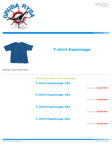 KingSize Sp. z o.o. Dymińska 6A/101 Warszawa T-shirt Espionage Espionage - Duża koszulka męska Warianty produktu T-shirt Espionage : T-shirt Espionage 2XL Cena brutto: 63,00 PLN Cena brutto: 63,00 PLN Cena brutto: 63,00 PLN Cena brutto: 63,00 PLN T-shirt Espionage 3XL T-shirt Espionage 5XL T-shirt Espionage 6XL http://www.grubaryba.eu sklep internetowy KingSize Sp. z o.o. Dymińska 6A/101 Warszawa T-shirt Espionage 7XL Cena brutto: 63,00 PLN Cena brutto: 63,00 PLN T-shirt Espionage 8XL http://www.grubaryba.eu sklep internetowy
