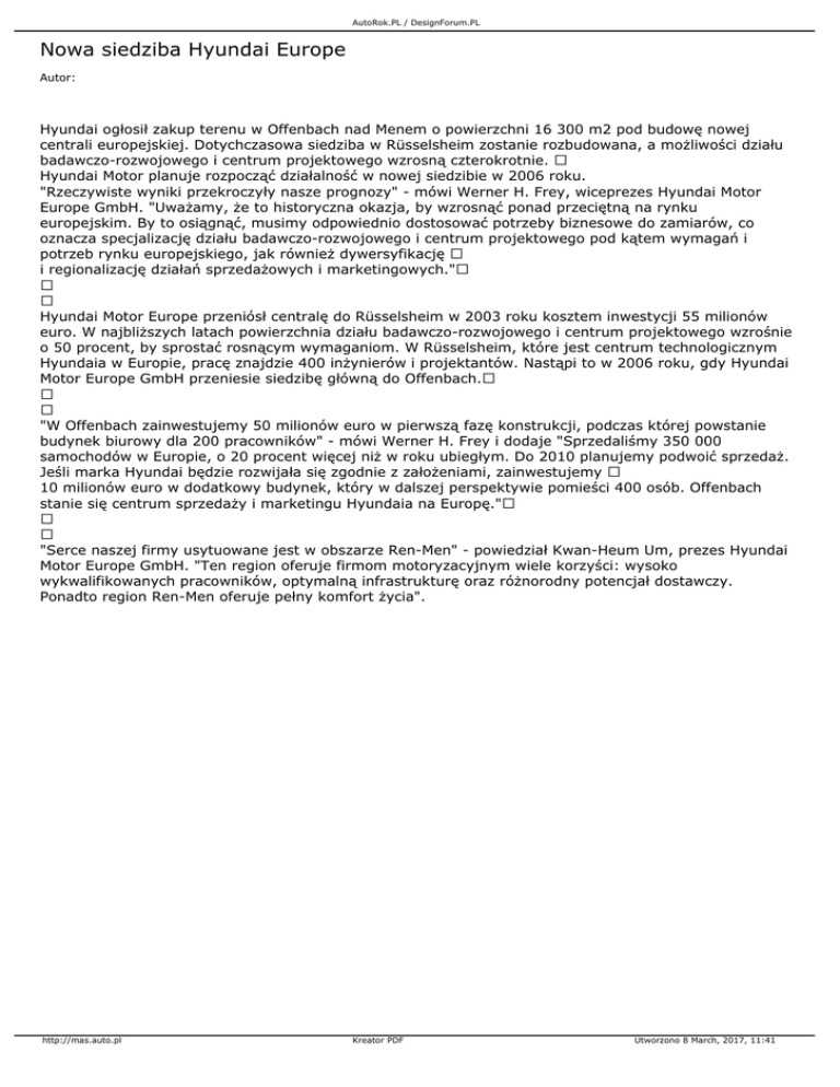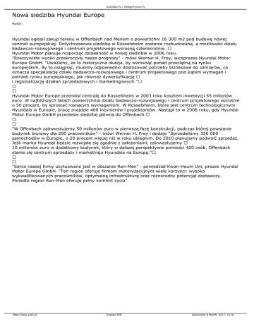 AutoRok.PL / DesignForum.PL Nowa siedziba Hyundai Europe Autor: Hyundai ogłosił zakup terenu w Offenbach nad Menem o powierzchni 16 300 m2 pod budowę nowej centrali europejskiej. Dotychczasowa siedziba w Rüsselsheim zostanie rozbudowana, a możliwości działu badawczo-rozwojowego i centrum projektowego wzrosną czterokrotnie. Hyundai Motor planuje rozpocząć działalność w nowej siedzibie w 2006 roku. "Rzeczywiste wyniki przekroczyły nasze prognozy" - mówi Werner H. Frey, wiceprezes Hyundai Motor Europe GmbH. "Uważamy, że to historyczna okazja, by wzrosnąć ponad przeciętną na rynku europejskim. By to osiągnąć, musimy odpowiednio dostosować potrzeby biznesowe do zamiarów, co oznacza specjalizację działu badawczo-rozwojowego i centrum projektowego pod kątem wymagań i potrzeb rynku europejskiego, jak również dywersyfikację i regionalizację działań sprzedażowych i marketingowych." Hyundai Motor Europe przeniósł centralę do Rüsselsheim w 2003 roku kosztem inwestycji 55 milionów euro. W najbliższych latach powierzchnia działu badawczo-rozwojowego i centrum projektowego wzrośnie o 50 procent, by sprostać rosnącym wymaganiom. W Rüsselsheim, które jest centrum technologicznym Hyundaia w Europie, pracę znajdzie 400 inżynierów i projektantów. Nastąpi to w 2006 roku, gdy Hyundai Motor Europe GmbH przeniesie siedzibę główną do Offenbach. "W Offenbach zainwestujemy 50 milionów euro w pierwszą fazę konstrukcji, podczas której powstanie budynek biurowy dla 200 pracowników" - mówi Werner H. Frey i dodaje "Sprzedaliśmy 350 000 samochodów w Europie, o 20 procent więcej niż w roku ubiegłym. Do 2010 planujemy podwoić sprzedaż. Jeśli marka Hyundai będzie rozwijała się zgodnie z założeniami, zainwestujemy 10 milionów euro w dodatkowy budynek, który w dalszej perspektywie pomieści 400 osób. Offenbach stanie się centrum sprzedaży i marketingu Hyundaia na Europę." "Serce naszej firmy usytuowane jest w obszarze Ren-Men" - powiedział Kwan-Heum Um, prezes Hyundai Motor Europe GmbH. "Ten region oferuje firmom motoryzacyjnym wiele korzyści: wysoko wykwalifikowanych pracowników, optymalną infrastrukturę oraz różnorodny potencjał dostawczy. Ponadto region Ren-Men oferuje pełny komfort życia". http://mas.auto.pl Kreator PDF Utworzono 8 March, 2017, 11:41