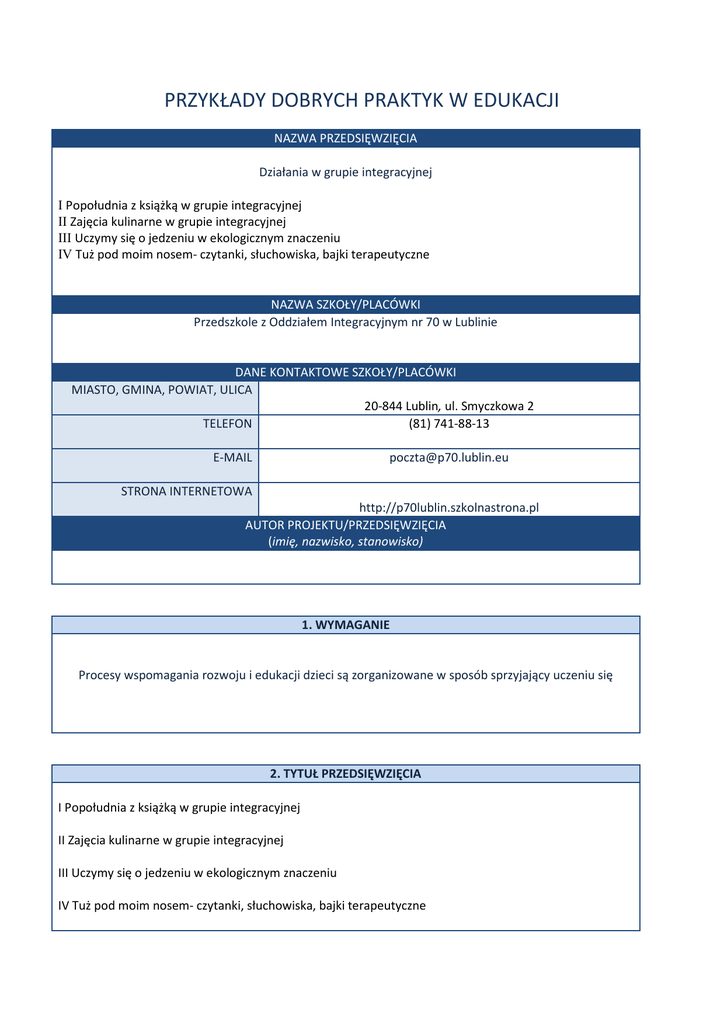 PRZYKŁADY DOBRYCH PRAKTYK W EDUKACJI NAZWA PRZEDSIĘWZIĘCIA Działania w grupie integracyjnej I Popołudnia z książką w grupie integracyjnej II Zajęcia kulinarne w grupie integracyjnej III Uczymy się o jedzeniu w ekologicznym znaczeniu IV Tuż pod moim nosem- czytanki, słuchowiska, bajki terapeutyczne NAZWA SZKOŁY/PLACÓWKI Przedszkole z Oddziałem Integracyjnym nr 70 w Lublinie DANE KONTAKTOWE SZKOŁY/PLACÓWKI MIASTO, GMINA, POWIAT, ULICA 20-844 Lublin, ul. Smyczkowa 2 TELEFON (81) 741-88-13 E-MAIL [email protected] STRONA INTERNETOWA http://p70lublin.szkolnastrona.pl AUTOR PROJEKTU/PRZEDSIĘWZIĘCIA (imię, nazwisko, stanowisko) 1. WYMAGANIE Procesy wspomagania rozwoju i edukacji dzieci są zorganizowane w sposób sprzyjający uczeniu się 2. TYTUŁ PRZEDSIĘWZIĘCIA I Popołudnia z książką w grupie integracyjnej II Zajęcia kulinarne w grupie integracyjnej III Uczymy się o jedzeniu w ekologicznym znaczeniu IV Tuż pod moim nosem- czytanki, słuchowiska, bajki terapeutyczne 1. 2. 3. 1. 2. 3. 4. 3. CEL DZIAŁANIA I Rozwijanie zainteresowania wśród dzieci czytelnictwem. Stymulowanie wyobraźni oraz kompetencji językowych. Ćwiczenia koncentracji uwagi. II Rozwijanie zainteresowań kulinarnych. Poznawanie wielozmysłowe. Budowanie świadomości jak powstają różne potrawy i dania. Kształtowanie umiejętności przygotowania dań i spożywania III 1. 2. 3. 4. Kształtowanie prawidłowych nawyków żywieniowych. Przestrzeganie zbilansowanej diety. Kształtowanie postawy proekologicznej. Budowanie świadomości jakie produkty są ekologiczne. IV 1. Nabywanie przez dzieci umiejętności bycia, zabawy z osobą niepełnosprawną. 2. Nauka akceptacji i tolerancji osób niepełnosprawnych. 3. Uświadamianie, że warto pomagać. 4. Uwrażliwienie na cierpienie i krzywdę innych. 5. Budowanie empatii, zaufania i poczucia własnego miejsca w grupie u dzieci nieśmiałych i niepełnosprawnych. 6. Uświadomienie, że każdy jest inny, ale wszyscy mamy równe szanse. 4. KRÓTKI OPIS DZIAŁANIA I Codziennie po południu odbywa się czytanie książek, które dzieci przynoszą z domu lub wypożyczają z biblioteki. Do czytania włączani są absolwenci przedszkola, rodzice, dziadkowie uczniowie gimnazjum. II Wspólne przygotowanie potraw po wcześniejszym zapoznaniu z przepisem – ciasto śliwkowe, wypiekanie i ozdabianie świątecznych pierników, wspólne przygotowanie pizzy w zaprzyjaźnionej pizzerii, sałatki jarzynowe, sok marchewkowo – jabłkowy, zdrowe kanapki z ekologicznych produktów, poznanie jak produkuje się jogurty, masło, przetwory mleczne. Wspólne z pracownikiem OSM Krasnystaw przygotowanie jogurtów o różnych smakach, przygotowanie własnoręcznie ubitego masła w maselnicy. III Są to warsztaty organizowane przez Akademię Zdrowego Przedszkolaka poświęcone żywności ekologicznej, zdrowej żywności, która ma ogromny wpływ na zdrowie i samopoczucie. Warsztaty poparte były zabawami, doświadczeniami, piosenkami i wierszykami. Dzieci dowiadywały się poprzez zabawy, czym jest Piramida Żywienia Przedszkolaka, samodzielnie ją konstruowały. Poprzez doświadczenia poznawały budowę jajek kurzych, przepiórczych i strusich, samodzielnie doświadczały, jak zmienia się jajko pod wpływem temperatury, dowiadywały się, dlaczego jajka są tak ważne w diecie. Uczestniczyły w licznych zabawach ruchowych, które są nieodzownym elementem w trosce o prawidłowy rozwój psychoruchowy. IV Kilka razy w miesiącu dzieci uczestniczyły w słuchowisku, bądź czytaniu przez nauczyciela opowiadań o tematyce niepełnosprawności. Uczyły się, jak czują, widzą, doświadczają świat ich rówieśnicy z dysfunkcją wzroku, słuchu, ruchu, intelektu. Otrzymywały konkretne wskazówki, jak zachowywać się podczas kontaktu z osobą niepełnosprawną. Wiedzę zdobytą mogły wykorzystać w praktyce, w kontakcie z dziećmi z Przedszkola Specjalnego oraz Ośrodka Szkolno – Wychowawczego. 5. EFEKTY I Dzieci koncentrują się na wysłuchiwanym tekście znacznie dłużej niż przed rozpoczęciem działalności „Popołudnia z książką”. Są zainteresowane wyborem kolejnych pozycji literatury dziecięcej. Słownik mowy czynnej i biernej został wzbogacony. Integracja dzieci podczas zajęć. Życzliwa atmosfera. II Dzieci rozszerzają swój repertuar potraw, które spożywają Wzrasta poczucie wartości i sprawności „potrafię” Dzieci znają zasady zdrowego stylu życia i zdrowego odżywiania. Są otwarte na poznawanie coraz to nowych smaków. Potrafią kulturalnie spożywać i częstować inne dzieci i pracowników przedszkola przygotowanymi potrawami. III Dzieci potrafią wskazać, które produkty są zdrowe, a których należy unikać. Wiedzą, skąd się biorą jaka i potrafią rozpoznać zdrowe jajka wg ekologicznych oznaczeń. Potrafią sprawdzić, które jajko jest nieświeże. Wiedzą, że źródłem witamin są owoce i warzywa. Dzieci degustują różne potrawy. Dzieci świadomie rezygnują ze słodkich przekąsek i chipsów na rzecz zdrowych owoców, warzyw czy owoców suszonych. IV Dzieci wiedzą, jak postępować, by ich koledzy i koleżanki niepełnosprawni czuli się z nimi dobrze. Dzieci mają świadomość, że warto pomagać, a dzieci niepełnosprawne nie są inne, że mają takie same marzenia i pragnienia. Nauczyły się akceptacji i tolerancji. Chętniej opiekują się słabszymi kolegami, czują się za nich odpowiedzialni. Wiedzą, że wszyscy mają równe prawa, nie należy dokuczać dzieciom słabszym, nie należy wyszydzać i szykanować innych. 6. RADY I PRZESTROGI I Należy utrzymywać te same rytuały, które dzieci znają i lubią, pozwala to na utrzymanie ładu i porządku, ciszy i koncentracji. Należy nagradzać dzieci, które w ciszy wysłuchały tekstu. II Sprawdza się przygotowywanie potraw w mniejszych grupach, przy stolikach III Należy zasięgnąć opinii rodziców, czy dzieci nie są uczulone na produkty, owoce (są to infor