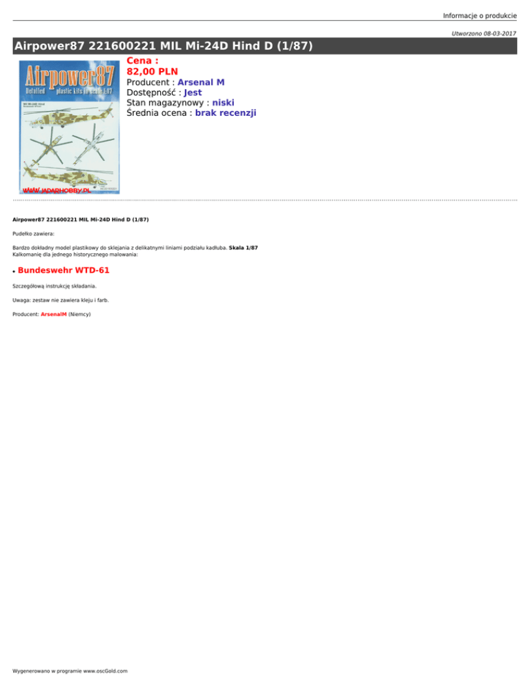 Informacje o produkcie Utworzono 08-03-2017 Airpower87 221600221 MIL Mi-24D Hind D (1/87) Cena : 82,00 PLN Producent : Arsenal M Dostępność : Jest Stan magazynowy : niski Średnia ocena : brak recenzji Airpower87 221600221 MIL Mi-24D Hind D (1/87) Pudełko zawiera: Bardzo dokładny model plastikowy do sklejania z delikatnymi liniami podziału kadłuba. Skala 1/87 Kalkomanię dla jednego historycznego malowania: ● Bundeswehr WTD-61 Szczegółową instrukcję składania. Uwaga: zestaw nie zawiera kleju i farb. Producent: ArsenalM (Niemcy) Wygenerowano w programie www.oscGold.com Polecamy! Ważne informacje: Prosimy o dokładne zapoznanie się z zasadami działania naszego sklepu. To bardzo ważne i pozwoli na uniknięcie nieporozumień związanych z koniecznością oczekiwania na przesyłkę. Wszystkie zamówienia realizujemy w kolejności zgłoszeń. Wybranie "przesyłka priorytetowa" jako sposobu wysyłki nie oznacza, że paczka zostanie wysłana na drugi dzień. To tylko rodzaj usługi pocztowej. Firma Jadar-Model jest właścicielem dwóch sklepów. Jeden z nich to sklep internetowy, drugi zaś jest prawdziwy i mieści się w Warszawie, stolicy Polski. Te same modele i akcesoria oferowane w sklepie internetowym sprzedawane są w jednocześnie w obu sklepach. Ponieważ nasza oferta jest bardzo duża nie mamy magazynu z wielką ilością tych samych przedmiotów. Może zdarzyć się, że model, który chcesz kupić został sprzedany w drugim sklepie. Wtedy zostaniesz powiadomiony emailem, że realizacja Twojego zamówienia będzie dłuższa, ponieważ musimy uzupełnić magazyn i czekamy na dostawę od producenta. Prosimy o cierpliwość i wyrozumiałość. Informacje o produkcie Nie ponosimy odpowiedzialności za różnicę w zawartości pudełka w stosunku do prezentowanego zdjęcia. Zdjęcia są zazwyczaj reklamówkami i mogą zawierać również inne części, które nie wchodzą w skład danego produktu. Salon Modelarski Jadar-Model Ul. Jagiellońska 58, 03-468 Warszawa (przy Pl.Hallera) tel.(22) 403-34-30 (w sprawie zamówień prosimy dzwonić: (22) 620-05-39) Tutaj jesteśmy - kliknij poniższy link: Warszawa, Jagiellońska 58 sklep jest czynny w godz.: pon.-pt. 11.oo 19.oo sobota 10.oo 14.oo Wygenerowano w programie www.oscGold.com