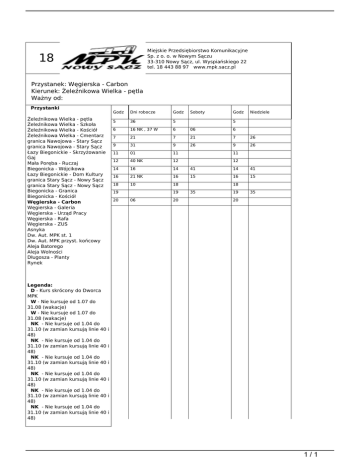 Miejskie Przedsiębiorstwo Komunikacyjne Sp. z o. o. w Nowym Sączu 33-310 Nowy Sącz, ul. Wyspiańskiego 22 tel. 18 443 88 97 www.mpk.sacz.pl 18 Przystanek: Węgierska - Carbon Kierunek: Żeleźnikowa Wielka - pętla Ważny od: Przystanki Żeleźnikowa Wielka - pętla Żeleźnikowa Wielka - Szkoła Żeleźnikowa Wielka - Kościół Żeleźnikowa Wielka - Cmentarz granica Nawojowa - Stary Sącz granica Nawojowa - Stary Sącz Łazy Biegonickie - Skrzyżowanie Gaj Mała Poręba - Ruczaj Biegonicka - Wójcikowa Łazy Biegonickie - Dom Kultury granica Stary Sącz - Nowy Sącz granica Stary Sącz - Nowy Sącz Biegonicka - Granica Biegonicka - Kościół Węgierska - Carbon Węgierska - Galeria Węgierska - Urząd Pracy Węgierska - Rafa Węgierska - ZUS Asnyka Dw. Aut. MPK st. 1 Dw. Aut. MPK przyst. końcowy Aleja Batorego Aleja Wolności Długosza - Planty Rynek Legenda: D - Kurs skrócony do Dworca MPK W - Nie kursuje od 1.07 do 31.08 (wakacje) W - Nie kursuje od 1.07 do 31.08 (wakacje) NK - Nie kursuje od 1.04 do 31.10 (w zamian kursują linie 40 48) NK - Nie kursuje od 1.04 do 31.10 (w zamian kursują linie 40 48) NK - Nie kursuje od 1.04 do 31.10 (w zamian kursują linie 40 48) NK - Nie kursuje od 1.04 do 31.10 (w zamian kursują linie 40 48) NK - Nie kursuje od 1.04 do 31.10 (w zamian kursują linie 40 48) NK - Nie kursuje od 1.04 do 31.10 (w zamian kursują linie 40 48) Godz Dni robocze Godz 5 36 5 6 16 NK , 37 W 6 06 6 7 21 7 21 7 26 9 31 9 26 9 26 11 01 11 12 40 NK 12 14 16 14 41 14 41 16 21 NK 16 15 16 15 18 10 18 19 20 19 06 20 Soboty Godz Niedziele 5 11 12 18 35 19 35 20 i i i i i i 1/1 Powered by TCPDF (www.tcpdf.org)