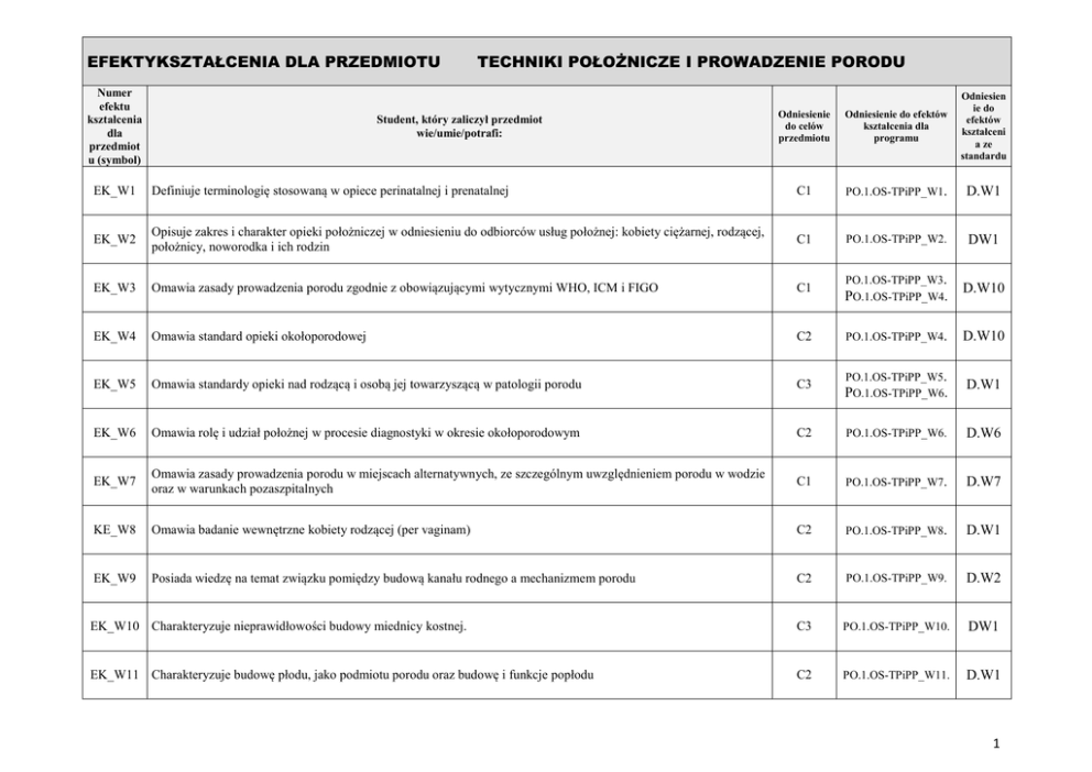 EFEKTYKSZTAŁCENIA DLA PRZEDMIOTU Numer efektu kształcenia dla przedmiot u (symbol) TECHNIKI POŁOŻNICZE I PROWADZENIE PORODU Student, który zaliczył przedmiot wie/umie/potrafi: Odniesienie do celów przedmiotu Odniesienie do efektów kształcenia dla programu Odniesien ie do efektów kształceni a ze standardu EK_W1 Definiuje terminologię stosowaną w opiece perinatalnej i prenatalnej C1 PO.1.OS-TPiPP_W1. D.W1 EK_W2 Opisuje zakres i charakter opieki położniczej w odniesieniu do odbiorców usług położnej: kobiety ciężarnej, rodzącej, położnicy, noworodka i ich rodzin C1 PO.1.OS-TPiPP_W2. DW1 EK_W3 Omawia zasady prowadzenia porodu zgodnie z obowiązującymi wytycznymi WHO, ICM i FIGO C1 PO.1.OS-TPiPP_W3. PO.1.OS-TPiPP_W4. D.W10 EK_W4 Omawia standard opieki okołoporodowej C2 PO.1.OS-TPiPP_W4. D.W10 EK_W5 Omawia standardy opieki nad rodzącą i osobą jej towarzyszącą w patologii porodu C3 PO.1.OS-TPiPP_W5. PO.1.OS-TPiPP_W6. D.W1 EK_W6 Omawia rolę i udział położnej w procesie diagnostyki w okresie okołoporodowym C2 PO.1.OS-TPiPP_W6. D.W6 EK_W7 Omawia zasady prowadzenia porodu w miejscach alternatywnych, ze szczególnym uwzględnieniem porodu w wodzie oraz w warunkach pozaszpitalnych C1 PO.1.OS-TPiPP_W7. D.W7 KE_W8 Omawia badanie wewnętrzne kobiety rodzącej (per vaginam) C2 PO.1.OS-TPiPP_W8. D.W1 EK_W9 Posiada wiedzę na temat związku pomiędzy budową kanału rodnego a mechanizmem porodu C2 PO.1.OS-TPiPP_W9. D.W2 EK_W10 Charakteryzuje nieprawidłowości budowy miednicy kostnej. C3 PO.1.OS-TPiPP_W10. DW1 EK_W11 Charakteryzuje budowę płodu, jako podmiotu porodu oraz budowę i funkcje popłodu C2 PO.1.OS-TPiPP_W11. D.W1 1 EK_W12 Omawia elementy i tok badania położniczego zewnętrznego i wewnętrznego ciężarnej i rodzącej C2 PO.1.OS-TPiPP_W12. D.W1 EK_W13 Opisuje elementy wchodzące w skład badania przedmiotowego i podmiotowego ciężarnej i rodzącej C2 PO.1.OS-TPiPP_W13. D.W1 EK_W14 Omawia mechanizm porodu w położeniu podłużnym główkowym ułożeniu potylicowym przednim C2 PO.1.OS-TPiPP_W14. D.W2 EK_W15 Charakteryzuje zasady opieki nad noworodkiem po porodzie C2 PO.1.OS-TPiPP_W15. D.W11 EK_W16 Omawia mechanizm porodu w położeniu podłużnym główkowym ułożeniu potylicowym tylnym C3 PO.1.OS-TPiPP_W16. D.W2 EK_W17 Omawia mechanizm porodu w nieprawidłowych ułożeniach i ustawieniach główki C3 PO.1.OS-TPiPP_W17. D.W2 EK_W18 Opisuje mechanizm porodu w położeniach miednicowych płodu C3 PO.1.OS-TPiPP_W18 D.W2 EK_W19 Omawia rodzaje pomocy ręcznych stosowanych w prowadzeniu porodu miednicowego C3 PO.1.OS-TPiPP_W19. D.W2 EK_W20 Omawia przebieg porodu w przypadku nieprawidłowej miednicy C3 PO.1.OS-TPiPP_W20. D.W2 EK_W21 Omawia zasady obowiązujące podczas prowadzenia porodu bliźniaczego C3 PO.1.OS-TPiPP_W21. D.W2 C3 PO.1.OS-TPiPP_W22. D.W4 EK_W23 Omawia postępowanie PTG w przypadku dystocji barkowej C3 PO.1.OS-TPiPP_W23. D.W4 EK_W24 Omawia zasady nadzoru położniczego/ opieki położniczej sprawowanej nad rodzącą podczas porodu fizjologicznego C2 PO.1.OS-TPiPP_W24. D.W1 EK_W25 Omawia zasady współczesnej diagnostyki w okresie okołoporodowym C2 PO.1.OS-TPiPP_W25. D.W6 EK_W22 Zna zadania położnej podczas prowadzenia porodu patologicznego/ porodów zabiegowych i operacji położniczych: cięcie cesarskie, próżnociąg położniczy, kleszcze, obroty położnicze, pomoce ręczne, ręczne wydobycie płodu 2 EK_W26 PO.1.OS-TPiPP_W26. Omawia różnice w prawidłowym i patologicznym zapisie badania KTG D.W27 C1 EK_W27 Omawia zasady monitorowania przebiegu porodu PO.1.OS-TPiPP_W27. D.W27 C1 EK_W28 Zna zasady biochemicznej weryfikacji wyników badań biofizycznych PO.1.OS-TPiPP_W28. D.W16 C1 EK_W29 Omawia fizjologiczne uwarunkowania porodu i jego zwiastuny PO.1.OS-TPiPP_W29. D.W6 C1 EK_W30 Zna zasady przyjęcia rodzącej w położniczej izbie przyjęć i na salę porodową zgodnie z obowiązującymi standardami PO.1.OS-TPiPP_W30. D.W1 C1 EK_W31 Charakteryzuje powikłania I, II i III okresu porodu C3 PO.1.OS-TPiPP_W31. D.W1 EK_W32 Definiuje pojęcia preindukcja, indukcja i stymulacja porodu C3 PO.1.OS-TPiPP_W32. D.W3 EK_W33 Charakteryzuje farmakologiczne i niefarmakologiczne metody indukcji i stymulacji czynności skurczowej macicy. C1 PO.1.OS-TPiPP_W33. D.W3 EK_W34 Wymienia rodzaje zaburzeń czynności skurczowej macicy z uwzględnieniem sposobu postępowanie położniczego. C3 PO.1.OS-TPiPP_W34. D.W1 EK_W35 Przedstawia zalety i wady różnych pozycji i udogodnień porodowych C1 PO.1.OS-TPiPP_W35. D.W1 EK_W36 Charakteryzuje zasady psychoterapii oraz farmakologiczne i niefarmakologiczne metody łagodzenia bólu porodowego C1 PO.1.OS-TPiPP_W36. D.W7 EK_W37 Omawia zasady prowadzenia porodu rodzinnego, aktywnego i naturalnego C1 PO.1.OS-TPiPP_W37. D.W8 EK_W38 Charakteryzuje metody analgezji porodu i ich dobór C1 PO.1.OS-TPiPP_W38 D.W87 C3 PO.1.OS-TPiPP_W39. D.W1 EK_W39 Omawia zasady nadzoru położniczego/ opieki położniczej sprawowanej nad rodzącą podczas porodu powikłanego stanami nagłymi 3 EK_W40 Definiuje krwotok położniczy z uwzględnieniem propozycji postępowania C3 PO.1.OS-TPiPP_W40. D.W5 EK_W41 Omawia procedury postępowania z narzędziami chirurgicznymi po porodzie i innych zabiegach położniczych C1 PO.1.OS-TPiPP_W41. D.W10 EK_W42 Opisuje zasady obowiązujące w prowadzeniu dokumentacji położniczej C4 PO.1.OS-TPiPP_W42. D.W10 UMIEJĘTNOŚCI EK_U1 Posługuje się właściwym nazewnictwem medycznym C1 PO.1.OS-TPiPP_U1 D.U5 EK_U2 Stosuje w swojej pracy zasady wynikające z wytycznych WHO, ICM, FIGO, PTG C6 PO.1.OS-TPiPP_U2 D.U5 EK_U3 Ocenia sytuację położniczą i stawia diagnozę położniczą oraz planuje swoje działania w odniesieniu do kobiety ciężarnej, rodzącej, położnicy i noworodka C2 PO.1.OS-TPiPP_U3 D.U1 EK_U4 Ocenia budowę kanału rodnego i usytuowanie płodu w jamie macicy C2 PO.1.OS-TPiPP_W24. D.U3 Wykonuje badania służące ocenie stanu zdrowia płodu, i ciężarnej, rodzącej i interpretuje ich wyniki C2 PO.1.O