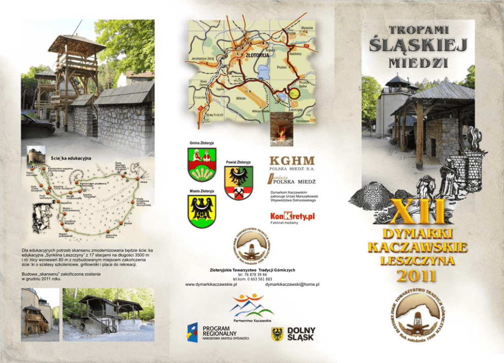 Gmina Złotoryja Ścieżka edukacyjna Powiat Złotoryja Miasto Złotoryja Dymarkom Kaczawskim patronuje Urzad Marszalkowski Województwa Dolnoslaskiego Patronat medialny Dla edukacyjnych potrzeb skansenu zmodernizowana będzie ścieżka edukacyjna „Synklina Leszczyny” z 17 stacjami na długości 3500 m i różnicy wzniesień 80 m z rozbudowanym miejscem zakończenia ścieżki o szałasy szkoleniowe, grillowniki i place do rekreacji. Budowa „skansenu” zakończona zostanie w grudniu 2011 roku. Zlotoryjskie Towarzystwo Tradycji Górniczych tel. 76 878 39 66 tel.kom. 0 603 561 883 www.dymarkikaczawskie.pl [email protected] W głównym obiekcie ulokowane będą następujące funkcje: ? Izba Tradycji Górniczych z ekspozycjami i historią ponad 8-wiekowego górnictwa i hutnictwa ? sala edukacyjna z ośmioma stanowiskami komputerowymi i laboratorium przyrodniczo-geologicznym ? wielofunkcyjna seminaryjna sala do ćwiczeń kulturalno-oświatowych ? sala konferencyjna z możliwością przyjęcia jednorazowo 200 osób ? pomieszczenia hotelowe dla 40 osób docelowo ? węzeł gastronomiczny z profesjonalnym zapleczem oraz dwoma salami konsumpcyjnym, chłopsko-górniczą i rycerską, mogące obsłużyć 80 osób Oddany do użytku w 2012 r. „skansen” będzie pierwszym w naszym regionie Przedsiębiorstwem Turystycznym w pełnym tego słowa znaczeniu z możliwościami edukacyjno-turystycznymi jakich do tej pory nie miało „Stare Zagłębie Górnicze” i tzw. „Kraina Wygasłych Wulkanów”. Mamy przyjemność zaprezentować pierwszą na Dolnym Śląsku instytucję pokazującą historię śląskiej miedzi i życie górników w warunkach możliwie zbliżonych do średniowiecznych. Pozwoli to realizować programy edukacyjne dla różnych grup społecznych a zwłaszcza młodzieży w formie „zielonych szkół” i warsztatów weekendowych. Realizacja przewidzianych założeń pozwoli wyedukować w ciągu jednego roku ok. 10000 osób, w tym 6500 osób w systemie stacjonarnym (zakwaterowanie i „zielone szkoły) i 3500 osób przyjezdnych - jednodniowych turystów. Pod specjalnie skonstruowanym balkonem budynku głównego ulokowane będą stare ginące zawody i rzemiosło, gdzie przeprowadzane będą warsztaty edukacyjne z młodzieżą i turystami. Do głównych należą: ? kowal ? ceramik ? mennik ? piekarz + żarna i podpłomyki ? papier czerpany ? obróbka kamieni szlachetnych ? rzeźba w drzewie i w piaskowcu. W ramach infrastruktury górniczo-hutniczej na terenie skansenu zamontowane zostaną: ? piece hutnicze do wytopu metali ? średniowieczna sztolnia górnicza ? wodospad wodny z płucznią złota ? kolejki i wagoniki górnicze ? miniatury szybów i oryginalne koła szybowe ? wiertnica górnicza ? estrada na prezentacje, konkursy, festiwale, itp. ? mini zwierzyniec ze zwierzętami niezbędnymi do życia średniowiecznych górników ? pod murem obronnym ustawione będą stragany kupieckie dla przybyłych rzemieślników i producentów ? figury św. Barbary i św. Floriana patronów górników i hutników