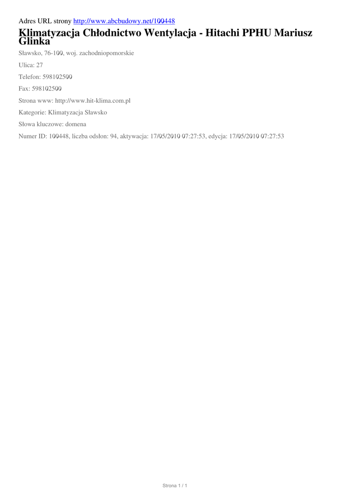 Adres URL strony http://www.abcbudowy.net/100448 Klimatyzacja Chłodnictwo Wentylacja - Hitachi PPHU Mariusz Glinka Sławsko, 76-100, woj. zachodniopomorskie Ulica: 27 Telefon: 598102500 Fax: 598102500 Strona www: http://www.hit-klima.com.pl Kategorie: Klimatyzacja Sławsko Słowa kluczowe: domena Numer ID: 100448, liczba odsłon: 94, aktywacja: 17/05/2010 07:27:53, edycja: 17/05/2010 07:27:53 Strona 1 / 1