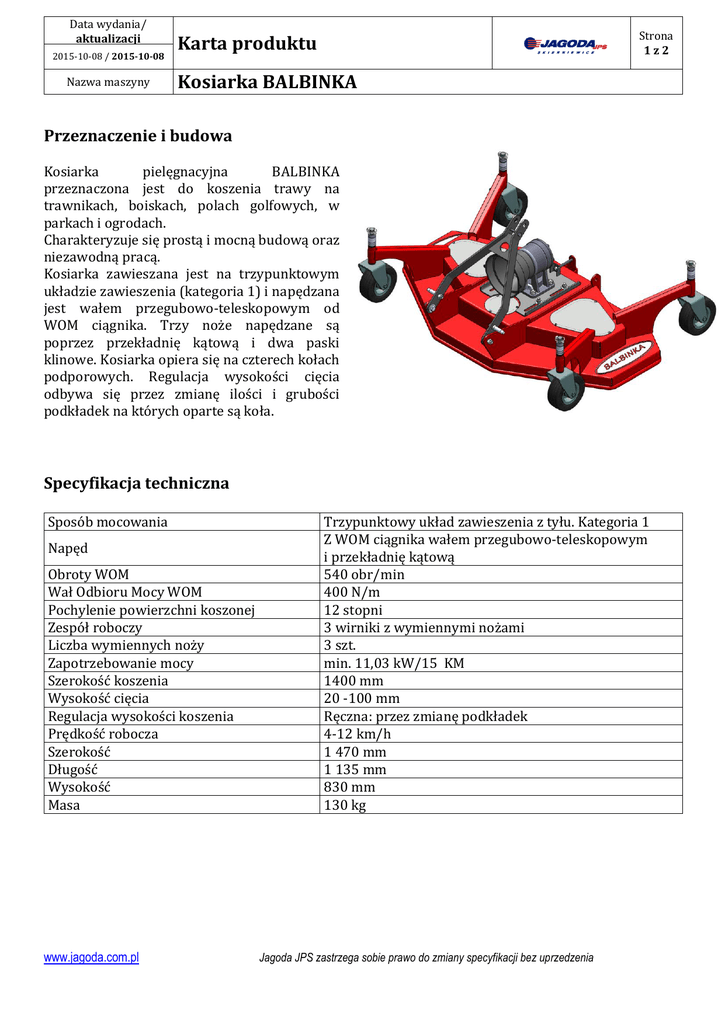 Data wydania/ aktualizacji 2015-10-08 / 2015-10-08 Nazwa maszyny Strona 1z2 Karta produktu Kosiarka BALBINKA Przeznaczenie i budowa Kosiarka pielęgnacyjna BALBINKA przeznaczona jest do koszenia trawy na trawnikach, boiskach, polach golfowych, w parkach i ogrodach. Charakteryzuje się prostą i mocną budową oraz niezawodną pracą. Kosiarka zawieszana jest na trzypunktowym układzie zawieszenia (kategoria 1) i napędzana jest wałem przegubowo-teleskopowym od WOM ciągnika. Trzy noże napędzane są poprzez przekładnię kątową i dwa paski klinowe. Kosiarka opiera się na czterech kołach podporowych. Regulacja wysokości cięcia odbywa się przez zmianę ilości i grubości podkładek na których oparte są koła. Specyfikacja techniczna Sposób mocowania Napęd Obroty WOM Wał Odbioru Mocy WOM Pochylenie powierzchni koszonej Zespół roboczy Liczba wymiennych noży Zapotrzebowanie mocy Szerokość koszenia Wysokość cięcia Regulacja wysokości koszenia Prędkość robocza Szerokość Długość Wysokość Masa www.jagoda.com.pl Trzypunktowy układ zawieszenia z tyłu. Kategoria 1 Z WOM ciągnika wałem przegubowo-teleskopowym i przekładnię kątową 540 obr/min 400 N/m 12 stopni 3 wirniki z wymiennymi nożami 3 szt. min. 11,03 kW/15 KM 1400 mm 20 -100 mm Ręczna: przez zmianę podkładek 4-12 km/h 1 470 mm 1 135 mm 830 mm 130 kg Jagoda JPS zastrzega sobie prawo do zmiany specyfikacji bez uprzedzenia Data wydania/ aktualizacji 2015-10-08 / 2015-10-08 Nazwa maszyny Strona 2z2 Karta produktu Kosiarka BALBINKA Dane wysyłkowe Widok z boku Długość Widok z góry 1 135 mm Szerokość 1 470 mm Wysokość 645 mm Widok z przodu www.jagoda.com.pl Jagoda JPS zastrzega sobie prawo do zmiany specyfikacji bez uprzedzenia