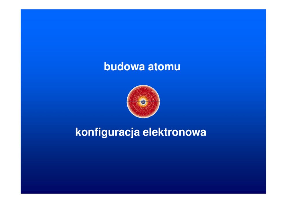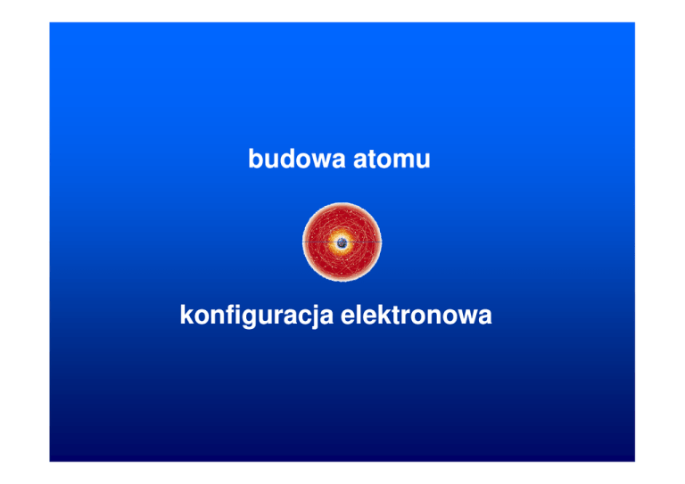 budowa atomu konfiguracja elektronowa S p d f zasada rozbudowy powłok elektronowych kolejność zapełniania orbitali atomowych 1 2 3 4 5 6 7 s s s s s s s p p p p p p d d d d d f f f f Konfiguracje elektronowe pierwiastków Zakaz Pauliego żaden orbital nie może być obsadzony przez więcej niż 2 elektrony (o sparowanych spinach) Reguła Hunda Atom przyjmuje konfigurację o największej liczbie niesparowanych elektronów (w stanie podstawowym) Symbol l. atomowa konfiguracja Okres 1 s Okres 2 s p Okres 4 s d Okres 4 c.d. d p dla pierwiastków bloku d korzystne dla atomu jest jeśli powłoka d ma konfigurację d5 lub d10. zmiana kolejności zapełnienia powłok dla niektórych pierwiastków np.: Okres 44-ty: [Cr] = [Ar]3d54s1 [Cu] = [Ar]3d104s1 Okres 55-ty [Nb] = [Kr]4d45s1 [Mo] = [Kr]4d55s1 [Ru] = [Kr]4d75s1 [Rh] = [Kr]4d85s1 [Pd] = [Kr]4d10 [Ag] = [Kr]4d105s1 a nie [Ar]3d44s2 a nie [Ar]3d94s2 Okres 66-ty [Pt] = [Xe]4f145d96s1 [Au]= [Xe]4f145d106s1 Konfiguracja jonów 1. Dla anionów liczbę elektronów atomu zwiększamy o ładunek jonu i umieszczamy je na orbitalach zgodnie z regułami 2. Dla kationów liczbę elektronów atomu zmniejszamy o ładunek kationu kationu.. Sposób postępowania postępowania:: a) zapisujemy konfigurację atomu b) zmniejszamy liczbę elektronów na orbitalach walencyjnych o ładunek kationu konfiguracja elektronowa jonów - przykłady Na 1s 2 2s 2 2p 6 3s 1 Na+ 1s 2 2s 2 2p 6 Mg 1s 2 2s 2 2p 6 3s 2 Mg2+ 1s 2 2s 2 2p6 Al 1s 2 2s 2 2p 6 3s 2 3p 1 Al3+ 1s 2 2s 2 2p 6 O 1s 2 2s 2 2p 4 O 2- 1s 2 2s 2 2p 6 F 1s 2 2s 2 2p 5 F- 1s 2 2s 2 2p 6 N 1s 2 2s 2 2p 3 N3- 1s 2 2s 2 2p 6 W przypadku bloku p nie uzyskano do chwili obecnej jonów w których elektrony odchodziłyby z powłoki d, np. : [Pb2+] = [Xe]4f145d106s2 [Pb4+] = [Xe]4f145d10 nie znamy związków Pb5+ i wyższych. Konfiguracja jonów metali d-elektronowych. Elektrony najpierw usuwane są z powłoki s a dopiero później z powłoki d. Ale np.: Ag występuje wyłącznie na +1 stopniu utlenienia, a dla niektórych metali można usunąć wszystkie elektrony d. Fe 1s22s22p63s23p63d64s2 Fe2+ 1s22s22p63s23p63d6 Fe3+ 1s22s22p63s23p63d5 Zn 1s22s22p63s23p63d104s2 Zn2+ 1s22s22p63s23p63d10