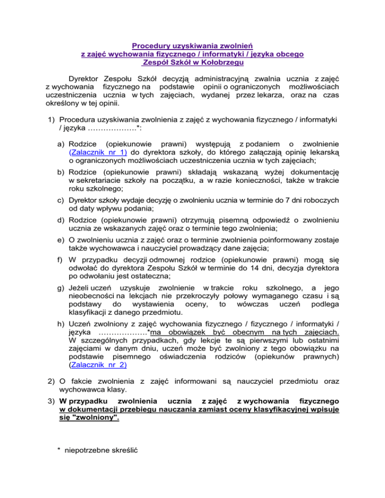 Procedury uzyskiwania zwolnień z zajęć wychowania fizycznego / informatyki / języka obcego Zespół Szkół w Kołobrzegu Dyrektor Zespołu Szkół decyzją administracyjną zwalnia ucznia z zajęć z wychowania fizycznego na podstawie opinii o ograniczonych moŜliwościach uczestniczenia ucznia w tych zajęciach, wydanej przez lekarza, oraz na czas określony w tej opinii. 1) Procedura uzyskiwania zwolnienia z zajęć z wychowania fizycznego / informatyki / języka ……………….*: a) Rodzice (opiekunowie prawni) występują z podaniem o zwolnienie (Zalacznik_nr_1) do dyrektora szkoły, do którego załączają opinię lekarską o ograniczonych moŜliwościach uczestniczenia ucznia w tych zajęciach; b) Rodzice (opiekunowie prawni) składają wskazaną wyŜej dokumentację w sekretariacie szkoły na początku, a w razie konieczności, takŜe w trakcie roku szkolnego; c) Dyrektor szkoły wydaje decyzję o zwolnieniu ucznia w terminie do 7 dni roboczych od daty wpływu podania; d) Rodzice (opiekunowie prawni) otrzymują pisemną odpowiedź o zwolnieniu ucznia ze wskazanych zajęć oraz o terminie tego zwolnienia; e) O zwolnieniu ucznia z zajęć oraz o terminie zwolnienia poinformowany zostaje takŜe wychowawca i nauczyciel prowadzący dane zajęcia; f) W przypadku decyzji odmownej rodzice (opiekunowie prawni) mogą się odwołać do dyrektora Zespołu Szkół w terminie do 14 dni, decyzja dyrektora po odwołaniu jest ostateczna; g) JeŜeli uczeń uzyskuje zwolnienie w trakcie roku szkolnego, a jego nieobecności na lekcjach nie przekroczyły połowy wymaganego czasu i są podstawy do wystawienia oceny, to wówczas uczeń podlega klasyfikacji z danego przedmiotu. h) Uczeń zwolniony z zajęć wychowania fizycznego / fizycznego / informatyki / języka ……………….*ma obowiązek być obecnym na tych zajęciach. W szczególnych przypadkach, gdy lekcje te są pierwszymi lub ostatnimi zajęciami w danym dniu, uczeń moŜe być zwolniony z tego obowiązku na podstawie pisemnego oświadczenia rodziców (opiekunów prawnych) (Zalacznik_nr_2) 2) O fakcie zwolnienia z zajęć informowani są nauczyciel przedmiotu oraz wychowawca klasy. 3) W przypadku zwolnienia ucznia z zajęć z wychowania fizycznego w dokumentacji przebiegu nauczania zamiast oceny klasyfikacyjnej wpisuje się "zwolniony". *_niepotrzebne skreślić