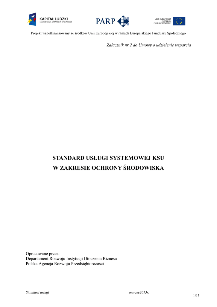 Projekt współfinansowany ze środków Unii Europejskiej w ramach Europejskiego Funduszu Społecznego Załącznik nr 2 do Umowy o udzielenie wsparcia STANDARD USŁUGI SYSTEMOWEJ KSU W ZAKRESIE OCHRONY ŚRODOWISKA Opracowane przez: Departament Rozwoju Instytucji Otoczenia Biznesu Polska Agencja Rozwoju Przedsiębiorczości Standard usługi marzec2013r. 1/13 A. Usługa w zakresie ochrony środowiska składa się z: 1) etapu I – audyt środowiskowy, identyfikacji stopnia spełniania wymogów prawnych, 2) etapu II - wsparcia doradcze przy wdrażaniu działań rekomendowanych w etapie I; 3) etapu III – szkolenia z zakresu wykorzystania narzędzi pozwalających na obliczanie poziomu korzystania ze środowiska oraz na obliczanie opłat za korzystanie ze środowiska B. Realizacja usługi w zakresie ochrony środowiska: I. Etap I – audyt środowiskowy polega na przeprowadzeniu audytu prawnego zgodności z prawem ochrony środowiska (identyfikacji stopnia spełniania wymogów prawnych), w następujących obszarach/zakresach: 1. Ogólnych wymagań prawnych obejmujących: 1) analizę wymaganych dokumentów, tj.: analizę koniecznych do prowadzenia działalności gospodarczej uzgodnień, pozwoleń, podpisanych umów, zgłoszeń a także niezbędnej dokumentacji w zakresie ochrony środowiska, w tym wnoszenia opłat za korzystnie ze środowiska (analiza dokumentów związanych z obowiązkiem wnoszenia opłat za korzystanie ze środowiska za okres ostatnich 5 lat), 2) przekazanie informacji na temat brakującej dokumentacji związanej z ochroną środowiska. 2. Gospodarki odpadami obejmującej: 1) analizę stosownych uzgodnień, ewidencji, tj. analizę prowadzonej w przedsiębiorstwie dokumentacji w zakresie konieczności posiadania wymaganych pozwoleń i zezwoleń związanych z prowadzeniem gospodarki odpadami; 2) ocenę stopnia realizacji w przedsiębiorstwie selektywnej zbiórki odpadów z podziałem na główne rodzaje odpadów; 3) analizę dokumentacji związanej z odbiorem odpadów z przedsiębiorstwa; 4) analizę dokumentacji pozwalającej na dopuszczenie składowania odpadów na danym rodzaju składowisku odpadów. 3. Emisji do powietrza, obejmującej: 1) określenie obowiązków przedsiębiorcy z zakresu emisji zanieczyszczeń gazowych i pyłowych do powietrza; 2) analizę prowadzonej w przedsiębiorstwie dokumentacji związanej z identyfikacją/stwierdzenie występowania źródeł emisji oraz czynników wpływających na emisję; 3) analizę przeprowadzonych dotychczas w firmie pomiarów pod katem spełniania wymogów ustawowych oraz z wcześniejszych decyzji. Standard usługi marzec2013r. 2/13 4. Gospodarki wodno-ściekowej obejmującej: 1) analizę działalności przedsiębiorstwa pod kątem konieczności posiadania pozwolenia wodno-prawnego; 2) analizę działalności przedsiębiorstwa w celu ustalenia źródeł poboru wody oraz sposobu zrzutu ścieków; 3) analizę przeprowadzonych w przedsiębiorstwie pomiarów jakości ścieków. 5. Recyklingu oraz odzysku opakowań i produktów obejmujących: 1) określenie prawnych obowiązków związanych z wprowadzeniem na rynek opakowań oraz produktów, analizę działalności przedsiębiorstwa w celu ustalenia podlegania przepisom wynikającym z ustawy o obowiązkach przedsiębiorcy w zakresie gospodarowania niektórymi odpadami oraz o opłacie produktowej, ustawy o bateriach i akumulatorach; 2) przegląd prowadzonej w przedsiębiorstwie dokumentacji związanej z ilością wprowadzonych na rynek opakowań oraz produktów, osiągniętych poziomach recyklingu i odzysku. 6. Wprowadzenie recyclingu oraz odzysku sprzętu elektrycznego i elektronicznego (ZSEE) obejmującego: 1) określenie prawnych obowiązków związanych z wprowadzeniem na rynek sprzętu elektrycznego i elektronicznego, analizę działalności przedsiębiorstwa w celu ustalenia podlegania przepisom wynikającym z ustawy o obowiązkach przedsiębiorcy w zakresie gospodarowania zużytym sprzętem elektrycznym i elektronicznym , ustawy o bateriach i akumulatorach; 2) przegląd prowadzonej w przedsiębiorstwie dokumentacji związanej z ilością wprowadzonych na rynek sprzętu elektrycznego i elektronicznego, osiągniętych poziomach recyklingu i odzysku. 7. Recyclingu substancji i preparatów chemicznych oraz substancji kontrolowanych obejmującego: 1) analizę działalności przedsiębiorstwa pod kątem wymogów wynikających z rozporządzenia REACH; 2) analizę działalności przedsiębiorstwa pod kątem wykorzystywania na terytorium Polski substancji i preparatów chemicznych oraz substancji kontrolowanych, analizę prowadzonej ewidencji substancji kontrolowanych, obowiązku przekazywania ewidencji wyspecjalizowanej jednostce. 8. Emisji hałasu obejmującej: 1) identyfikację/stwierdzenie występowania ewentualnych źródeł hałasu na terenie przedsiębiorstwa. 9. Pozostałej działalności wpływającej na środowisko, obejmującej: 1) sprawdzenie przez konsultanta spełniania wymogów POS i rozporządzeń w zakresie PCB, azbestu oraz zidentyfikowanie/stwierdzenie ewentualnego ich występowania na terenie zakładu; Standard usługi marzec2013r. 3/13 2) wskazanie przedsiębiorcy jak prowadzona przez niego działalność może wpływać na zanieczyszczenie gleb, zidentyfikowanie/stwierdzenie występowania potencjalnych źródeł zanieczyszczeń oraz wykonania obowiązku ich rekultywacji. II. Efektem końcowym etapu I jest opracowanie raportu z przeprowadzonego audytu, w którym powinny zostać wskazane następujące elementy: a) w przypadku audytu ogólnych wymagań prawnych: a) określenie stanu faktycznego w przedsiębiorstwie w zakresie spełniania wszystkich przewidzianych prawem ochrony środowiska wymogów; b) rekomendacje, które pozwolą w przyszłości na bieżące wypełnianie obowiązków prawnych w tym wnoszenia opłat za korzystanie ze środowiska; c) poinformowanie o możliwościach udziału w etapie III usługi , tj. usługi szkoleniowej. b) w przypadku audytu w