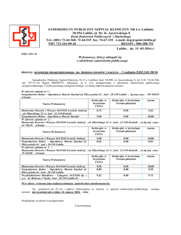 SAMODZIELNY PUBLICZNY SZPITAL KLINICZNY NR 4 w Lublinie 20-954 Lublin, ul. Dr. K. Jaczewskiego 8 Dział Zamówień Publicznych i Marketingu Tel.: (081) 72-44-360, 72-44-519 fax: 74-67-155 e-mail: [email protected] NIP: 712-241-09-26 REGON : 000-288-751 Lublin , dn 15 -03-2016 r. EDZ /193/ 16 Wykonawcy, którzy ubiegali się o udzielenie zamówienia publicznego dotyczy: przetargu nieograniczonego na dostawę owoców i warzyw – 3 zadania EDZ.242-30/16 Samodzielny Publiczny Szpital Kliniczny Nr 4 w Lublinie, kod: 20-090, ul. Jaczewskiego 8, tel. 0-81 72-44-360, fax 747-57-10, Regon 000288751, informuje, iż w w/w postępowaniu o udzielenie zamówienia publicznego przeprowadzonego w trybie przetargu nieograniczonego za ofertę najkorzystniejsza uznano : W zakresie zadania nr 1 : Gospodarstwo Rolno – Ogrodnicze Marcin Stachal ul. Pliszczyńska 61 , kod : 20-258 Lublin , łączną cenę : 195 469,91 zł brutto liczba pkt. w liczba pkt. w kryterium razem kryterium Termin płatności Nazwa Wykonawcy CENA Hurtownia Owoców i Warzyw MANGO Lewicki Andrzej 8,72 0,50 9,22 , ul. Sikorskiego 22 A , kod : 23-210 Kraśnik Gospodarstwo Rolno – Ogrodnicze Marcin Stachal 9,50 0,50 10,00 W zakresie zadania nr 2 : Hurtownia Owoców i Warzyw MANGO Lewicki Andrzej , ul. Sikorskiego 22 A , kod : 23-210 Kraśnik , za łączną cenę : 34 790,59 zł brutto liczba pkt. w liczba pkt. w kryterium razem kryterium Termin płatności Nazwa Wykonawcy CENA Hurtownia Owoców i Warzyw MANGO Lewicki Andrzej 9,50 0,50 10,00 Gospodarstwo Rolno – Ogrodnicze Marcin Stachal ul. 8,42 0,50 8,92 Pliszczyńska 61 , kod : 20-258 Lublin W zakresie zadania nr 3 : Hurtownia Owoców i Warzyw MANGO Lewicki Andrzej , ul. Sikorskiego 22 A , kod : 23-210 Kraśnik , za łączną cenę : 19 418,00 zł brutto liczba pkt. w liczba pkt. w kryterium razem kryterium Termin płatności Nazwa Wykonawcy CENA Hurtownia Owoców i Warzyw MANGO Lewicki Andrzej Gospodarstwo Rolno – Ogrodnicze Marcin Stachal ul. Pliszczyńska 61 , kod : 20-258 Lublin Przedsiębiorstwo Handlowo – Usługowe AVEXIM Sp. z o.o. ul. Bukowa 2 Turka , kod : 20-258 Lublin 62 9,50 8,89 0,50 0,50 10,00 9,39 9,22 0,50 9,72 W/w oferty wybrano jako najkorzystniejsze spośród ofert nieodrzuconych. Na podstawie art. 92 ust. 1 ppkt.4 informujemy ,iż umowy w sprawie zamówienia publicznego zawarte nie wcześniej niż w dniu 16 marca 2016 roku Dziękujemy za udział w postępowaniu Z poważaniem zostaną