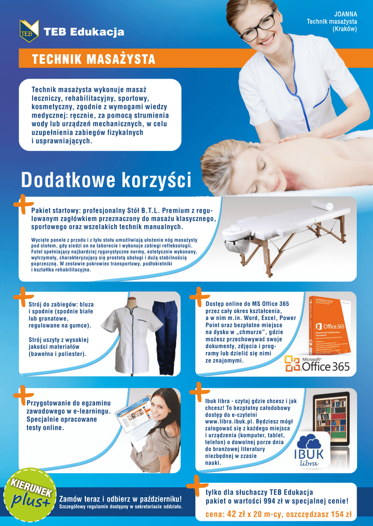 JOANNA Technik masażysta (Kraków) TECHNIK MASAŻYSTA Technik masażysta wykonuje masaż leczniczy, rehabilitacyjny, sportowy, kosmetyczny, zgodnie z wymogami wiedzy medycznej: ręcznie, za pomocą strumienia wody lub urządzeń mechanicznych, w celu uzupełnienia zabiegów fizykalnych i usprawniających. Dodatkowe korzyści Pakiet startowy: profesjonalny Stół B.T.L. Premium z regulowanym zagłówkiem przeznaczony do masażu klasycznego, sportowego oraz wszelakich technik manualnych. a Wycięte panele z przodu i z tyłu stołu umożliwiają ułożenie nóg masażysty pod stołem, gdy siedzi on na taborecie i wykonuje zabiegi refleksologii. Fotel spełniający najbardziej rygorystyczne normy, estetycznie wykonany, wytrzymały, charakteryzujący się prostotą obsługi i dużą stabilnością poprzeczną. W zestawie pokrowiec transportowy, podłokietniki i kształtka rehabilitacyjna. Strój do zabiegów: bluza i spodnie (spodnie białe lub granatowe, regulowane na gumce). Strój uszyty z wysokiej jakości materiałów (bawełna i poliester). Przygotowanie do egzaminu zawodowego w e-learningu. Specjalnie opracowane testy online. KIER UNE plus K Zamów teraz i odbierz w październiku! Szczegółowy regulamin dostępny w sekretariacie oddziału. Dostęp online do MS Office 365 przez cały okres kształcenia, a w nim m.in. Word, Excel, Power Point oraz bezpłatne miejsce na dysku w „chmurze”, gdzie możesz przechowywać swoje dokumenty, zdjęcia i programy lub dzielić się nimi ze znajomymi. Ibuk libra - czytaj gdzie chcesz i jak chcesz! To bezpłatny całodobowy dostęp do e-czytelni www.libra.ibuk.pl. Będziesz mógł zalogować się z każdego miejsca i urządzenia (komputer, tablet, telefon) o dowolnej porze dnia do branżowej literatury niezbędnej w czasie nauki. tylko dla słuchaczy TEB Edukacja pakiet o wartości 994 zł w specjalnej cenie! cena: 42 zł x 20 m-cy, oszczędzasz 154 zł