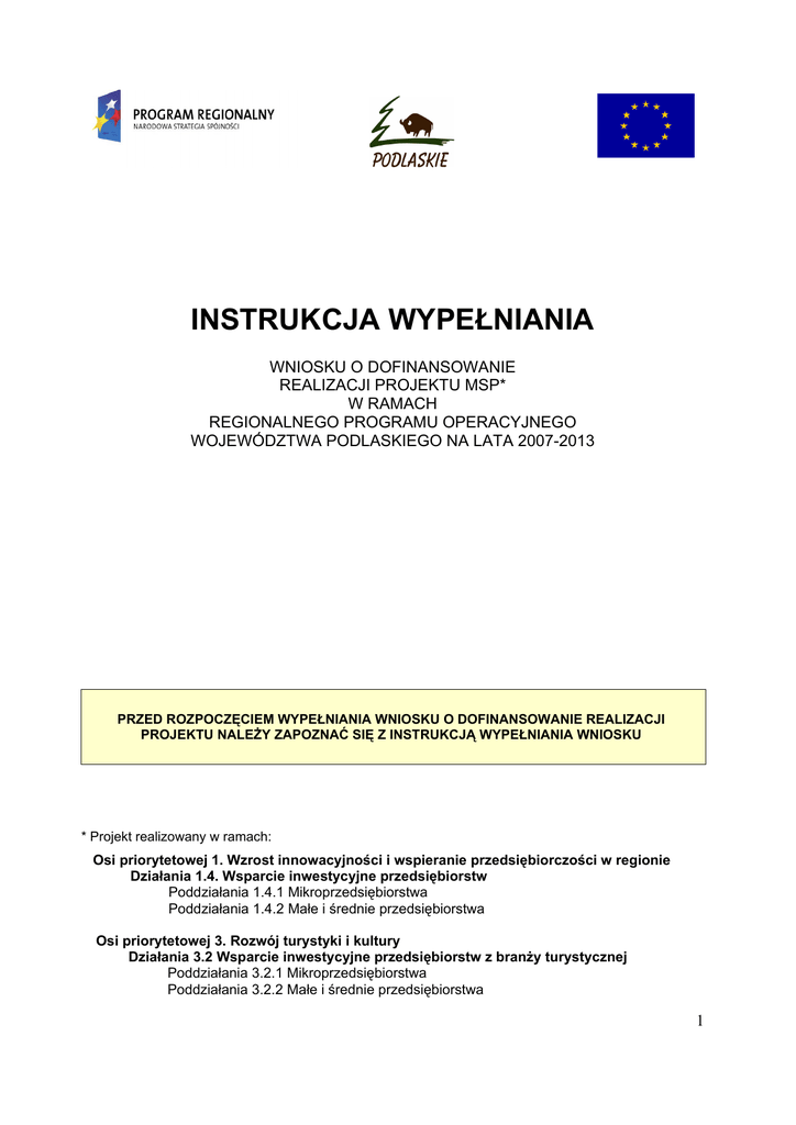 INSTRUKCJA WYPEŁNIANIA WNIOSKU O DOFINANSOWANIE REALIZACJI PROJEKTU MSP* W RAMACH REGIONALNEGO PROGRAMU OPERACYJNEGO WOJEWÓDZTWA PODLASKIEGO NA LATA 2007-2013 PRZED ROZPOCZĘCIEM WYPEŁNIANIA WNIOSKU O DOFINANSOWANIE REALIZACJI PROJEKTU NALEŻY ZAPOZNAĆ SIĘ Z INSTRUKCJĄ WYPEŁNIANIA WNIOSKU * Projekt realizowany w ramach: Osi priorytetowej 1. Wzrost innowacyjności i wspieranie przedsiębiorczości w regionie Działania 1.4. Wsparcie inwestycyjne przedsiębiorstw Poddziałania 1.4.1 Mikroprzedsiębiorstwa Poddziałania 1.4.2 Małe i średnie przedsiębiorstwa Osi priorytetowej 3. Rozwój turystyki i kultury Działania 3.2 Wsparcie inwestycyjne przedsiębiorstw z branży turystycznej Poddziałania 3.2.1 Mikroprzedsiębiorstwa Poddziałania 3.2.2 Małe i średnie przedsiębiorstwa 1 Przygotowywany wniosek musi być zgodny m.in. z poniższymi Rozporządzeniami Wspólnot Europejskich: 1. Rozporządzenie Rady (WE) nr 1083/2006 z dnia 11.07.2006 ustanawiające przepisy ogólne dotyczące Europejskiego Funduszu Rozwoju Regionalnego, Europejskiego Funduszu Społecznego oraz Funduszu Spójności – uchylające Rozporządzenie (WE) nr 1260/1999 (Dz. Urz. UE L 210 z 31.07.2006 r.); 2. Rozporządzenie (WE) nr 1080/2006 Parlamentu Europejskiego i Rady z dnia 5 lipca 2006 r. w sprawie Europejskiego Funduszu Rozwoju Regionalnego i uchylającym Rozporządzenie (WE) nr 1783/1999 (Dz. Urz. UE L 210, 31.07.2006 r.); 3. Rozporządzenie Komisji nr 1828/2006 z dnia 8 grudnia 2006 r. w sprawie szczegółowych zasad wykonania Rozporządzenia Rady (WE) nr 1083/2006 ustanawiające przepisy ogólne dotyczące Europejskiego Funduszu Rozwoju Regionalnego, Europejskiego Funduszu Społecznego oraz Funduszu Spójności oraz rozporządzenia (WE) nr 1080/2006 Parlamentu Europejskiego i Rady w sprawie Europejskiego Funduszu Rozwoju Regionalnego (Dz. Urz. UE L 371 z 27.12.2006, sprostowane – Dz. Urz. UE L 45 z 15.02.2007 r.); 4. Dyrektywa nr 2003/4/WE Parlamentu Europejskiego i Rady z dnia 28 stycznia 2003 r. w sprawie publicznego dostępu do informacji dotyczących środowiska i uchylająca dyrektywę Rady 90/313/EWG (Dz. Urz. UE L 41 z 14.02.2003); 5. Dyrektywa nr 2004/18/WE Parlamentu Europejskiego i Rady z dnia 31 marca 2004 r. w sprawie koordynacji procedur udzielenia zamówień publicznych na roboty budowlane, dostawy i usługi (Dz. Urz. UE L 134 z 30.04.2004, str. 114; Dz. Urz. UE Polskie wydanie specjalne, rozdz. 6, t 7, str. 132) Jednocześnie wniosek powinien być zgodny z następującymi przepisami Prawa Polskiego: 1. 2. 3. 4. 5. 6. 7. 8. 9. 10. 11. 12. 13. Ustawa z dnia 6 grudnia 2006 r. o zasadach prowadzenia polityki rozwoju (Dz. U. Z 2006 r. Nr 227, poz. 1658); Ustawa z dnia 30 czerwca 2005 r. o finansach publicznych (Dz. U. z 2005 r. Nr 249, poz. 2104 z późn. zm.); Ustawa z dnia 29 stycznia 2004 r. Prawo zamówień publicznych (Dz. U. z 2006 r. Nr 164, poz. 1163, z późn. zm.); Ustawa z dnia 27 kwietnia 2001 r. Prawo ochrony środowiska (Dz. U. z 2006 r. Nr 129, poz. 902, z późn. zm.); Ustawa z dnia 29 września 1994 r. o rachunkowości ( Dz. U. z 2002 r. Nr 76, poz. 694, z późn. zm.) Ustawa z dnia 11 marca 2004 r. o podatku od towarów i usług ( Dz. U. z 2004 r. Nr 249, poz. 535, z późn. zm.) Ustawa z dnia 30 kwietnia 2004 r. o postępowaniu w sprawach dotyczących pomocy publicznej (Dz.U. z 2007 r. Nr 59, poz. 404); Ustawa z dnia 5 czerwca 1998 r. o samorządzie województwa (Dz. U. z 2001 r. Nr 142, poz. 1590 z późn. zm.); Rozporządzenia pomocowe:Rozporządzenie Ministra Rozwoju Regionalnego z dnia 11 października 2007 r. w sprawie udzielania regionalnej pomocy inwestycyjnej w ramach regionalnych programów operacyjnych (Dz.U. 2007 nr 193 poz. 1399); Krajowe wytyczne dotyczące kwalifikowania wydatków w ramach funduszy strukturalnych i Funduszu Spójności w okresie programowania 2007-2013; Regionalny Program Operacyjny Województwa Podlaskiego na lata 2007–2013 – dalej zwany RPOWP; Szczegółowy Opis Priorytetów Regionalnego Programu Operacyjnego Województwa Podlaskiego na lata 2007 – 2013 – dalej zwany Uszczegółowieniem RPOWP; Wytyczne w zakresie kwalifikowania wydatków w ramach RPOWP na lata 2007-2013. 2 Trzy pierwsze rubryki wniosku zatytułowane „Data wpłynięcia wniosku i pieczęć wpływu”, „Numer wniosku w systemie kancelaryjnym UMWP” oraz „Numer wniosku w Krajowym Systemie Informatycznym” wypełniane są przez Instytucję, do której przesyłany jest wniosek. Część I. Informacje ogólne Ad. 1. Program operacyjny. Regionalny Program Operacyjny Województwa Podlaskiego na lata 2007-2013. W punkcie tym należy wpisać numer i nazwę Osi priorytetowej, w ramach której realizowany będzie projekt, numer i nazwę Działania, w ramach którego realizowany będzie projekt oraz numer i nazwę Poddziałania, w ramach którego realizowany będzie projekt, tj.: w ramach działania 1.4: - pkt 1.1 Oś priorytetowa: „I - Wzrost innowacyjności i wspieranie przedsiębiorczości w regionie” - pkt 1.2 Działanie: „1.4 - Wsparcie inwestycyjne przedsiębiorstw” - pkt 1.3 Poddziałanie: „1.4.1- Mikroprzedsiębiorstwa” lub „1.4.2 Małe i średnie przedsiębiorstwa”. w ramach działania 3.2: - pkt 1.1 Oś priorytetowa: „III - Rozwój turystyki i kultury” - pkt 1.2 Działanie: „3.2 - Wsparcie inwestycyjne przedsiębiorstw z branży turystycznej” - pkt 1.3 Poddziałanie: „3.2.1- Mikroprzedsiębiorstwa” lub „3.2.2 Małe i średnie przedsiębiorstwa”. Ad. 2. Harmonogram realizacji projektu. Niniejszy harmonogram wymaga podania podstawowych danych odnoszących się do przebiegu realizacji projektu. 2.1 Planowany termin rozpoczęcia rzeczowej realizacji projektu. Przez rozpoczęcie prac związanych z realizacją nowej inwestycji należy rozumieć podjęcie prac budowlanych lub pierwszego prawnie wiążącego zobowiązania 3 ruchomych środków trwałych, z wyłączeniem wydatków związanych z przygotowaniem i opracowaniem dokumentacji proj