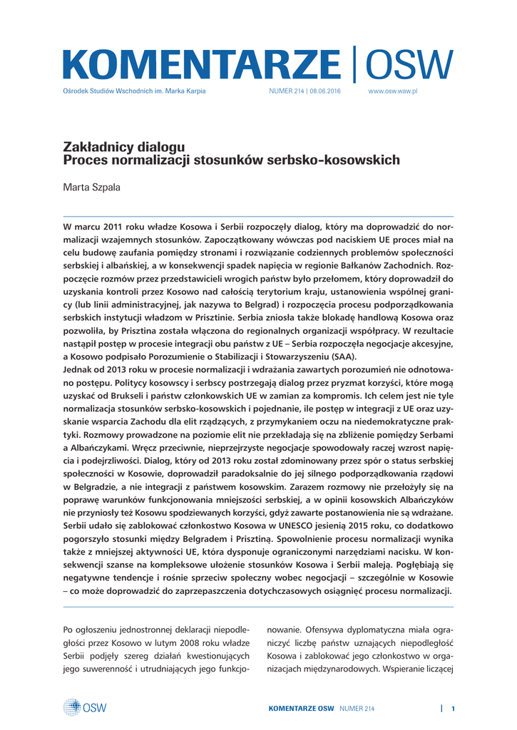Ośrodek Studiów Wschodnich im. Marka Karpia NUMER 214 | 08.06.2016 www.osw.waw.pl Zakładnicy dialogu Proces normalizacji stosunków serbsko-kosowskich Marta Szpala W marcu 2011 roku władze Kosowa i Serbii rozpoczęły dialog, który ma doprowadzić do normalizacji wzajemnych stosunków. Zapoczątkowany wówczas pod naciskiem UE proces miał na celu budowę zaufania pomiędzy stronami i rozwiązanie codziennych problemów społeczności serbskiej i albańskiej, a w konsekwencji spadek napięcia w regionie Bałkanów Zachodnich. Rozpoczęcie rozmów przez przedstawicieli wrogich państw było przełomem, który doprowadził do uzyskania kontroli przez Kosowo nad całością terytorium kraju, ustanowienia wspólnej granicy (lub linii administracyjnej, jak nazywa to Belgrad) i rozpoczęcia procesu podporządkowania serbskich instytucji władzom w Prisztinie. Serbia zniosła także blokadę handlową Kosowa oraz pozwoliła, by Prisztina została włączona do regionalnych organizacji współpracy. W rezultacie nastąpił postęp w procesie integracji obu państw z UE – Serbia rozpoczęła negocjacje akcesyjne, a Kosowo podpisało Porozumienie o Stabilizacji i Stowarzyszeniu (SAA). Jednak od 2013 roku w procesie normalizacji i wdrażania zawartych porozumień nie odnotowano postępu. Politycy kosowscy i serbscy postrzegają dialog przez pryzmat korzyści, które mogą uzyskać od Brukseli i państw członkowskich UE w zamian za kompromis. Ich celem jest nie tyle normalizacja stosunków serbsko-kosowskich i pojednanie, ile postęp w integracji z UE oraz uzyskanie wsparcia Zachodu dla elit rządzących, z przymykaniem oczu na niedemokratyczne praktyki. Rozmowy prowadzone na poziomie elit nie przekładają się na zbliżenie pomiędzy Serbami a Albańczykami. Wręcz przeciwnie, nieprzejrzyste negocjacje spowodowały raczej wzrost napięcia i podejrzliwości. Dialog, który od 2013 roku został zdominowany przez spór o status serbskiej społeczności w Kosowie, doprowadził paradoksalnie do jej silnego podporządkowania rządowi w Belgradzie, a nie integracji z państwem kosowskim. Zarazem rozmowy nie przełożyły się na poprawę warunków funkcjonowania mniejszości serbskiej, a w opinii kosowskich Albańczyków nie przyniosły też Kosowu spodziewanych korzyści, gdyż zawarte postanowienia nie są wdrażane. Serbii udało się zablokować członkostwo Kosowa w UNESCO jesienią 2015 roku, co dodatkowo pogorszyło stosunki między Belgradem i Prisztiną. Spowolnienie procesu normalizacji wynika także z mniejszej aktywności UE, która dysponuje ograniczonymi narzędziami nacisku. W konsekwencji szanse na kompleksowe ułożenie stosunków Kosowa i Serbii maleją. Pogłębiają się negatywne tendencje i rośnie sprzeciw społeczny wobec negocjacji – szczególnie w Kosowie – co może doprowadzić do zaprzepaszczenia dotychczasowych osiągnięć procesu normalizacji. Po ogłoszeniu jednostronnej deklaracji niepodległości przez Kosowo w lutym 2008 roku władze Serbii podjęły szereg działań kwestionujących jego suwerenność i utrudniających jego funkcjo- nowanie. Ofensywa dyplomatyczna miała ograniczyć liczbę państw uznających niepodległość Kosowa i zablokować jego członkostwo w organizacjach międzynarodowych. Wspieranie liczącej KOMENTARZE OSW NUMER 214 1 ok. 120–140 tysięcy serbskiej mniejszości, która dysponowała finansowanymi przez Belgrad instytucjami, miało uniemożliwić Prisztinie kontrolę nad całym terytorium państwa1. Ponadto Serbia odmawiała kontaktów z przedstawicielami władz w Kosowie i domagała się, by Prisztinę reprezentowała misja ONZ – UNMIK, blokowała Rozmowy doprowadziły do uzyskania kontroli przez Kosowo nad całością terytorium i ustanowienia granicy z Serbią. przepływ towarów i osób z kosowskimi dokumentami oraz realizację połączeń lotniczych do Kosowa nad terytorium Serbii, nie uznawała też żadnych dokumentów wydawanych przez kosowskie władze. Serbia zwróciła się też o opinię Międzynarodowego Trybunału Sprawiedliwości w kwestii zgodności deklaracji niepodległości Kosowa z prawem międzynarodowym. Niekorzystna dla Serbii decyzja Trybunału w 2010 roku, a także zastosowanie presji ze strony UE, która wykorzystała aspiracje akcesyjne Belgradu i Prisztiny, doprowadziły do rozpoczęcia procesu dialogu kosowsko-serbskiego. Był to przełom, gdyż wcześniej Serbia wykluczała negocjacje z władzami Kosowa, które uznawała za własne terytorium. Z kolei elity kosowskie stały na stanowisku, że Serbia musi zaakceptować niepodległość Kosowa, a kwestie sporne i status mniejszości serbskiej są wewnętrznymi problemami Kosowa i włączenie ich do negocjacji jest kwestionowaniem jego suwerenności. Serbska mniejszość w Kosowie zamieszkuje enklawy na południu Kosowa (sześć gmin z serbską większością – 53 tys. osób oraz wsie w albańskich gminach – ok. 28 tys.). Największym zwartym obszarem zamieszkanym przez Serbów są cztery gminy na północy Kosowa graniczące z Serbią (63 tys. osób) z jedynym serbskim miastem – Mitrowicą, gdzie znajduje się m.in. uniwersytet i centrum medyczne. Obszar ten pozostawał poza kontrolą zarówno Prisztiny, jak i Belgradu, który jedynie przekazywał środki finansowe na działania gmin. M. Perlec, N. Rashiti, Serbs Integration in Kosovo after the Brussels Agreement, http:// balkansgroup.org/wp-content/uploads/2015/03/Serb-Integration-Kosovo-19-March-2015.pdf, s. 5. 1 Bilans negocjacji Proces normalizacji rozpoczęto od technicznych negocjacji (marzec 2011 – luty 2012) między specjalnymi przedstawicielami obu stron z udziałem unijnego mediatora. Doprowadziły one do podpisania siedmiu porozumień dotyczących: dokumentów celnych, rejestrów cywilnoprawnych, uznawania dyplomów szkół wyższych, swobodnego przepływu osób, reprezentacji Kosowa na szczeblu regionalnym, danych katastralnych oraz zintegrowanego systemu zarządzania granicą (IB