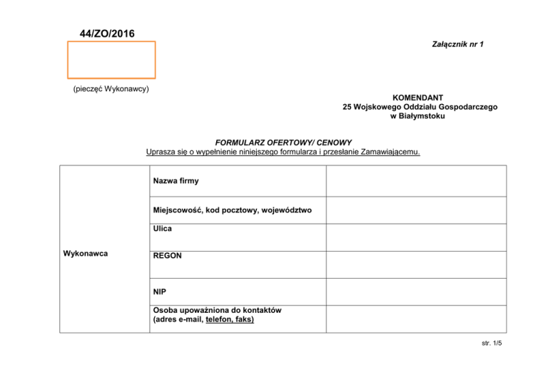 44/ZO/2016 Załącznik nr 1 (pieczęć Wykonawcy) KOMENDANT 25 Wojskowego Oddziału Gospodarczego w Białymstoku FORMULARZ OFERTOWY/ CENOWY Uprasza się o wypełnienie niniejszego formularza i przesłanie Zamawiającemu. Nazwa firmy Miejscowość, kod pocztowy, województwo Ulica Wykonawca REGON NIP Osoba upoważniona do kontaktów (adres e-mail, telefon, faks) str. 1/5 Składając ofertę na: Dostawa materiałów eksploatacyjnych do urządzeń drukujących dla 18 PR w Białymstoku, oferujemy realizację zamówienia zgodnie z opisem przedmiotu zamówienia, stanowiącym załącznik nr 2 oraz zgodnie z wyceną w tabeli poniżej. LP Asortyment JM Ilość 1 TONER KYOCERA TK-5150K DO ECOSYS P6035 CDN | 12 000 STR. | BLACK SZT. 2 2 TONER KYOCERA TK-5150C DO ECOSYS P6035 CDN | 10 000 STR. | CYAN SZT. 2 3 ONER KYOCERA TK-5150M DO ECOSYS P6035 CDN | 10 000 STR. | MAGENTA SZT. 2 4 TONER KYOCERA TK-5150Y DO ECOSYS P6035 CDN | 10 000 STR. | YELLOW SZT. 2 TONER HP CF283A 125NW/127FN/FW ORG SZT. 4 CART EPSON C13T693100 350ML SZT. 2 CART EPSON C13T693200 350ML SZT. 2 CART EPSON C13T693300 350ML SZT. 2 CART EPSON C13T69340 350ML SZT. 2 5 6 7 8 9 cena jednostkowa netto stawka vat cena jednostkowa brutto WARTOŚĆ BRUTTO str. 2/5 CART EPSON C13T693500 350ML SZT. 2 POJEMNIK NA TONER EPSON C13T619300 SZT. 2 TONER OKI ES 7131 45460502 SZT. 3 TONER KYOCERA TK-8600 BALCK SZT. 2 TONER KYOCERA TK-8600-CYAN SZT. 2 TONER KYOCERA TK-8600 MAGENTA SZT. 2 TONER KYOCERA TK-8600 YELLOW SZT. 2 TONER KYOCERA MITA TK-8305 BK /3550/ SZT. 2 18 TONER KYOCERA MITA TK-8305 CYAN /3550/ SZT. 2 19 TONER KYOCERA MITA TK-8305 MAGENTA /3550/ SZT. 2 20 TONER KYOCERA MITA TK-8305 YELLOW /3550/ SZT. 2 10 11 12 13 14 15 16 17 RAZEM Wartość netto:…………………………….……….zł VAT:……..…..% str. 3/5 Wartość brutto:……………………………………zł Słownie brutto:……………………………………………………………………………………………………………………………zł Uwaga! Cena dostawy obejmuje wszelkie koszty związane z wykonaniem zamówienia, łącznie z dostawą towaru do magazynu wskazanego przez Zamawiającego, kosztami załadunku, transportu, rozładunku, ubezpieczenia i wszelkie inne koszty, bez których wykonanie zamówienia byłoby niemożliwe. Jednocześnie oświadczamy, że: a) zapoznaliśmy się z opisem przedmiotu zamówienia i nie wnosimy zastrzeżeń; b) projekt umowy akceptujemy bez zastrzeżeń i zobowiązujemy się do podpisania umowy na warunkach w niej zawartych w miejscu i terminie wskazanym przez Zamawiającego, c) w przypadku zlecenia realizacji części przedmiotu zamówienia podwykonawcom – oświadczamy, że wyłącznie my ponosimy wszelką odpowiedzialność za działanie podwykonawców, jak za swoje własne – bez jakichkolwiek ograniczeń w tym zakresie. Dotyczy to w szczególności jakości usługi, ich terminowości, BHP, a także rozliczenia się z podwykonawcą za powierzone prace, d) posiadamy uprawnienia do wykonywania działalności / czynności określonej w przedmiocie zamówienia, co do której ustawy nakładają obowiązek posiadania takich uprawnień, e) posiadamy niezbędną wiedzę i doświadczenie, a także dysponujemy potencjałem technicznym i osobami zdolnymi do wykonywania zamówienia lub posiadamy pisemne zobowiązanie innych podmiotów do udostępnienia potencjału technicznego i osób zdolnych do wykonywania zadania, f) znajdujemy się w sytuacji ekonomicznej i finansowej zapewniającej wykonanie zamówienia, g) oferty i wszelkie oświadczenia składamy świadomi odpowiedzialności karnej z art. 297 § k.k. ………………………………………… (podpis i pieczęć przedstawiciela/li Wykonawcy, osób uprawnionych do występowania w obrocie prawnym lub posiadających pełnomocnictwo) Oferty wpływające po terminie składania ofert bądź nie podpisane, nie będą rozpatrywane. str. 4/5 Wykonawca może przed upływem terminu do składania ofert, zmienić lub wycofać ofertę. Przy wyborze oferty Zamawiający będzie się kierował następującym kryterium: Kryterium – CENA – 100% CENA (wartość ogółem z VAT) 1. Oferta, która przedstawi najniższą cenę, zostanie uznana za najkorzystniejszą. 2. Jeżeli nie będzie można wybrać oferty najkorzystniejszej z uwagi na to, że dwie lub więcej ofert przedstawią taką samą cenę, Zamawiający wezwie wykonawców, którzy złożyli te oferty, do złożenia w terminie określonym przez zamawiającego, ofert dodatkowych. 3. Oferty niekompletne nie będą rozpatrywane. Jeżeli Wykonawca, którego oferta została wybrana, uchyla się od zawarcia umowy Zamawiający wybierze ofertę spośród pozostałych. TERMIN WYKONANIA UMOWY: Termin wykonania umowy- od dnia zawarcia umowy do dnia 12.12.2016r. WARUNKI PŁATNOŚCI: Zamawiający ureguluje należność w terminie do 21 dni od daty otrzymania od Wykonawcy oryginału poprawnie wystawionej faktury VAT . DO OFERTY NALEŻY DOŁĄCZYĆ: 1. Aktualny odpis z właściwego rejestru lub z centralnej ewidencji i informacji działalności gospodarczej wystawione nie wcześniej niż 6 miesięcy przed upływem terminu składania ofert. Zamawiający nie wyraża zgody na zmianę treści w formularzu ofertowym, wszelkiego rodzaju zmiany będą skutkowały odrzuceniem oferty. Zamawiający po dokonaniu wyboru najkorzystniejszej oferty cenowej, powiadomi wyłonionego w postępowaniu Wykonawcę telefonicznie. Dnia, ………………….. ………………………………………… (podpis i pieczęć przedstawiciela/li Wykonawcy, osób uprawnionych do występowania w obrocie prawnym lub posiadających pełnomocnictwo) str. 5/5