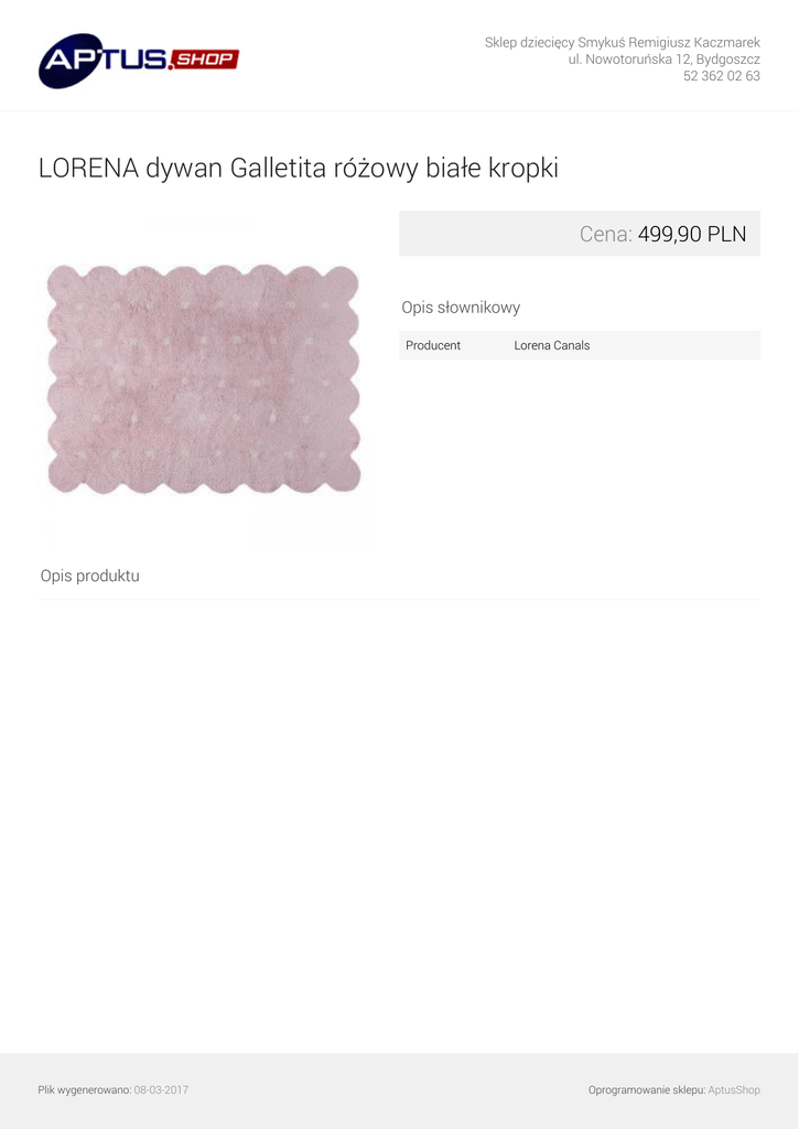 Sklep dziecięcy Smykuś Remigiusz Kaczmarek ul. Nowotoruńska 12, Bydgoszcz 52 362 02 63 LORENA dywan Galletita różowy białe kropki Cena: 499,90 PLN Opis słownikowy Producent Lorena Canals Opis produktu Plik wygenerowano: 08-03-2017 Powered by TCPDF (www.tcpdf.org) Oprogramowanie sklepu: AptusShop
