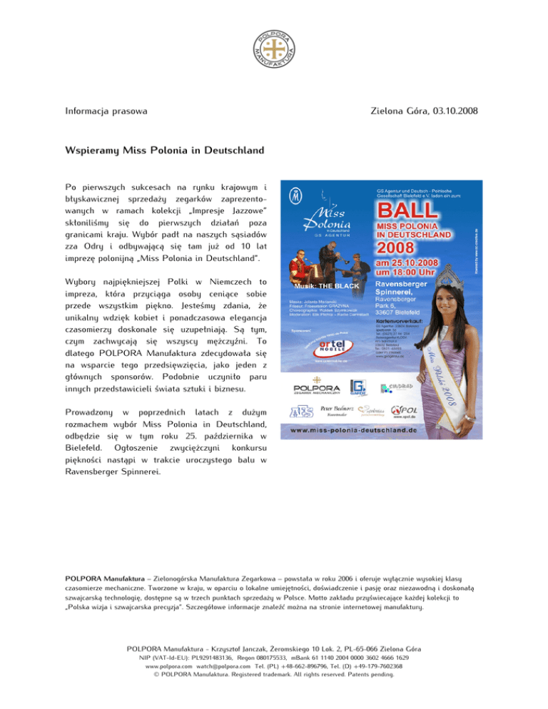 Informacja prasowa Zielona Góra, 03.10.2008 Wspieramy Miss Polonia in Deutschland Po pierwszych sukcesach na rynku krajowym i błyskawicznej sprzedaży zegarków zaprezentowanych w ramach kolekcji „Impresje Jazzowe” skłoniliśmy się do pierwszych działań poza granicami kraju. Wybór padł na naszych sąsiadów zza Odry i odbywającą się tam już od 10 lat imprezę polonijną „Miss Polonia in Deutschland”. Wybory najpiękniejszej Polki w Niemczech to impreza, która przyciąga osoby ceniące sobie przede wszystkim piękno. Jesteśmy zdania, że unikalny wdzięk kobiet i ponadczasowa elegancja czasomierzy doskonale się uzupełniają. Są tym, czym zachwycają się wszyscy mężczyźni. To dlatego POLPORA Manufaktura zdecydowała się na wsparcie tego przedsięwzięcia, jako jeden z głównych sponsorów. Podobnie uczyniło paru innych przedstawicieli świata sztuki i biznesu. Prowadzony w poprzednich latach z dużym rozmachem wybór Miss Polonia in Deutschland, odbędzie się w tym roku 25. października w Bielefeld. Ogłoszenie zwyciężczyni konkursu piękności nastąpi w trakcie uroczystego balu w Ravensberger Spinnerei. POLPORA Manufaktura – Zielonogórska Manufaktura Zegarkowa – powstała w roku 2006 i oferuje wyłącznie wysokiej klasy czasomierze mechaniczne. Tworzone w kraju, w oparciu o lokalne umiejętności, doświadczenie i pasję oraz niezawodną i doskonałą szwajcarską technologię, dostępne są w trzech punktach sprzedaży w Polsce. Motto zakładu przyświecające każdej kolekcji to „Polska wizja i szwajcarska precyzja”. Szczegółowe informacje znaleźć można na stronie internetowej manufaktury. POLPORA Manufaktura - Krzysztof Janczak, Żeromskiego 10 Lok. 2, PL-65-066 Zielona Góra NIP (VAT-Id-EU): PL9291483136, Regon 080175533, mBank 61 1140 2004 0000 3602 4666 1629 www.polpora.com [email protected] Tel. (PL) +48-662-896796, Tel. (D) +49-179-7602368 © POLPORA Manufaktura. Registered trademark. All rights reserved. Patents pending.