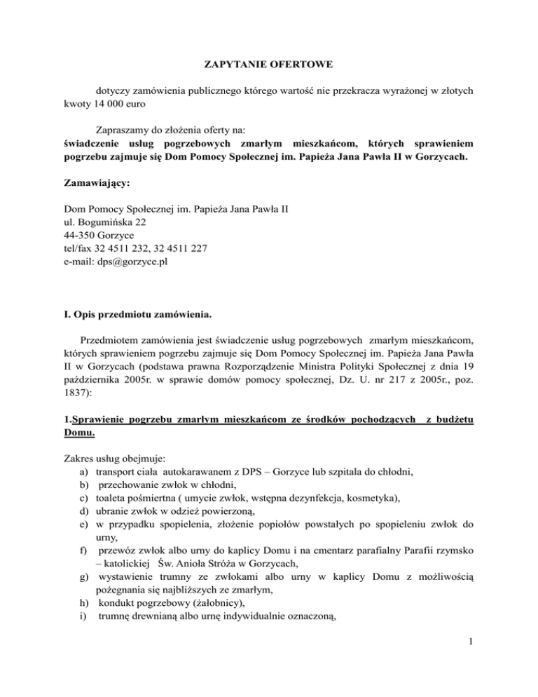 ZAPYTANIE OFERTOWE dotyczy zamówienia publicznego którego wartość nie przekracza wyrażonej w złotych kwoty 14 000 euro Zapraszamy do złożenia oferty na: świadczenie usług pogrzebowych zmarłym mieszkańcom, których sprawieniem pogrzebu zajmuje się Dom Pomocy Społecznej im. Papieża Jana Pawła II w Gorzycach. Zamawiający: Dom Pomocy Społecznej im. Papieża Jana Pawła II ul. Bogumińska 22 44-350 Gorzyce tel/fax 32 4511 232, 32 4511 227 e-mail: [email protected] I. Opis przedmiotu zamówienia. Przedmiotem zamówienia jest świadczenie usług pogrzebowych zmarłym mieszkańcom, których sprawieniem pogrzebu zajmuje się Dom Pomocy Społecznej im. Papieża Jana Pawła II w Gorzycach (podstawa prawna Rozporządzenie Ministra Polityki Społecznej z dnia 19 października 2005r. w sprawie domów pomocy społecznej, Dz. U. nr 217 z 2005r., poz. 1837): 1.Sprawienie pogrzebu zmarłym mieszkańcom ze środków pochodzących z budżetu Domu. Zakres usług obejmuje: a) transport ciała autokarawanem z DPS – Gorzyce lub szpitala do chłodni, b) przechowanie zwłok w chłodni, c) toaleta pośmiertna ( umycie zwłok, wstępna dezynfekcja, kosmetyka), d) ubranie zwłok w odzież powierzoną, e) w przypadku spopielenia, złożenie popiołów powstałych po spopieleniu zwłok do urny, f) przewóz zwłok albo urny do kaplicy Domu i na cmentarz parafialny Parafii rzymsko – katolickiej Św. Anioła Stróża w Gorzycach, g) wystawienie trumny ze zwłokami albo urny w kaplicy Domu z możliwością pożegnania się najbliższych ze zmarłym, h) kondukt pogrzebowy (żałobnicy), i) trumnę drewnianą albo urnę indywidualnie oznaczoną, 1 j) krzyż drewniany w przypadku pochówku w grobie ziemnym, k) tabliczkę z napisem, l) złożenie trumny lub urny z prochami do grobu. 2. Sprawienie pogrzebu zmarłym mieszkańcom ze środków z zasiłku pogrzebowego Zakres usług obejmuje: a) transport ciała autokarawanem z DPS – Gorzyce lub szpitala do chłodni, b) przechowanie zwłok w chłodni, c) toaleta pośmiertna ( umycie zwłok, wstępna dezynfekcja, kosmetyka), d) ubranie zwłok w odzież powierzoną, e) w przypadku spopielenia, złożenie popiołów powstałych po spopieleniu zwłok do urny, f) przewóz zwłok albo urny na cmentarz Parafii rzymsko – katolickiej Św. Anioła Stróża w Gorzycach. g) wystawienie trumny ze zwłokami albo urny w kaplicy Domu z możliwością pożegnania się najbliższych ze zmarłym, h) kondukt pogrzebowy (żałobnicy), i) trumnę dębową albo urnę indywidualnie oznaczoną, j) krzyż drewniany w przypadku pochówku w grobie ziemnym, k) tabliczkę z napisem, l) wiązankę w formie palmy na wieko trumny z 16 kwiatów żywych na podłożu świerkowym z elementami dekoracji ( min. szarfą - z napisem do ustalenia), m) zapewnienie odzieży i obuwia zmarłemu w przypadku jego braku, n) złożenie trumny lub urny z prochami do grobu. II. Warunki realizacji zamówienia. 1. Ze względu na szczególny charakter usług jakimi są usługi pogrzebowe, liczba dokonanych pochówków jest zmienna. 2. Transport zwłok albo urny na cmentarz poza miejscowość Gorzyce - zgodnie z wolą zmarłego, stanowić będzie odrębne zamówienie. Podać należy cenę brutto 1 km transportu. 3. Podstawą wykonania zamówienia będzie zlecenie telefoniczne i pisemne przez Zamawiającego określające miejsce pochówku jak również zakres wykonanych usług. Po otrzymaniu zlecenia Wykonawca ma obowiązek niezwłocznie podjąć czynności związane z wykonaniem zleconych usług. 4. Wykonawca wystawi fakturę VAT po wykonaniu usługi. 5. Zamawiający zobowiązuje się zapłacić należność na konto Wykonawcy podane na fakturze VAT, w terminie 14 dni od daty dostarczenia prawidłowo wystawionej przez Wykonawcę faktury VAT. 2 6. Wykonawca zobowiązany jest do wykonywania usługi zgodnie z obowiązującymi przepisami prawa w tym zakresie, w szczególności: a) ustawy z dnia 31 stycznia 1959 r. o cmentarzach i chowaniu zmarłych, b) rozporządzenia Ministra Zdrowia w sprawie postępowania ze zwłokami i szczątkami ludzkimi z dnia 7 grudnia 2001r., c) rozporządzeniem Ministra Zdrowia z dnia 27 grudnia 2007r. w sprawie wydawania pozwoleń i zaświadczeń na przewóz zwłok i szczątków ludzkich . III. Termin realizacji zamówienia: od daty podpisania umowy z wybraną firmą do 31.12.2012r. IV. Kryterium wyboru oferty 1. Najkorzystniejsza cena. 2. Każdy zakres usług opisany w p. nr I ( przedmiot zamówienia) podlegał będzie odrębnej ocenie. 3. W przypadku usług określonych w p. nr I, ppkt 2 niniejszego zapytania maksymalna cena nie może przekroczyć 50% zasiłku pogrzebowego. V. Sposób przygotowania i składania oferty. 1.Wykonawca zobowiązany jest skalkulować cenę oferty tak, aby obejmowała wszystkie koszty, jakie Wykonawca może ponieść przy realizacji zamówienia. Cenę brutto należy podać w złotych polskich. Cenę każdej oferty stanowi suma wartości wszystkich jej elementów, zawierająca wszystkie koszty niezbędne do wykonania zamówienia w pełnym zakresie. 2. Oferty należy składać w formie pisemnej, za pośrednictwem poczty lub osobiście na adres: Dom Pomocy Społecznej im. Papieża Jana Pawła II ul. Bogumińska 22 44-350 Gorzyce w terminie do dnia 25 lipca 2012 roku do godz. 15:00. 3. Kompletna oferta musi zawierać: 1) formularz oferty sporządzony na podstawie wzoru stanowiącego załącznik nr 1 do zapytania ofertowego, 2) stosowne pełnomocnictwa w przypadku, gdy ofertę podpisuje osoba działająca w imieniu wykonawcy lub gdy ofertę podpisuje pełnomocnik osoby fizycznej, 3) w przypadku wykonawców wspólnie ubiegających się o udzielenie zamówienia, dokument ustanawiający pełnomocnika do reprezentowania ich w postępowaniu o 3 udzielenie zamówienia albo reprezentowania w postępowaniu i zawarcia umowy w sprawie niniejszego zapytania ofertowego. 4. Wykonawcy ubiegający się o zamówienie muszą spełniać niżej wymienione warunki: 1) posiadać upraw