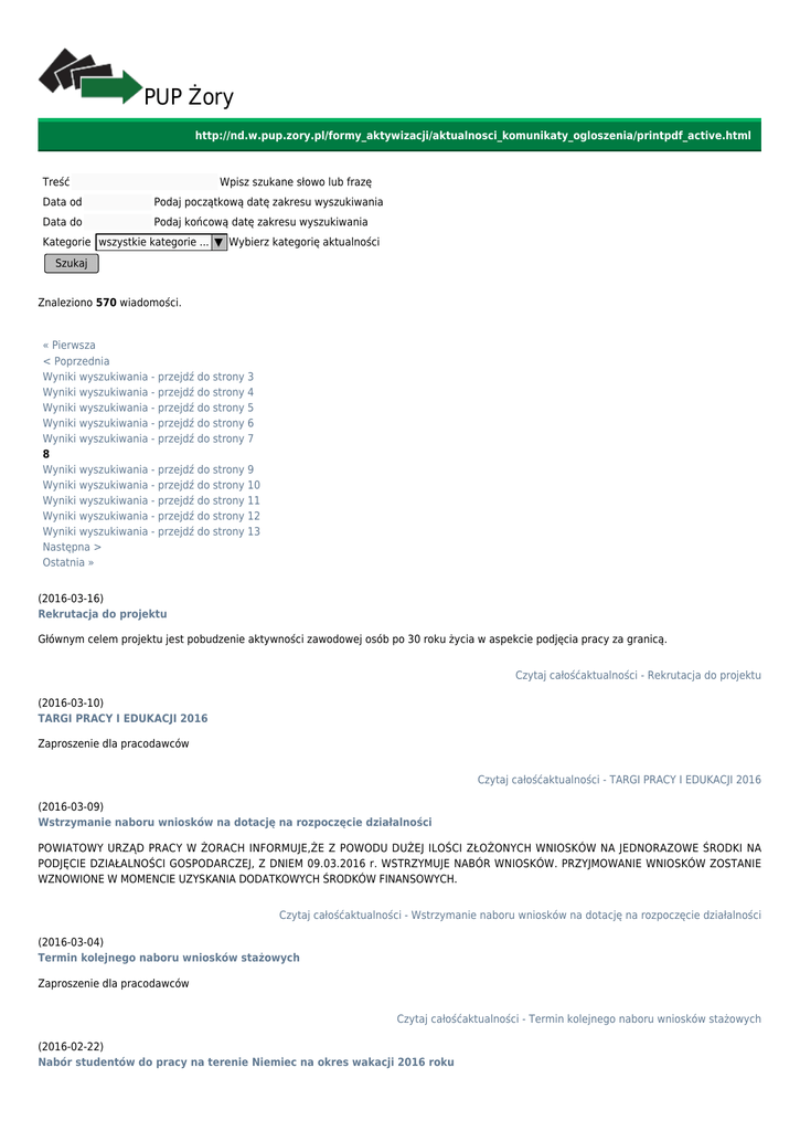 PUP Żory http://nd.w.pup.zory.pl/formy_aktywizacji/aktualnosci_komunikaty_ogloszenia/printpdf_active.html Treść Wpisz szukane słowo lub frazę Data od Podaj początkową datę zakresu wyszukiwania Data do Podaj końcową datę zakresu wyszukiwania Kategorie wszystkie kategorie ... ▼ Wybierz kategorię aktualności Szukaj Znaleziono 570 wiadomości. « Pierwsza < Poprzednia Wyniki wyszukiwania - przejdź do strony 3 Wyniki wyszukiwania - przejdź do strony 4 Wyniki wyszukiwania - przejdź do strony 5 Wyniki wyszukiwania - przejdź do strony 6 Wyniki wyszukiwania - przejdź do strony 7 8 Wyniki wyszukiwania - przejdź do strony 9 Wyniki wyszukiwania - przejdź do strony 10 Wyniki wyszukiwania - przejdź do strony 11 Wyniki wyszukiwania - przejdź do strony 12 Wyniki wyszukiwania - przejdź do strony 13 Następna > Ostatnia » (2016-03-16) Rekrutacja do projektu Głównym celem projektu jest pobudzenie aktywności zawodowej osób po 30 roku życia w aspekcie podjęcia pracy za granicą. Czytaj całośćaktualności - Rekrutacja do projektu (2016-03-10) TARGI PRACY I EDUKACJI 2016 Zaproszenie dla pracodawców Czytaj całośćaktualności - TARGI PRACY I EDUKACJI 2016 (2016-03-09) Wstrzymanie naboru wniosków na dotację na rozpoczęcie działalności POWIATOWY URZĄD PRACY W ŻORACH INFORMUJE,ŻE Z POWODU DUŻEJ ILOŚCI ZŁOŻONYCH WNIOSKÓW NA JEDNORAZOWE ŚRODKI NA PODJĘCIE DZIAŁALNOŚCI GOSPODARCZEJ, Z DNIEM 09.03.2016 r. WSTRZYMUJE NABÓR WNIOSKÓW. PRZYJMOWANIE WNIOSKÓW ZOSTANIE WZNOWIONE W MOMENCIE UZYSKANIA DODATKOWYCH ŚRODKÓW FINANSOWYCH. Czytaj całośćaktualności - Wstrzymanie naboru wniosków na dotację na rozpoczęcie działalności (2016-03-04) Termin kolejnego naboru wniosków stażowych Zaproszenie dla pracodawców Czytaj całośćaktualności - Termin kolejnego naboru wniosków stażowych (2016-02-22) Nabór studentów do pracy na terenie Niemiec na okres wakacji 2016 roku Informacja Wojewódzkiego Urzędu Pracy w Katowicach Czytaj całośćaktualności - Nabór studentów do pracy na terenie Niemiec na okres wakacji 2016 roku (2016-02-08) PFRON Powiatowy Urząd Pracy ogłasza nabór wniosków na aktywizacje zawodową osób niepełnosprawnych Czytaj całośćaktualności - PFRON (2016-01-15) Informacja dla pracodawców Informacja dla pracodawców, organizacji pracodawców, organizacji związkowych, jednostek organizacyjnych pomocy społecznej oraz centrów integracji społecznej Czytaj całośćaktualności - Informacja dla pracodawców (2016-01-15) Nabory wniosków na staż zaproszenie dla pracodawców Czytaj całośćaktualności - Nabory wniosków na staż (2016-01-11) Nabór wniosków o przyznanie środków z KFS Nabór wniosków o przyznanie środków z KFS Czytaj całośćaktualności - Nabór wniosków o przyznanie środków z KFS (2016-01-05) Elektroniczne zwolnienia lekarskie Od stycznia 2016r. lekarze mogą wystawiać elektroniczne zwolnienia lekarskie, nazywane e-ZLA. Czytaj całośćaktualności - Elektroniczne zwolnienia lekarskie « Pierwsza < Poprzednia Wyniki wyszukiwania - przejdź do strony 3 Wyniki wyszukiwania - przejdź do strony 4 Wyniki wyszukiwania - przejdź do strony 5 Wyniki wyszukiwania - przejdź do strony 6 Wyniki wyszukiwania - przejdź do strony 7 8 Wyniki wyszukiwania - przejdź do strony 9 Wyniki wyszukiwania - przejdź do strony 10 Wyniki wyszukiwania - przejdź do strony 11 Wyniki wyszukiwania - przejdź do strony 12 Wyniki wyszukiwania - przejdź do strony 13 Następna > Ostatnia »