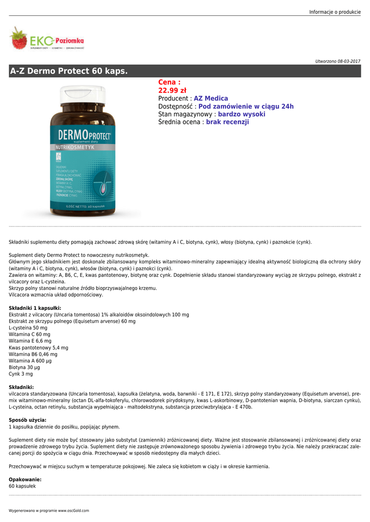 Informacje o produkcie Utworzono 08-03-2017 A-Z Dermo Protect 60 kaps. Cena : 22.99 zł Producent : AZ Medica Dostępność : Pod zamówienie w ciągu 24h Stan magazynowy : bardzo wysoki Średnia ocena : brak recenzji Składniki suplementu diety pomagają zachować zdrową skórę (witaminy A i C, biotyna, cynk), włosy (biotyna, cynk) i paznokcie (cynk). Suplement diety Dermo Protect to nowoczesny nutrikosmetyk. Głównym jego składnikiem jest doskonale zbilansowany kompleks witaminowo-mineralny zapewniający idealną aktywność biologiczną dla ochrony skóry (witaminy A i C, biotyna, cynk), włosów (biotyna, cynk) i paznokci (cynk). Zawiera on witaminy: A, B6, C, E, kwas pantotenowy, biotynę oraz cynk. Dopełnienie składu stanowi standaryzowany wyciąg ze skrzypu polnego, ekstrakt z vilcacory oraz L-cysteina. Skrzyp polny stanowi naturalne źródło bioprzyswajalnego krzemu. Vilcacora wzmacnia układ odpornościowy. Składniki 1 kapsułki: Ekstrakt z vilcacory (Uncaria tomentosa) 1% alkaloidów oksoindolowych 100 mg Ekstrakt ze skrzypu polnego (Equisetum arvense) 60 mg L-cysteina 50 mg Witamina C 60 mg Witamina E 6,6 mg Kwas pantotenowy 5,4 mg Witamina B6 0,46 mg Witamina A 600 µg Biotyna 30 µg Cynk 3 mg Składniki: vilcacora standaryzowana (Uncaria tomentosa), kapsułka (żelatyna, woda, barwniki - E 171, E 172), skrzyp polny standaryzowany (Equisetum arvense), premix witaminowo-mineralny (octan DL-alfa-tokoferylu, chlorowodorek pirydoksyny, kwas L-askorbinowy, D-pantotenian wapnia, D-biotyna, siarczan cynku), L-cysteina, octan retinylu, substancja wypełniająca - maltodekstryna, substancja przeciwzbrylająca - E 470b. Sposób użycia: 1 kapsułka dziennie do posiłku, popijając płynem. Suplement diety nie może być stosowany jako substytut (zamiennik) zróżnicowanej diety. Ważne jest stosowanie zbilansowanej i zróżnicowanej diety oraz prowadzenie zdrowego trybu życia. Suplement diety nie zastępuje zrównoważonego sposobu żywienia i zdrowego trybu życia. Nie należy przekraczać zalecanej porcji do spożycia w ciągu dnia. Przechowywać w sposób niedostępny dla małych dzieci. Przechowywać w miejscu suchym w temperaturze pokojowej. Nie zaleca się kobietom w ciąży i w okresie karmienia. Opakowanie: 60 kapsułek Wygenerowano w programie www.oscGold.com