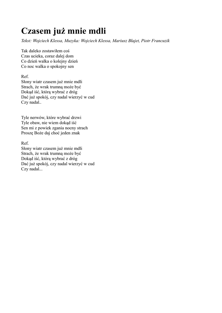 Czasem już mnie mdli Tekst: Wojciech Klessa, Muzyka: Wojciech Klessa, Mariusz Błajet, Piotr Francuzik Tak daleko zostawiłem coś Czas ucieka, coraz dalej dom Co dzień walka o kolejny dzień Co noc walka o spokojny sen Ref. Słony wiatr czasem już mnie mdli Strach, że wrak trumną może być Dokąd iść, którą wybrać z dróg Dać już spokój, czy nadal wierzyć w cud Czy nadal.. Tyle nerwów, które wybrać drzwi Tyle obaw, nie wiem dokąd iść Sen mi z powiek zgania nocny strach Proszę Boże daj choć jeden znak Ref. Słony wiatr czasem już mnie mdli Strach, że wrak trumną może być Dokąd iść, którą wybrać z dróg Dać już spokój, czy nadal wierzyć w cud Czy nadal...