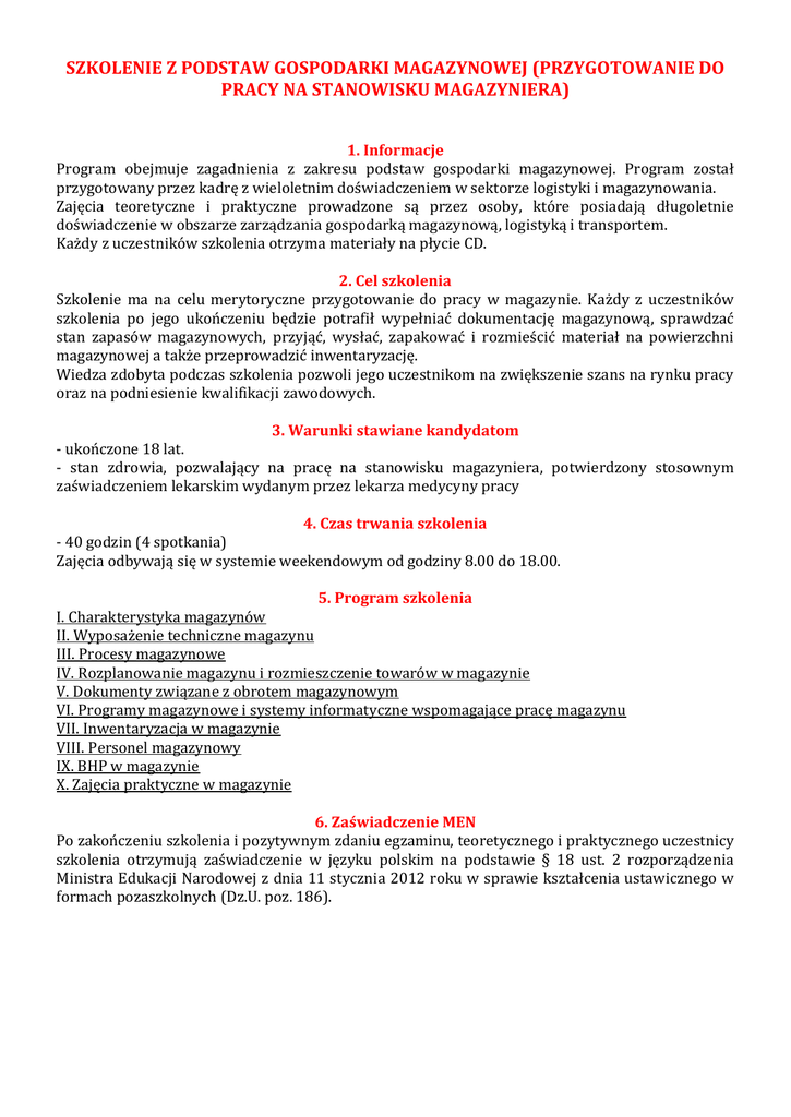 SZKOLENIE Z PODSTAW GOSPODARKI MAGAZYNOWEJ (PRZYGOTOWANIE DO PRACY NA STANOWISKU MAGAZYNIERA) 1. Informacje Program obejmuje zagadnienia z zakresu podstaw gospodarki magazynowej. Program został przygotowany przez kadrę z wieloletnim doświadczeniem w sektorze logistyki i magazynowania. Zajęcia teoretyczne i praktyczne prowadzone są przez osoby, które posiadają długoletnie doświadczenie w obszarze zarządzania gospodarką magazynową, logistyką i transportem. Każdy z uczestników szkolenia otrzyma materiały na płycie CD. 2. Cel szkolenia Szkolenie ma na celu merytoryczne przygotowanie do pracy w magazynie. Każdy z uczestników szkolenia po jego ukończeniu będzie potrafił wypełniać dokumentację magazynową, sprawdzać stan zapasów magazynowych, przyjąć, wysłać, zapakować i rozmieścić materiał na powierzchni magazynowej a także przeprowadzić inwentaryzację. Wiedza zdobyta podczas szkolenia pozwoli jego uczestnikom na zwiększenie szans na rynku pracy oraz na podniesienie kwalifikacji zawodowych. 3. Warunki stawiane kandydatom - ukończone 18 lat. - stan zdrowia, pozwalający na pracę na stanowisku magazyniera, potwierdzony stosownym zaświadczeniem lekarskim wydanym przez lekarza medycyny pracy 4. Czas trwania szkolenia - 40 godzin (4 spotkania) Zajęcia odbywają się w systemie weekendowym od godziny 8.00 do 18.00. 5. Program szkolenia I. Charakterystyka magazynów II. Wyposażenie techniczne magazynu III. Procesy magazynowe IV. Rozplanowanie magazynu i rozmieszczenie towarów w magazynie V. Dokumenty związane z obrotem magazynowym VI. Programy magazynowe i systemy informatyczne wspomagające pracę magazynu VII. Inwentaryzacja w magazynie VIII. Personel magazynowy IX. BHP w magazynie X. Zajęcia praktyczne w magazynie 6. Zaświadczenie MEN Po zakończeniu szkolenia i pozytywnym zdaniu egzaminu, teoretycznego i praktycznego uczestnicy szkolenia otrzymują zaświadczenie w języku polskim na podstawie § 18 ust. 2 rozporządzenia Ministra Edukacji Narodowej z dnia 11 stycznia 2012 roku w sprawie kształcenia ustawicznego w formach pozaszkolnych (Dz.U. poz. 186).