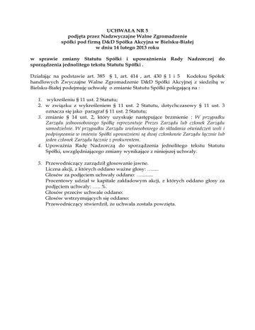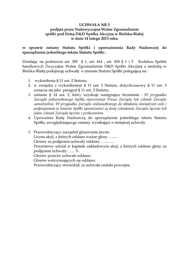 UCHWAŁA NR 5 podjęta przez Nadzwyczajne Walne Zgromadzenie spółki pod firmą D&D Spółka Akcyjna w Bielsku-Białej w dniu 14 lutego 2013 roku w sprawie zmiany Statutu Spółki i upoważnienia Rady Nadzorczej do sporządzenia jednolitego tekstu Statutu Spółki . Działając na podstawie art. 385 § 1, art. 414 , art. 430 § 1 i 5 Kodeksu Spółek handlowych Zwyczajne Walne Zgromadzenie D&D Spółki Akcyjnej z siedzibą w Bielsku-Białej podejmuję uchwałę o zmianie Statutu Spółki polegającą na : 1. wykreśleniu § 11 ust. 2 Statutu; 2. w związku z wykreśleniem § 11 ust. 2 Statutu, dotychczasowy § 11 ust. 3 oznacza się jako paragraf § 11 ust. 2 Statutu; 3. zmianie § 14 ust. 2, który uzyskuje następujące brzmienie : W przypadku Zarządu jednoosobowego Spółkę reprezentuje Prezes Zarządu lub członek Zarządu samodzielnie. W przypadku Zarządu wieloosobowego do składania oświadczeń woli i podpisywania w imieniu Spółki upoważnieni są dwaj członkowie Zarządu łącznie lub jeden członek Zarządu łącznie z prokurentem. 4. Upoważnia Radę Nadzorczą do sporządzenia jednolitego tekstu Statutu Spółki, uwzględniającego zmiany wynikające z niniejszej uchwały. 5. Przewodniczący zarządził głosowanie jawne. Liczna akcji, z których oddano ważne głosy: …..... Głosów za podjęciem uchwały oddano: …......... Procentowy udział w kapitale zakładowym akcji, z których oddano głosy za podjęciem uchwały: ….. %. Głosów przeciw uchwale oddano: Głosów wstrzymujących się oddano: Przewodniczący stwierdził, że uchwała została powzięta.