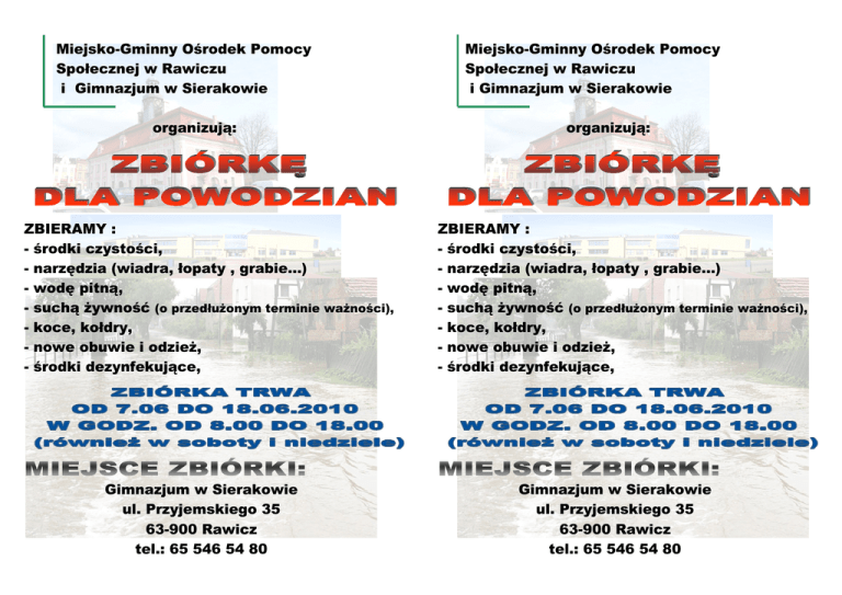 Miejsko-Gminny Ośrodek Pomocy Społecznej w Rawiczu i Gimnazjum w Sierakowie organizują: ZBIERAMY : - środki czystości, - narzędzia (wiadra, łopaty , grabie...) - wodę pitną, - suchą żywność (o przedłużonym terminie ważności), - koce, kołdry, - nowe obuwie i odzież, - środki dezynfekujące, Gimnazjum w Sierakowie ul. Przyjemskiego 35 63-900 Rawicz tel.: 65 546 54 80 Miejsko-Gminny Ośrodek Pomocy Społecznej w Rawiczu i Gimnazjum w Sierakowie organizują: ZBIERAMY : - środki czystości, - narzędzia (wiadra, łopaty , grabie...) - wodę pitną, - suchą żywność (o przedłużonym terminie ważności), - koce, kołdry, - nowe obuwie i odzież, - środki dezynfekujące, Gimnazjum w Sierakowie ul. Przyjemskiego 35 63-900 Rawicz tel.: 65 546 54 80