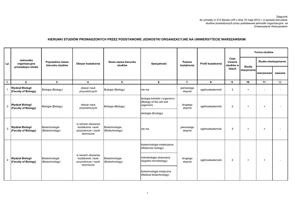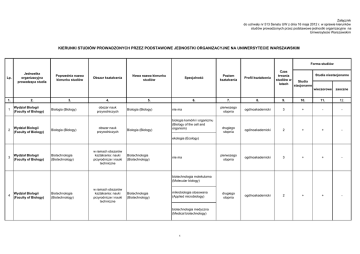 Załącznik do uchwały nr 513 Senatu UW z dnia 16 maja 2012 r. w sprawie kierunków studiów prowadzonych przez podstawowe jednostki organizacyjne na Uniwersytecie Warszawskim KIERUNKI STUDIÓW PROWADZONYCH PRZEZ PODSTAWOWE JEDNOSTKI ORGANIZACYJNE NA UNIWERSYTECIE WARSZAWSKIM Forma studiów Lp. 1. 1 2 Jednostka organizacyjna prowadząca studia 2. Wydział Biologii (Faculty of Biology) Wydział Biologii (Faculty of Biology) Poprzednia nazwa kierunku studiów 3. Biologia (Biology) Biologia (Biology) Obszar kształcenia 4. obszar nauk przyrodniczych obszar nauk przyrodniczych Nowa nazwa kierunku studiów Specjalność 5. 6. Biologia (Biology) nie ma Biologia (Biology) biologia komórki i organizmu (Biology of the cell and organism) Poziom kształcenia Profil kształcenia Czas trwania studiów w latach Studia niestacjonarne Studia stacjonarne wieczorowe zaoczne 7. 8. 9. 10. 11. 12. pierwszego stopnia ogólnoakademicki 3 + - - drugiego stopnia ogólnoakademicki 2 + + - pierwszego stopnia ogólnoakademicki 3 + + - drugiego stopnia ogólnoakademicki 2 + + - ekologia (Ecology) 3 Wydział Biologii (Faculty of Biology) Biotechnologia (Biotechnology) w ramach obszarów kształcenia: nauki przyrodnicze i nauki techniczne Biotechnologia (Biotechnology) nie ma biotechnologia molekularna (Molecular biology) 4 Wydział Biologii (Faculty of Biology) Biotechnologia (Biotechnology) w ramach obszarów kształcenia: nauki przyrodnicze i nauki techniczne Biotechnologia (Biotechnology) mikrobiologia stosowana (Applied microbiology) biotechnologia medyczna (Medical biotechnology) 1 1. 2. 5 Wydział Biologii (Faculty of Biology) 6 Wydział Biologii wspólnie z Wydziałem Chemii i Wydziałem Zarządzania (Faculty of Biology jointly with Faculty of Chemistry and Faculty of Management) 7 Wydział Biologii wspólnie z Wydziałem Chemii i Wydziałem Zarządzania (Faculty of Biology jointly with Faculty of Chemistry and Faculty of Management) 8 3. Ochrona Środowiska (Environmental protection) 4. obszar nauk przyrodniczych 5. Ochrona Przyrody (Nature conservation) 6. nie ma 7. 8. 9. 10. 11. 12. pierwszego stopnia ogólnoakademicki 3 + - - Makrokierunek Zarządzanie Środowiskiem (Environmental management) w ramach obszarów kształcenia: nauki przyrodnicze i nauki społeczne Zarządzanie Środowiskiem nie ma (Environmental management) drugiego stopnia ogólnoakademicki 2 + - + Makrokierunek Zarządzanie Środowiskiem (Environmental management) w ramach obszarów kształcenia: nauki przyrodnicze i nauki społeczne Environmental management (Zarządzanie Środowiskiem) nie ma drugiego stopnia ogólnoakademicki 2 + - + Wydział Chemii (Faculty of Chemistry) Chemia (Chemistry) obszar nauk ścisłych Chemia (Chemistry) nie ma pierwszego stopnia ogólnoakademicki 3 + - - 9 Wydział Chemii (Faculty of Chemistry) Chemia (Chemistry) obszar nauk ścisłych Chemia (Chemistry) nie ma drugiego stopnia ogólnoakademicki 2 + - - 10 Wydział Chemii (Faculty of Chemistry) Chemia (Chemistry) obszar nauk ścisłych Chemistry (Chemia) nie ma drugiego stopnia ogólnoakademicki 2 + - - 2 1. 2. 3. Wydział Chemii wspólnie z Wydziałem 11 Fizyki (Faculty of Chemistry jointly with Faculty of Physics) Makrokierunek Energetyka i Chemia Jądrowa (Nuclear power engineering and nuclear chemistry) Wydział Chemii wspólnie z Wydziałem 12 Fizyki (Faculty of Chemistry jointly with Faculty of Physics) Makrokierunek Energetyka i Chemia Jądrowa (Nuclear power engineering and nuclear chemistry) 4. 5. 6. 7. 8. 9. 10. 11. 12. obszar nauk ścisłych Energetyka i Chemia Jądrowa (Nuclear power engineering nie ma and nuclear chemistry) pierwszego stopnia ogólnoakademicki 3 + - - obszar nauk ścisłych Energetyka i Chemia Jądrowa (Nuclear power engineering nie ma and nuclear chemistry) drugiego stopnia ogólnoakademicki 2 + - - pierwszego stopnia praktyczny 3 + + + Wydział Dziennikarstwa i Nauk 13 Politycznych (Faculty of Journalism and Political Science) dziennikarska (Journalism) Instytut Dziennikarstwa 14 (Institute of Journalism) Dziennikarstwo i Komunikacja Społeczna (Journalism and social communication) w ramach obszarów kształcenia: nauki społeczne i nauki humanistyczne Dziennikarstwo i Komunikacja public relations i marketing medialny (Public relations and Społeczna (Journalism media marketing) and social communication) fotografia prasowa reklamowa i wydawnicza (Journalism, advertising and press photography) 3 1. 2. Instytut Dziennikarstwa 15 (Institute of Journalism) 3. Dziennikarstwo i Komunikacja Społeczna (Journalism and social communication) 4. w ramach obszarów kształcenia: nauki społeczne i nauki humanistyczne 5. Dziennikarstwo i Komunikacja Społeczna (Journalism and social communication) 6. 7. 8. 9. 10. 11. dziennikarska (Journalism) + public relations i marketing medialny (Public relations and media marketing) - fotografia prasowa, reklamowa i wydawnicza (Journalism, advertising and press photography) drugiego stopnia ogólnoakademicki 2 + + - dokumentalistyka (Documentary film making) 16 Instytut Nauk Politycznych (Institute of Political Science) Politologia (Political science) obszar nauk społecznych Politologia (Political science) 12. nie ma - pierwszego stopnia ogólnoakademicki 3 + + + drugiego stopnia ogólnoakademicki 2 + + + pierwszego stopnia praktyczny 3 + + + marketing i doradztwo polityczne (Marketing and political counseling) Instytut Nauk Politycznych (Institute 17 of Political Science) Politologia (Political science) obszar nauk społecznych Politologia (Political science) studia europejskie (European studies) administracja publiczna (Public administration) Instytut Nauk Politycznych (Institute 18 of Political Science) Bezpieczeństwo Wewnętrzne (Internal security) obszar nauk społecznych Bezpieczeństwo Wewnętrzne nie ma (Internal security) 4 1. 2. Instytut Nauk Politycznych (Institute 19 of Political Science) 3. 4. 5. 6. 7. 8. 9. 10. 11. 12. drugiego stopnia ogólnoakademicki 2 + + + Bezpieczeństwo Wewnęt