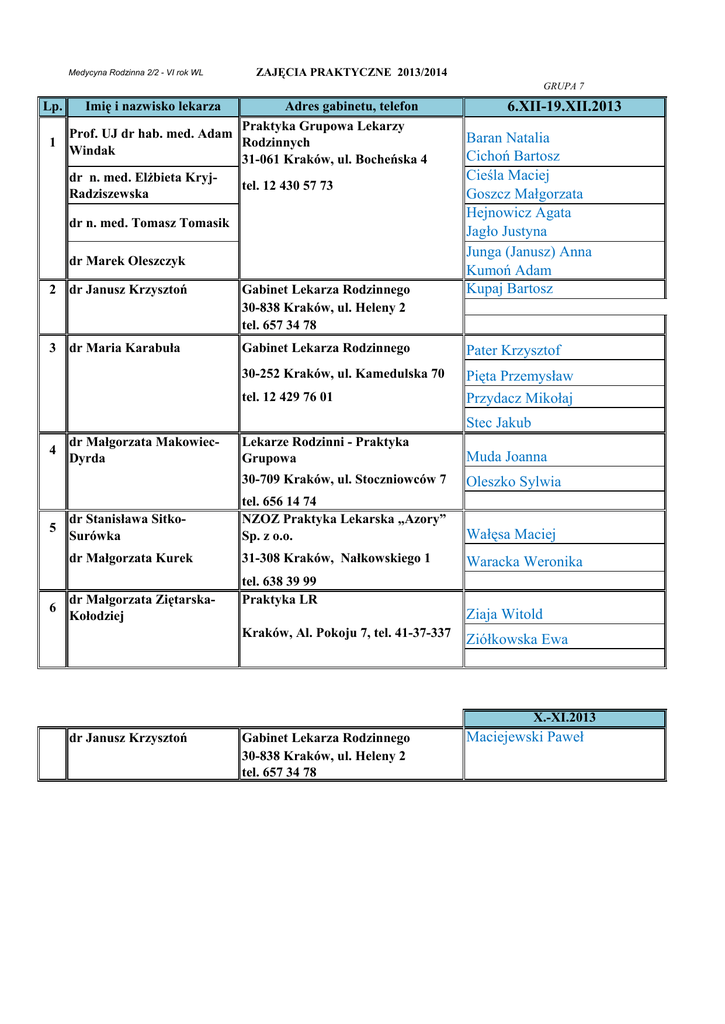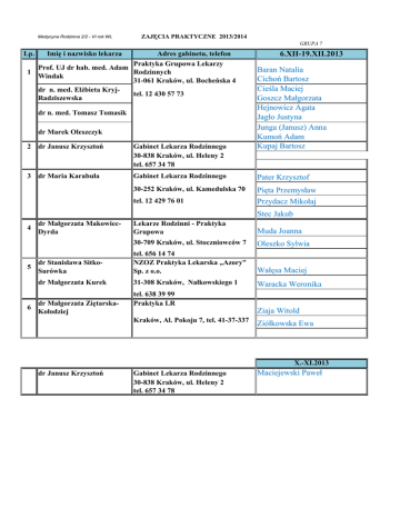 Medycyna Rodzinna 2/2 - VI rok WL ZAJĘCIA PRAKTYCZNE 2013/2014 GRUPA 7 Lp. Imię i nazwisko lekarza Adres gabinetu, telefon Praktyka Grupowa Lekarzy Prof. UJ dr hab. med. Adam 1 Rodzinnych Windak 31-061 Kraków, ul. Bocheńska 4 dr n. med. Elżbieta Kryjtel. 12 430 57 73 Radziszewska dr n. med. Tomasz Tomasik dr Marek Oleszczyk 6.XII-19.XII.2013 Baran Natalia Cichoń Bartosz Cieśla Maciej Goszcz Małgorzata Hejnowicz Agata Jagło Justyna Junga (Janusz) Anna Kumoń Adam Kupaj Bartosz 2 dr Janusz Krzysztoń Gabinet Lekarza Rodzinnego 30-838 Kraków, ul. Heleny 2 tel. 657 34 78 3 dr Maria Karabuła Gabinet Lekarza Rodzinnego Pater Krzysztof 30-252 Kraków, ul. Kamedulska 70 Pięta Przemysław Przydacz Mikołaj tel. 12 429 76 01 Stec Jakub 4 5 6 dr Małgorzata MakowiecDyrda Lekarze Rodzinni - Praktyka Grupowa Muda Joanna 30-709 Kraków, ul. Stoczniowców 7 Oleszko Sylwia dr Stanisława SitkoSurówka tel. 656 14 74 NZOZ Praktyka Lekarska „Azory” Sp. z o.o. Wałęsa Maciej dr Małgorzata Kurek 31-308 Kraków, Nałkowskiego 1 Waracka Weronika dr Małgorzata ZiętarskaKołodziej tel. 638 39 99 Praktyka LR Ziaja Witold Kraków, Al. Pokoju 7, tel. 41-37-337 Ziółkowska Ewa X.-XI.2013 dr Janusz Krzysztoń Gabinet Lekarza Rodzinnego 30-838 Kraków, ul. Heleny 2 tel. 657 34 78 Maciejewski Paweł