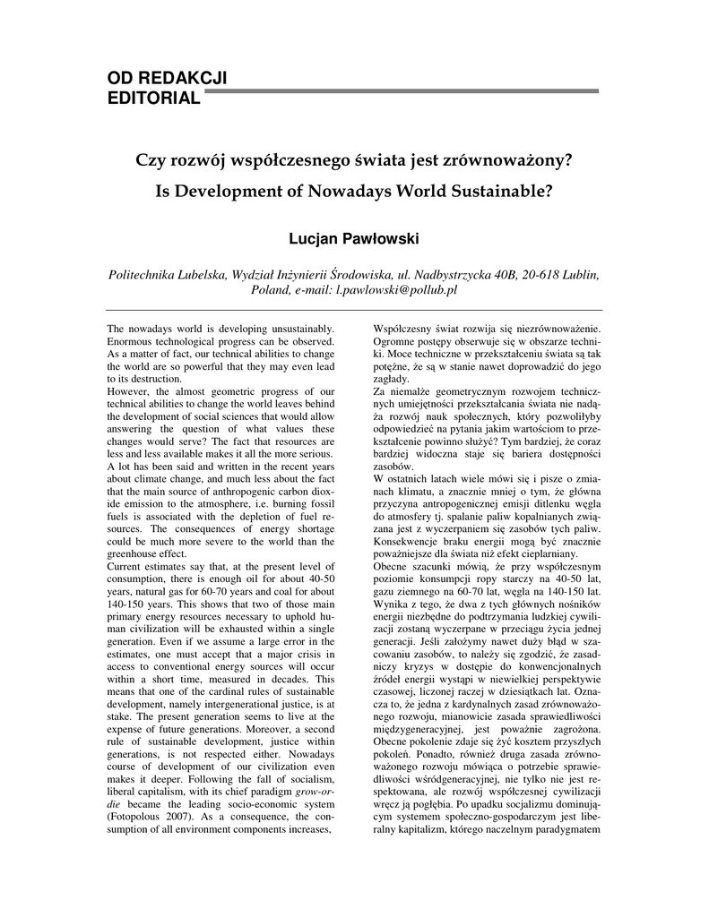 OD REDAKCJI EDITORIAL Czy rozwój współczesnego świata jest zrównowaŜony? Is Development of Nowadays World Sustainable? Lucjan Pawłowski Politechnika Lubelska, Wydział InŜynierii Środowiska, ul. Nadbystrzycka 40B, 20-618 Lublin, Poland, e-mail: [email protected] The nowadays world is developing unsustainably. Enormous technological progress can be observed. As a matter of fact, our technical abilities to change the world are so powerful that they may even lead to its destruction. However, the almost geometric progress of our technical abilities to change the world leaves behind the development of social sciences that would allow answering the question of what values these changes would serve? The fact that resources are less and less available makes it all the more serious. A lot has been said and written in the recent years about climate change, and much less about the fact that the main source of anthropogenic carbon dioxide emission to the atmosphere, i.e. burning fossil fuels is associated with the depletion of fuel resources. The consequences of energy shortage could be much more severe to the world than the greenhouse effect. Current estimates say that, at the present level of consumption, there is enough oil for about 40-50 years, natural gas for 60-70 years and coal for about 140-150 years. This shows that two of those main primary energy resources necessary to uphold human civilization will be exhausted within a single generation. Even if we assume a large error in the estimates, one must accept that a major crisis in access to conventional energy sources will occur within a short time, measured in decades. This means that one of the cardinal rules of sustainable development, namely intergenerational justice, is at stake. The present generation seems to live at the expense of future generations. Moreover, a second rule of sustainable development, justice within generations, is not respected either. Nowadays course of development of our civilization even makes it deeper. Following the fall of socialism, liberal capitalism, with its chief paradigm grow-ordie became the leading socio-economic system (Fotopolous 2007). As a consequence, the consumption of all environment components increases, Współczesny świat rozwija się niezrównowaŜenie. Ogromne postępy obserwuje się w obszarze techniki. Moce techniczne w przekształceniu świata są tak potęŜne, Ŝe są w stanie nawet doprowadzić do jego zagłady. Za niemalŜe geometrycznym rozwojem technicznych umiejętności przekształcania świata nie nadąŜa rozwój nauk społecznych, który pozwoliłyby odpowiedzieć na pytania jakim wartościom to przekształcenie powinno słuŜyć? Tym bardziej, Ŝe coraz bardziej widoczna staje się bariera dostępności zasobów. W ostatnich latach wiele mówi się i pisze o zmianach klimatu, a znacznie mniej o tym, Ŝe główna przyczyna antropogenicznej emisji ditlenku węgla do atmosfery tj. spalanie paliw kopalnianych związana jest z wyczerpaniem się zasobów tych paliw. Konsekwencje braku energii mogą być znacznie powaŜniejsze dla świata niŜ efekt cieplarniany. Obecne szacunki mówią, Ŝe przy współczesnym poziomie konsumpcji ropy starczy na 40-50 lat, gazu ziemnego na 60-70 lat, węgla na 140-150 lat. Wynika z tego, Ŝe dwa z tych głównych nośników energii niezbędne do podtrzymania ludzkiej cywilizacji zostaną wyczerpane w przeciągu Ŝycia jednej generacji. Jeśli załoŜymy nawet duŜy błąd w szacowaniu zasobów, to naleŜy się zgodzić, Ŝe zasadniczy kryzys w dostępie do konwencjonalnych źródeł energii wystąpi w niewielkiej perspektywie czasowej, liczonej raczej w dziesiątkach lat. Oznacza to, Ŝe jedna z kardynalnych zasad zrównowaŜonego rozwoju, mianowicie zasada sprawiedliwości międzygeneracyjnej, jest powaŜnie zagroŜona. Obecne pokolenie zdaje się Ŝyć kosztem przyszłych pokoleń. Ponadto, równieŜ druga zasada zrównowaŜonego rozwoju mówiąca o potrzebie sprawiedliwości wśródgeneracyjnej, nie tylko nie jest respektowana, ale rozwój współczesnej cywilizacji wręcz ją pogłębia. Po upadku socjalizmu dominującym systemem społeczno-gospodarczym jest liberalny kapitalizm, którego naczelnym paradygmatem 10 Pawłowski/Problemy Ekorozwoju/Problems of Sustainable Development 2/2010, 9-12 including non-renewable resources. The phenomenon is accompanied by global concentration of economic power, associated by numerous ties with political influence. Appealing to ruthless competition, with no regard to cooperation, has a disintegrating influence on social bonds and creates an atmosphere, which favors struggle for dominance, especially economic dominance, associated with political power. Fotopolous (2007) claims that the economic and political elite, with strong internal bonds, alienates from the rest of the society to the extent, where ordinary people have little or no influence on social and economic processes. The criminal war in Iraq provides an example: had the decision to start the war been dependent from a referendum and not made in the privacy of the cabinets of the economic and political elite, the war would have never broken out. As Hart (2005) indicates, in 1960 the wealthiest 20% of the population owned 30 times as much wealth as the poorest 20%, whereas this ratio in 1991 reached 60 times, and 78 times in 2004. A UNDP report (2005) provides information which tells us that the annual income of the 500 richest people in the world is equal to that of the 400 million impoverished people; Kofi Annan (2000), Secretary-General of the UN, stated that almost half of the population have an income of less than 2$ a day. All the above clearly points out that the development of modern civilization is highly unsustainable. In reference to the term "humanity ecological footprint", which sets the smallest necessary area of Earth surface for the human population to survive (Wackernagee 2007) it has been proven (Global Footprint Network 20