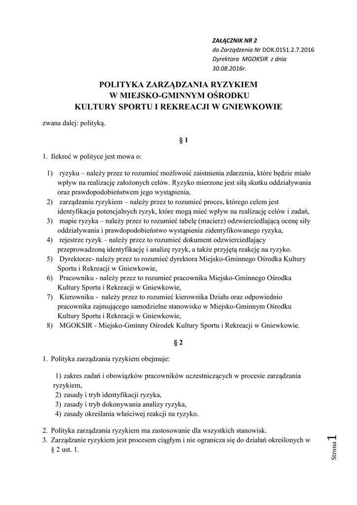 ZAŁĄCZNIK NR 2 do Zarządzenia Nr DOK.0151.2.7.2016 Dyrektora MGOKSIR z dnia 30.08.2016r. POLITYKA ZARZĄDZANIA RYZYKIEM W MIEJSKO-GMINNYM OŚRODKU KULTURY SPORTU I REKREACJI W GNIEWKOWIE zwana dalej: polityką. §1 1. Ilekroć w polityce jest mowa o: 1) ryzyku – należy przez to rozumieć możliwość zaistnienia zdarzenia, które będzie miało wpływ na realizację założonych celów. Ryzyko mierzone jest siłą skutku oddziaływania oraz prawdopodobieństwem jego wystąpienia, 2) zarządzaniu ryzykiem – należy przez to rozumieć proces, którego celem jest identyfikacja potencjalnych ryzyk, które mogą mieć wpływ na realizację celów i zadań, 3) mapie ryzyka – należy przez to rozumieć tabelę (macierz) odzwierciedlającą ocenę siły oddziaływania i prawdopodobieństwo wystąpienia zidentyfikowanego ryzyka, 4) rejestrze ryzyk – należy przez to rozumieć dokument odzwierciedlający przeprowadzoną identyfikację i analizę ryzyk, a także przyjętą reakcję na ryzyko. 5) Dyrektorze- należy przez to rozumieć dyrektora Miejsko-Gminnego Ośrodka Kultury Sportu i Rekreacji w Gniewkowie, 6) Pracowniku - należy przez to rozumieć pracownika Miejsko-Gminnego Ośrodka Kultury Sportu i Rekreacji w Gniewkowie, 7) Kierowniku - należy przez to rozumieć kierownika Działu oraz odpowiednio pracownika zajmującego samodzielne stanowisko w Miejsko-Gminnym Ośrodku Kultury Sportu i Rekreacji w Gniewkowie, 8) MGOKSIR - Miejsko-Gminny Ośrodek Kultury Sportu i Rekreacji w Gniewkowie. §2 1. Polityka zarządzania ryzykiem obejmuje: Strona 2. Polityka zarządzania ryzykiem ma zastosowanie dla wszystkich stanowisk. 3. Zarządzanie ryzykiem jest procesem ciągłym i nie ogranicza się do działań określonych w § 2 ust. 1. 1 1) zakres zadań i obowiązków pracowników uczestniczących w procesie zarządzania ryzykiem, 2) zasady i tryb identyfikacji ryzyka, 3) zasady i tryb dokonywania analizy ryzyka, 4) zasady określania właściwej reakcji na ryzyko. 4. Celem zarządzania ryzykiem jest zwiększenie prawdopodobieństwa osiągnięcia wyznaczonych celów i zadań, poprzez ograniczenie prawdopodobieństwa wystąpienia ryzyka oraz zabezpieczanie się przed jego skutkami poprzez: 1) identyfikowanie ryzyka, określenie rodzajów ryzyk, które wiążą się z działalnością MGOKSIR i dokonywanie ich pomiaru, 2) ocenę ryzyka i jego istotności, 3) zarządzanie ryzykiem, które polega na badaniu efektywności i skuteczności podejmowanych działań, poprzez system kontroli wewnętrznej i zewnętrznej, 4) kontrolę zarządzania ryzykiem, której istotą podjętych działań jest ocena zastosowanych metod redukcji ryzyka, prowadząca do skutecznego i efektywnego realizowania celów i zadań. §3 Niezbędnymi warunkami wdrożenia polityki zarządzania ryzykiem są: 1) określenie jasnych, spójnych i zgodnych z misją MGOKSIR celów i zadań, 2) ustalenie mierzalnych wskaźników realizacji wyznaczonych celów i zadań, 3) określenie poziomu ryzyka akceptowalnego dla wyznaczonych celów i zadań, 4) prowadzenie bieżącego monitoringu realizacji celów i zadań, 5) prowadzenie analizy poprawności i stosowania mechanizmów kontroli zarządczej. §4 1. Za realizację polityki zarządzania ryzykiem odpowiada Dyrektor. Dyrektor jest zobowiązany w szczególności do: 1) 2) 3) 4) kształtowania i wdrażania polityki zarządzania ryzykiem, nadzorowania i monitorowania skuteczności procesu zarzadzania ryzykiem, wyznaczania poziomu akceptowalnego ryzyka, podejmowania decyzji o sposobie reakcji na poszczególne ryzyka. Strona 1) wsparcie dla realizacji celów Miejsko-Gminny Ośrodek Kultury, Sportu i Rekreacji w Gniewkowie poprzez identyfikację ryzyk mogących wpłynąć negatywnie na realizację celów i odpowiednią reakcję na zidentyfikowane ryzyka oraz identyfikacje możliwości rozwoju i poprawy uzyskiwanych wyników; 2) położenie większego nacisku Kierownictwa na sprawy faktycznie istotne; 3) skrócenie czasu reakcji Kierownictwa na sprawy kryzysowe; 4) szybsze i skuteczniejsze reagowanie na zagrożenia; 5) ograniczenie ilości negatywnych zdarzeń mających wpływ na organizację; 6) skoncentrowanie działań na poprawne wykonywanie właściwych zadań; 7) zwiększenie prawdopodobieństwa wdrożenia planowanych zmian; 8) racjonalniejsze wykorzystanie zasobów; 2 2. Dyrektor wprowadza system zarządzania ryzykiem, a tym samym zapewnia: 9) świadome podejmowanie ryzyka i decyzji; 10) zwiększenie zaufania społeczeństwa do działania Ośrodka. 3. Pracownicy odpowiadają za zarządzanie ryzykiem stosownie do zajmowanych przez siebie stanowisk oraz stanowisk wchodzących w skład zespołów. Pracownicy są zobowiązani w szczególności do: 1) 2) 3) 4) 5) identyfikacji ryzyk związanych z realizacją przydzielonych zadań, wskazanie właścicieli zidentyfikowanych ryzyk, przeprowadzanie analizy zidentyfikowanego ryzyka, proponowanie sposobu postępowania w odniesieniu do poszczególnych ryzyk, wdrażanie działań zaradczych w stosunku do zidentyfikowanego ryzyka. §5 1. Identyfikacja ryzyk prowadzona jest na poziomie MGOKSIR i na poziomie poszczególnych stanowisk pracy. 2. Proces identyfikacji ryzyka odbywa się dwukrotnie w ciągu roku kalendarzowego, tj. nie później niż w ostatnim dniu roboczym stycznia i nie później niż w ostatnim dniu roboczym listopada. 3. W procesie identyfikacji ryzyka uwzględnia się czynniki sprzyjające wystąpieniu ryzyk według obszarów wrażliwych, określonych w załączniku nr 1 do niniejszego zarządzenia. 4. W procesie identyfikacji ryzyka uwzględnia się czynniki je kształtujące. Ze względu na ich źródło ryzyka dzielą się na: zewnętrzne – ryzyko determinowane przez czynniki zewnętrzne, wewnętrzne – ryzyko obejmujące działania wewnętrzne, które może być zarządzane wewnątrz jednostki organizacyjnej lub całej organizacji. 5. Każde zidentyfikowane ryzyko ujmuje się w rejestrze, którego wzór określa załącznik n