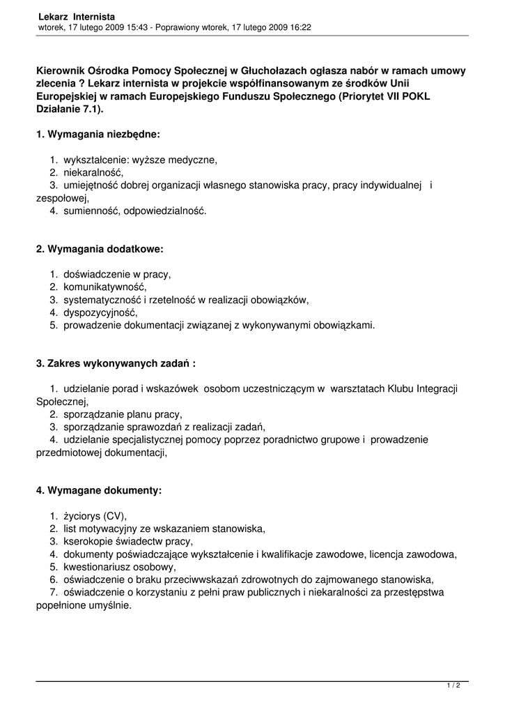 Lekarz Internista wtorek, 17 lutego 2009 15:43 - Poprawiony wtorek, 17 lutego 2009 16:22 Kierownik Ośrodka Pomocy Społecznej w Głuchołazach ogłasza nabór w ramach umowy zlecenia ? Lekarz internista w projekcie współfinansowanym ze środków Unii Europejskiej w ramach Europejskiego Funduszu Społecznego (Priorytet VII POKL Działanie 7.1). 1. Wymagania niezbędne: 1. wykształcenie: wyższe medyczne, 2. niekaralność, 3. umiejętność dobrej organizacji własnego stanowiska pracy, pracy indywidualnej i zespołowej, 4. sumienność, odpowiedzialność. 2. Wymagania dodatkowe: 1. 2. 3. 4. 5. doświadczenie w pracy, komunikatywność, systematyczność i rzetelność w realizacji obowiązków, dyspozycyjność, prowadzenie dokumentacji związanej z wykonywanymi obowiązkami. 3. Zakres wykonywanych zadań : 1. udzielanie porad i wskazówek osobom uczestniczącym w warsztatach Klubu Integracji Społecznej, 2. sporządzanie planu pracy, 3. sporządzanie sprawozdań z realizacji zadań, 4. udzielanie specjalistycznej pomocy poprzez poradnictwo grupowe i prowadzenie przedmiotowej dokumentacji, 4. Wymagane dokumenty: 1. życiorys (CV), 2. list motywacyjny ze wskazaniem stanowiska, 3. kserokopie świadectw pracy, 4. dokumenty poświadczające wykształcenie i kwalifikacje zawodowe, licencja zawodowa, 5. kwestionariusz osobowy, 6. oświadczenie o braku przeciwwskazań zdrowotnych do zajmowanego stanowiska, 7. oświadczenie o korzystaniu z pełni praw publicznych i niekaralności za przestępstwa popełnione umyślnie. 1/2 Lekarz Internista wtorek, 17 lutego 2009 15:43 - Poprawiony wtorek, 17 lutego 2009 16:22 Wymagane dokumenty aplikacyjne należy składać w zamkniętych kopertach z dopiskiem ?dotyczy naboru ? Lekarz internista? w sekretariacie Ośrodka Pomocy Społecznej w Głuchołazach, Al. Jana Pawła II 14 lub drogą pocztową na adres: Ośrodek Pomocy Społecznej, Al. Jana Pawła II 14, 48-340 Głuchołazy z w terminie do dnia 25.02.2009r. Wymagane dokumenty aplikacyjne: list motywacyjny, szczegółowe CV Wyrażam zgodę na przetwarzanie moich danych osobowych zawartych w ofercie pracy dla potrzeb niezbędnych do realizacji procesu rekrutacji zgodnie z ustawą z 29.08.1997 r. o ochronie danych osobowych (Dz. U. z 2002 r nr 101,poz. 926) oraz ustawą z 22.03.1999 r. o pracownikach samorządowych (Dz. U. z 2001 r , nr 142 poz. 1593 z późniejszymi zmianami) 5. Inne informacje: 1. Aplikacje, które wpłyną niekompletne lub nie spełniają wymogów formalnych nie będą rozpatrywane. 2. Lista kandydatów, którzy spełnili wymagania formalne oraz informacja o wyniku naboru będzie umieszczona na stronie internetowej Ośrodka oraz na tablicy informacyjnej w budynku Ośrodka. 3. Kandydaci spełniający wymagania formalne zostaną poinformowani o terminie postępowania sprawdzającego. W ciągu 14 dni od dnia zakończenia procedury rekrutacyjnej, dokumenty można odbierać w sekretariacie Ośrodka. Po upływie tego terminu zostaną komisyjnie zniszczone. 2/2