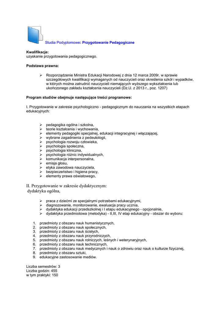 Studia Podyplomowe: Przygotowanie Pedagogiczne Kwalifikacje: uzyskanie przygotowania pedagogicznego. Podstawa prawna: Rozporządzenie Ministra Edukacji Narodowej z dnia 12 marca 2009r. w sprawie szczegółowych kwalifikacji wymaganych od nauczycieli oraz określenia szkół i wypadków, w których można zatrudnić nauczycieli niemających wyższego wykształcenia lub ukończonego zakładu kształcenia nauczycieli (Dz.U. z 2013 r., poz. 1207) Program studiów obejmuje następujące treści programowe: I. Przygotowanie w zakresie psychologiczno - pedagogicznym do nauczania na wszystkich etapach edukacyjnych: pedagogika ogólna i szkolna, teorie kształcenia i wychowania, elementy pedagogiki specjalnej, edukacji integracyjnej i włączającej, wybrane zagadnienia z pedeutologii, psychologia rozwoju człowieka, psychologia społeczna, psychologia kliniczna, psychologia różnic indywidualnych, komunikacja interpersonalna, emisja głosu, etyka zawodowa nauczyciela, bezpieczeństwo i higiena pracy, elementy prawa oświatowego, II. Przygotowanie w zakresie dydaktycznym: dydaktyka ogólna, praca z dziećmi ze specjalnymi potrzebami edukacyjnymi, diagnozowanie, monitorowanie, ewaluacja pracy ucznia, dydaktyka edukacji przedszkolnej i I etapu edukacyjnego - opcjonalnie, dydaktyka przedmiotowa (metodyka) - II,III, IV etap edukacyjny - obszar do wyboru: 1. 2. 3. 4. 5. 6. 7. 8. 9. przedmioty z obszaru nauk humanistycznych, przedmioty z obszaru nauk społecznych, przedmioty z obszaru nauk ścisłych, przedmioty z obszaru nauk przyrodniczych, przedmioty z obszaru nauk rolniczych, leśnych i weterynaryjnych, przedmioty z obszaru nauk technicznych, przedmioty z obszaru nauk medycznych i nauk o zdrowiu oraz nauk o kulturze fizycznej, przedmioty z obszaru sztuki, edukacyjne zastosowanie mediów. Liczba semestrów: 3 Liczba godzin: 455 w tym praktyki: 150