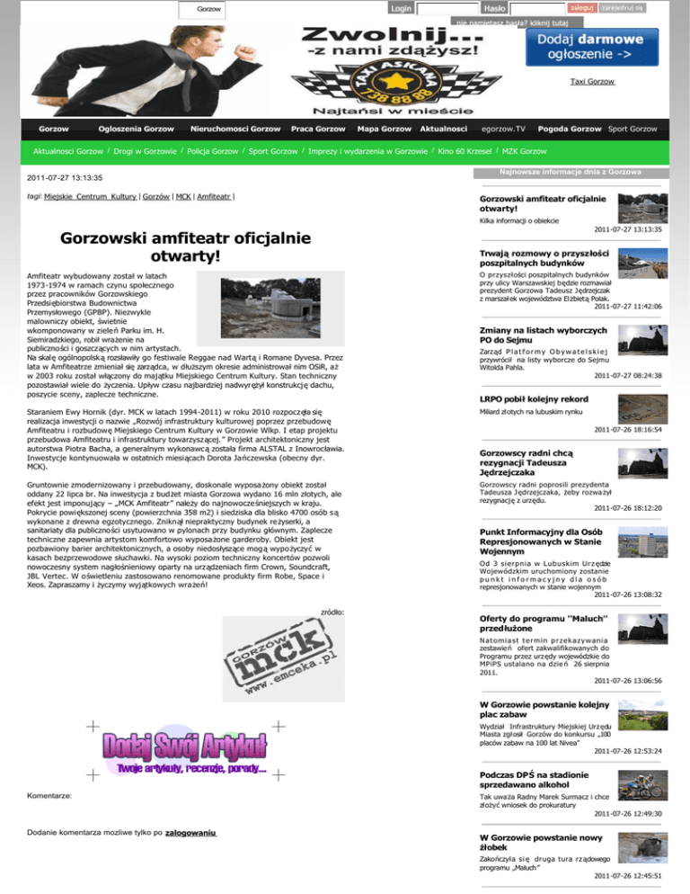 Gorzow Taxi Gorzow Gorzow Ogloszenia Gorzow Nieruchomosci Gorzow Praca Gorzow Mapa Gorzow Aktualnosci egorzow.TV Pogoda Gorzow Sport Gorzow Aktualnosci Gorzow / Drogi w Gorzowie / Policja Gorzow / Sport Gorzow / Imprezy i wydarzenia w Gorzowie / Kino 60 Krzesel / MZK Gorzow Najnowsze informacje dnia z Gorzowa 2011-07-27 13:13:35 tagi: Miejskie_Centrum_Kultury | Gorzów | MCK | Amfiteatr | Gorzowski amfiteatr oficjalnie otwarty! Kilka informacji o obiekcie 2011-07-27 13:13:35 Gorzowski amfiteatr oficjalnie otwarty! Trwają rozmowy o przyszłości poszpitalnych budynków Amfiteatr wybudowany został w latach 1973-1974 w ramach czynu społecznego przez pracowników Gorzowskiego Przedsiębiorstwa Budownictwa Przemysłowego (GPBP). Niezwykle malowniczy obiekt, świetnie wkomponowany w ziele ń Parku im. H. Siemiradzkiego, robił wrażenie na publiczności i goszczących w nim artystach. Na skalę ogólnopolską rozsławiły go festiwale Reggae nad Wartą i Romane Dyvesa. Przez lata w Amfiteatrze zmieniał się zarządca, w dłuższym okresie administrował nim OSiR, aż w 2003 roku został włączony do majątku Miejskiego Centrum Kultury. Stan techniczny pozostawiał wiele do życzenia. Upływ czasu najbardziej nadwyrężył konstrukcję dachu, poszycie sceny, zaplecze techniczne. O przyszłości poszpitalnych budynków przy ulicy Warszawskiej będzie rozmawiał prezydent Gorzowa Tadeusz Jędrzejczak z marszałek województwa Elżbietą Polak. 2011-07-27 11:42:06 Staraniem Ewy Hornik (dyr. MCK w latach 1994 -2011) w roku 2010 rozpoczęła się realizacja inwestycji o nazwie „Rozwój infrastruktury kulturowej poprzez przebudowę Amfiteatru i rozbudowę Miejskiego Centrum Kultury w Gorzowie Wlkp. I etap projektu przebudowa Amfiteatru i infrastruktury towarzyszącej.” Projekt architektoniczny jest autorstwa Piotra Bacha, a generalnym wykonawcą została firma ALSTAL z Inowrocławia. Inwestycje kontynuowała w ostatnich miesiącach Dorota Jańczewska (obecny dyr. MCK). Miliard złotych na lubuskim rynku Gruntownie zmodernizowany i przebudowany, doskonale wyposażony obiekt został oddany 22 lipca br. Na inwestycja z bud żet miasta Gorzowa wydano 16 mln złotych, ale efekt jest imponujący – „MCK Amfiteatr” należy do najnowocze śniejszych w kraju. Pokrycie powiększonej sceny (powierzchnia 358 m2) i siedziska dla blisko 4700 osób s ą wykonane z drewna egzotycznego. Znikn ął niepraktyczny budynek re żyserki, a sanitariaty dla publiczności usytuowano w pylonach przy budynku głównym. Zaplecze techniczne zapewnia artystom komfortowo wyposażone garderoby. Obiekt jest pozbawiony barier architektonicznych, a osoby niedosłyszące mog ą wypo życzyć w kasach bezprzewodowe słuchawki. Na wysoki poziom techniczny koncertów pozwoli nowoczesny system nagłośnieniowy oparty na urządzeniach firm Crown, Soundcraft, JBL Vertec. W o świetleniu zastosowano renomowane produkty firm Robe, Space i Xeos. Zapraszamy i życzymy wyjątkowych wra żeń! Gorzowscy radni poprosili prezydenta Tadeusza J ędrzejczaka, żeby rozwa żył rezygnację z urzędu. 2011-07-26 18:12:20 zródło: Zmiany na listach wyborczych PO do Sejmu Zarząd P l a t f o r m y O b y w a t e l s k i e j przywrócił na listy wyborcze do Sejmu Witolda Pahla. 2011-07-27 08:24:38 LRPO pobił kolejny rekord 2011-07-26 18:16:54 Gorzowscy radni chcą rezygnacji Tadeusza Jędrzejczaka Punkt Informacyjny dla Osób Represjonowanych w Stanie Wojennym Od 3 sierpnia w Lubuskim Urz ędzie Wojewódzkim uruchomiony zostanie punkt informacyjny dla osób represjonowanych w stanie wojennym 2011-07-26 13:08:32 Oferty do programu ''Maluch'' przedłużone Natomiast termin przekazywania zestawień ofert zakwalifikowanych do Programu przez urz ędy wojewódzkie do MPiPS ustalano na dzie ń 26 sierpnia 2011. 2011-07-26 13:06:56 W Gorzowie powstanie kolejny plac zabaw Wydział Infrastruktury Miejskiej Urz ędu Miasta zgłosił Gorzów do konkursu „100 placów zabaw na 100 lat Nivea" 2011-07-26 12:53:24 Podczas DPŚ na stadionie sprzedawano alkohol Komentarze: Dodanie komentarza mozliwe tylko po zalogowaniu Tak uważa Radny Marek Surmacz i chce złożyć wniosek do prokuratury 2011-07-26 12:49:30 W Gorzowie powstanie nowy żłobek Zakończyła si ę druga tura rz ądowego programu „Maluch” 2011-07-26 12:45:51 Dwa dni w całym Gorzowie nie będzie ciepłej wody Niedogodności c z eka j ą mieszkańców, którzy nie mają w domach bojlerów i s ą podłą czeni do miejskiej sieci. 2011-07-26 09:28:00 Warta przybrała metr po ostatnich opadach Czy będzie groźnie? 2011-07-25 17:59:05 Czy będzie połączenie PKS Gorzów - Babimostu (port lotniczy)? Loty Babimostu do stolicy wznowiono 21 czerwca. 2011-07-25 17:57:53 Linie autobusowe 119 i 403 zawieszone MZK informuje, iż od dnia 27 lipca 2011 zawieszone zostanie kursowanie linii autobusowych „119" oraz „403" 2011-07-25 14:57:09 Co z gorzowską fabryką TPV? Produkcja w fabrykach telewizorów w całej Polsce spada 2011-07-25 14:53:42 Warto walczyć o koleje dużych prędkości - Koleje du żych pr ędkości to daleka perspektywa, ale trzeba o nią walczyć już teraz 2011-07-25 14:52:34 Uroczyste otwarcie Amfiteatru coraz bliżej kasie Miejskiego Centrum Kultury zostało jeszcze nieco ponad 2 tysiące biletów. 2011-07-25 11:46:40 Bulwar nad Wartą nadal prowadzi Plebiscyt wyłoni 10 regionalnych perełek turystycznych 2011-07-25 11:43:47 Startuje Jazda Coolturalna Dziś odbędą się pierwsze warsztaty w ramach wakacyjnych zajęć. 2011-07-25 11:42:41 Przystank Woodstock w Kostrzynie już 04.08.2011 Dni i godziny dziel ą nas od rozpocz ęcia kolejnego Przystanku Woodstock w Kostrzynie. 2011-07-25 11:38:16 Spadające szyby z budynku przy 9-go Maja Dzisiaj w nocy z balkonu z trzeciego pietra spadła szyba balkonowa prosto na chodnik 2011-07-24 19:08:37 Podręczniki do szkół z roku na rok coraz droższe Małym zainteresowanie wśród rodziców i uczniów cieszą się nowe podręczniki 2011-