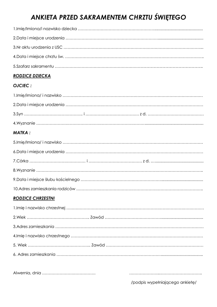 ANKIETA PRZED SAKRAMENTEM CHRZTU ŚWIĘTEGO 1.Imię/Imiona/i nazwisko dziecka …………………………………………………............................................ 2.Data i miejsce urodzenia ……………………………………………………………......................................... 3.Nr aktu urodzenia z USC …………………………………………………………………………………………... 4.Data i miejsce chrztu św. ………………………………………………………………………………………….. 5.Szafarz sakramentu …………………………………………………………………………………………….. RODZICE DZIECKA OJCIEC : 1.Imię/imiona/ i nazwisko …………………………………………………………………………………………… 2.Data i miejsce urodzenia …………………………………………………………………………………………. 3.Syn …………………………………….. i …………………………………. z d. …………………………………… 4.Wyznanie ………………………………………………………………………..................................................... MATKA : 5.Imię/Imiona/ i nazwisko …………………………………………………………………………………………… 6.Data i miejsce urodzenia …………………………………………………………………………………………. 7.Córka …………………………………… i …………………………………. z d. …............................................ 8.Wyznanie …………………………………………………………………………………………………………….. 9.Data i miejsce ślubu kościelnego ……………………………………………………...................................... 10.Adres zamieszkania rodziców ………………………………………………………………………………….. RODZICE CHRZESTNI 1.Imię i nazwisko chrzestnej …………………………………………………………………………………………. 2.Wiek ……………………………………….. Zawód ……………………………………...................................... 3.Adres zamieszkania ………………………………………………………………………………………………… 4.Imię i nazwisko chrzestnego ……………………………………………………………………………………… 5. Wiek ……………………………………….. Zawód ………………………………………………………………. 6. Adres zamieszkania ……………………………………………………………………...................................... Alwernia, dnia …………………………………. …………………..………………………….. /podpis wypełniającego ankietę/