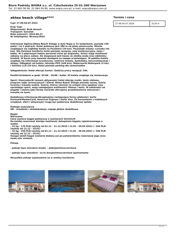 Biuro Podróży WIGRA s.c. ul. Człuchowska 25 01-360 Warszawa Tel. 22 665 06 06, 22 664 94 86, www.wigra.com.pl, e-mail: [email protected] aktea beach village**** Cypr 27.06-04.07.2016 Termin i cena 27.06-04.07.2016 3129 zł Kraj: Cypr Miejscowość: Brak danych Transport: Samolot Data ważności: 2016-06-27 Nr katalogowy: Wczasy/2016 Informacje Ogólne:Aktea Beach Village w Ayia Napa w 21 budynkach, posiada 148 pokoi i na 2 piętrach. Hotel położony jest 200 m od plaży piaszczysta. Miasto znajdujące się najbliżej hotelu to Paralimni (10 km). Pozostałe miasta: Larnaka (42 km). Dla Państwa komfortu hotel posiada recepcję, salę konferencyjną, salon i lobby. W 2-piętrowym hotelu personel mówi po angielsku. Dzieci mają możliwość zabawy na placu zabaw. Do dyspozycji jest basen ze słodką wodą oraz oddzielny brodzik. W barze przy basenie dostępne są napoje orzeźwiające. W pobliżu hotelu znajdują się informacja turystyczna, centrum miasta, dyskoteka, bary/restauracje i sklepy. Odległość od hotelu: lotnisko PFO (169 km), Waterworld Waterpark (3 km) i lotnisko LCA (54 km). Hotel posiada parking dla samochodów Udogodnienia: Hotel oferuje kantor. Godziny pracy recepcji: 24h. Posiłki:Śniadanie w godz. 07:00 - 10:00 : bufet. W hotelu znajduje się restauracja. Sport i Rozrywka:W ramach aktywności hotel oferuje rzutki, tenis stołowy, program zajęć animacyjnych i bilard. Aktea Beach Village posiada saunę, łaźnię turecką i masaże wodne. Goście, którzy również na urlopie chcą spędzać czas uprawiając sport, mają następujące możliwości: fitness i tenis. W zależności od pogody i sezonu jako formę rozrywki oferujemy przedstawienia wieczorne i muzykę na żywo. Dodatkowe Informacje:Akceptujemy następujące formy płatności: karta Eurocard/MasterCard, American Express i karta Visa. Za korzystanie z niektórych urządzeń, ofert i aktywności mogą być pobierane dodatkowe opłaty. Rodzaje wyżywienia HB - śniadania i obiadokolacje, napoje płatne dodatkowo Bagaż Warszawa Cena zawiera bagaż podręczny o wymiarach 42x32x25 Do każdej rezerwacji istnieje możliwość dokupienia bagażu rejestrowanego o wadze - 23 kg - 170 PLN (wyloty od 01.11 - 11.12.2015 i 11.01 - 30.04.2016 ) / 250 PLN (wyloty od 12.12 - 10.01) - 32 kg - 250 PLN (wyloty od 01.11 - 11.12.2015 i 11.01 - 30.04.2016 ) / 340 PLN (wyloty od 12.12 - 10.01) Uwaga! Jeżeli bagaż zostanie dodany już po potwierdzeniu rezerwacji jego cena może ulec zmianie. Pokoje - pokoje typu standard studio - jednopomieszczeniowe - pokoje typu standard - są to dwupomieszczeniowe apartamenty Wszystkie pokoje wyposażone są w aneksy kuchenne. 1/1 Powered by TCPDF (www.tcpdf.org)