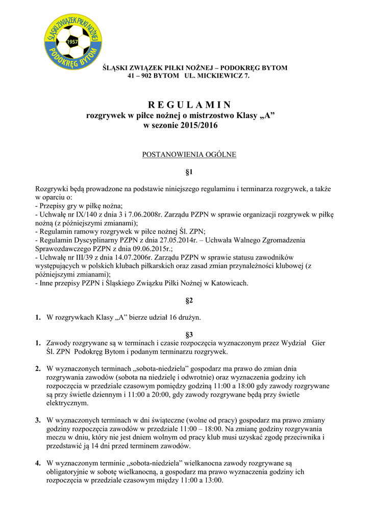 ŚLĄSKI ZWIĄZEK PIŁKI NOŻNEJ – PODOKRĘG BYTOM 41 – 902 BYTOM UL. MICKIEWICZ 7. REGULAMIN rozgrywek w piłce nożnej o mistrzostwo Klasy „A” w sezonie 2015/2016 POSTANOWIENIA OGÓLNE §1 Rozgrywki będą prowadzone na podstawie niniejszego regulaminu i terminarza rozgrywek, a także w oparciu o: - Przepisy gry w piłkę nożna; - Uchwałę nr IX/140 z dnia 3 i 7.06.2008r. Zarządu PZPN w sprawie organizacji rozgrywek w piłkę nożną (z późniejszymi zmianami); - Regulamin ramowy rozgrywek w piłce nożnej Śl. ZPN; - Regulamin Dyscyplinarny PZPN z dnia 27.05.2014r. – Uchwała Walnego Zgromadzenia Sprawozdawczego PZPN z dnia 09.06.2015r.; - Uchwałę nr III/39 z dnia 14.07.2006r. Zarządu PZPN w sprawie statusu zawodników występujących w polskich klubach piłkarskich oraz zasad zmian przynależności klubowej (z późniejszymi zmianami); - Inne przepisy PZPN i Śląskiego Związku Piłki Nożnej w Katowicach. §2 1. W rozgrywkach Klasy „A” bierze udział 16 drużyn. §3 1. Zawody rozgrywane są w terminach i czasie rozpoczęcia wyznaczonym przez Wydział Gier Śl. ZPN Podokręg Bytom i podanym terminarzu rozgrywek. 2. W wyznaczonych terminach „sobota-niedziela” gospodarz ma prawo do zmian dnia rozgrywania zawodów (sobota na niedzielę i odwrotnie) oraz wyznaczenia godziny ich rozpoczęcia w przedziale czasowym pomiędzy godziną 11:00 a 18:00 gdy zawody rozgrywane są przy świetle dziennym i 11:00 a 20:00, gdy zawody rozgrywane będą przy świetle elektrycznym. 3. W wyznaczonych terminach w dni świąteczne (wolne od pracy) gospodarz ma prawo zmiany godziny rozpoczęcia zawodów w przedziale 11:00 – 18:00. Na zmianę godziny rozgrywania meczu w dniu, który nie jest dniem wolnym od pracy klub musi uzyskać zgodę przeciwnika i przedstawić ją 14 dni przed terminem zawodów. 4. W wyznaczonym terminie „sobota-niedziela” wielkanocna zawody rozgrywane są obligatoryjnie w sobotę wielkanocną, a gospodarz ma prawo wyznaczenia godziny ich rozpoczęcia w przedziale czasowym między 11:00 a 13:00. 5. W przypadku wystąpienia o zmianę innych terminów rozgrywek podanych w oficjalnym terminarzu rozgrywek zainteresowany klub musi uzyskać pisemną zgodę drużyny przeciwnej na proponowane zmiany. 6. Gospodarz zawodów o wszelkich zmianach w terminarzu zobowiązany jest powiadomić drużynę przeciwną, Wydział Gier prowadzący rozgrywki, Kolegium Sędziów w terminie nie krótszym niż 14 dni przed pierwotną datą zawodów (list polecony, fax, e-mail zwrotnie potwierdzony przed odbierającego). W przeciwnym wypadku klub musi uzyskać pisemną zgodę drużyny przeciwnej i W.G. prowadzącego rozgrywki. 7. Dwie ostatnie kolejki rozgrywek obligatoryjnie musza się odbyć zgodnie z terminarzem rozgrywek podanym przez W.G. BOISKA (obiekty sportowe) §4 1. Zawody o mistrzostwo Klasy „A” mogą być rozgrywane tylko na boiskach zweryfikowanych do określonej klasy rozgrywkowej na dany sezon – położonych w miejscu siedziby klubu – określonej w jego statucie. Weryfikację boisk przeprowadzają weryfikatorzy powołani przez W.G. Śl. ZPN Podokręg Bytom. 2. Ważność weryfikacji boiska określa się dla Klasy „A” na dwa sezony rozgrywkowe, przy czym okres jej ważności musi być zgodny z okresem ważności licencji. Brak ważnej weryfikacji boiska jest podstawą do zawieszenia licencji. 3. Klub jest w pełni odpowiedzialny za przygotowanie boiska do zawodów. 4. Klub, który nie dopełnił tego obowiązku i z winy którego zawody nie doszły do skutku, ponosi konsekwencje regulaminowe oraz pokrywa przeciwnikowi wszystkie koszty związane z przyjazdem na nie odbyte zawody. 5. W rozgrywkach Klasy „A” nie może występować drużyna klubu, który decyzją właściwych organów ZPN nie otrzymał licencji na występowanie w Klasie „A” w sezonie 2015/2016. ZAWODNICY §5 1. W meczach mistrzowskich mogą występować zawodnicy po ukończeniu 16 roku życia i są wprowadzeni do systemu Extranet na podstawie właściwie wypełnionego formularza zgłoszeniowego. W szczególnie uzasadnionych przypadkach W.G Śl. ZPN Podokręg Bytom może uprawnić do gry reprezentanta kraju po ukończeniu przez niego 15 roku życia, po wcześniejszym uzyskaniu zgody rodziców lub opiekunów oraz pozytywnej opinii Wydziału Szkolenia i przychodni sportowo-lekarskiej. 2. W Zawodach mistrzowskich Klas „A” w trakcie całego meczu musi brać udział jeden zawodnik młodzieżowy. (zawodnika młodzieżowego w sprawozdaniu oznaczamy literą „M”) 3. Zgodnie z Uchwałą nr VI/94 Zarządu PZPN z dnia 20.05.2010r. w sprawie zmiany wieku zawodnika młodzieżowego przyjmuje się, iż zawodnikiem jest osoba urodzona w 1995 roku i młodsza. 4. Karta identyfikacyjna wydana przez PZPN jest dokumentem na podstawie, którego może zostać potwierdzona tożsamość zawodnika. Zawodnicy nie posiadający kart identyfikacyjnych muszą mieć dokument ze zdjęciem, pozwalający stwierdzić tożsamość zawodnika (np. dowód osobisty, paszport, legitymacja szkolna itp.) §6 1. Klub posiadający drużyny w kilku klasach rozgrywkowych może wystawić swoich zawodników do gry o mistrzostwo poszczególnych klas zgodnie z następującymi zasadami: a) jeżeli w jednym terminie gra o mistrzostwo lub puchar drużyna klasy wyższej, pozostali, nie biorący udziału w meczu zawodnicy tej drużyny, mogą brać udział w zawodach klasy niższej; b) jeżeli drużyna klasy wyższej nie rozgrywa w danym terminie zawodów o mistrzostwo lub puchar, zawodnicy tej drużyny, którzy grali w poprzedniej kolejce mistrzostw więcej niż połowę meczu, nie mogą uczestniczyć w zawodach klasy niższej w tym terminie. Prawo do gry w drużynie klasy niższej przysługuje tym zawodników dopiero w następnej kolejce (terminie) mistrzostw, nie więcej jednak jak trzech zawodników; c) zawodnik traci prawo do gry w drużynach klas niższych po rozegraniu 2/3 spotkań mistrzowskich w klasie wyższej; d) do liczby rozegr