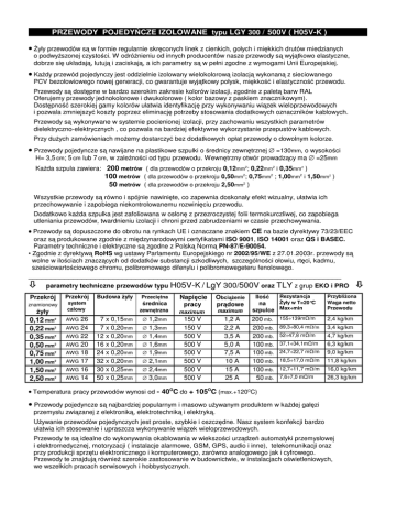 PRZEWODY POJEDYŃCZE IZOLOWANE typu LGY 300 / 500V ( H05V-K ) • Żyły przewodów są w formie regularnie skręconych linek z cienkich, gołych i miękkich drutów miedzianych o podwyższonej czystości. W odróżnieniu od innych producentów nasze przewody są wyjątkowo elastyczne, dobrze się układają, lutują i zaciskają, a ich parametry są w pełni zgodne z wymogami Unii Europejskiej. • Każdy przewód pojedynczy jest oddzielnie izolowany wielokolorową izolacją wykonaną z sieciowanego PCV bezołowiowego nowej generacji, co gwarantuje wyjątkowy połysk, miękkość i elastyczność przewodu. Przewody są dostępne w bardzo szerokim zakresie kolorów izolacji, zgodnie z paletą barw RAL Oferujemy przewody jednokolorowe i dwukolorowe ( kolor bazowy z paskiem znacznikowym). Dostępność szerokiej gamy kolorów ułatwia identyfikację przy wykonywaniu wiązek wieloprzewodowych i pozwala zmniejszyć koszty poprzez eliminację potrzeby stosowania dodatkowych oznaczników kablowych. Przewody są wykonywane w systemie pocienionej izolacji, przy zachowaniu wszystkich parametrów dielektryczno-elektrycznych , co pozwala na bardziej efektywne wykorzystanie przepustów kablowych. Przy dużych zamówieniach możemy dostarczyć bez dodatkowych opłat przewody o dowolnym kolorze. • Przewody pojedyncze są nawijane na plastikowe szpulki o średnicy zewnętrznej ∅ =130mm, o wysokości H= 3,5 cm; 5 cm lub 7 cm, w zależności od typu przewodu. Wewnętrzny otwór prowadzący ma ∅ =25mm Każda szpula zawiera: 200 metrów ( dla przewodów o przekroju 0,12mm2; 0,22mm2 i 0,35mm2 ) 100 metrów ( dla przewodów o przekroju 0,50mm2; 0,75mm2 ; 1,00mm2 i 1,50mm2 ) 50 metrów ( dla przewodów o przekroju 2,50mm2 ) Wszystkie przewody są równo i spójnie nawinięte, co zapewnia doskonały efekt wizualny, ułatwia ich przechowywanie i zapobiega niekontrolowanemu rozwinięciu przewodu. Dodatkowo każda szpulka jest zafoliowana w osłonę z przezroczystej folii termokurczliwej, co zapobiega utlenianiu przewodów, twardnieniu izolacji i chroni przed zabrudzeniami w czasie przechowywania. • Przewody są dopuszczone do obrotu na rynkach UE i oznaczane znakiem CE na bazie dyrektywy 73/23/EEC oraz są produkowane zgodnie z międzynarodowymi certyfikatami ISO 9001, ISO 14001 oraz QS i BASEC. Parametry techniczne i elektryczne są zgodne z Polską Normą PN-87/E-90054. • Zgodnie z dyrektywą RoHS wg ustawy Parlamentu Europejskiego nr 2002/95/WE z 27.01.2003r. przewody są wolne w ilościach znaczących od dodatków substancji szkodliwych, szczególności ołowiu, rtęci, kadmu, sześciowartościowego chromu, polibromowego difenylu i polibromowegeteru fenolowego. ______________________________________________________________________ parametry techniczne przewodów typu H05V-K / LgY 300/500V oraz TLY z grup EKO i PRO Przekrój Przekrój znamionowy system calowy żyły 0,12 mm 0,22 mm2 0,35 mm2 0,50 mm2 0,75 mm2 1,00 mm2 1,50 mm2 2,50 mm2 2 26 AWG 24 AWG 22 AWG 20 AWG 18 AWG 17 AWG 16 AWG 14 AWG Budowa żyły Przeciętna średnica 7 x 0,15mm 7 x 0,20mm 12 x 0,20mm 16 x 0,20mm 24 x 0,20mm 32 x 0,20mm 30 x 0,25mm 50 x 0,25mm Napięcie pracy zewnętrzna maximum 1,2mm ∅ 1,3mm ∅ 1,4mm ∅ 1,6mm ∅ 1,9mm ∅ 2,1mm ∅ 2,4mm ∅ 3,0mm 150 V 150 V 500 V 500 V 500 V 500 V 500 V 500 V ∅ Obciążenie prądowe maximum 1,2 A 2,2 A 3,5 A 5,0 A 7,5 A 10 A 15 A 25 A Rezystancja Ilość Żyły w T=20°C na szpulce Max÷min 200 mb. 200 mb. 200 mb. 100 mb. 100 mb. 100 mb. 100 mb. 50 mb. Przybliżona Waga netto Przewodu 155÷139mΩ/m 2,4 kg/km 89,3÷80,4 mΩ/m 3,4 kg/km 52÷47,8 mΩ/m 4,7 kg/km 37,1÷34,1mΩ/m 6,3 kg/km 24,7÷22,7 mΩ/m 9,0 kg/km 18,5÷17,0 mΩ/m 11,8 kg/km 12,7÷11,7 mΩ/m 16,0 kg/km 7,6÷7,0 mΩ/m 26,3 kg/km • Temperatura pracy przewodów wynosi od - 40OC do + 105OC (max.+120OC) • Przewody pojedyncze są najbardziej popularnym i masowo używanym produktem w każdej gałęzi przemysłu związanej z elektroniką, elektrotechniką i elektryką. Używanie przewodów pojedynczych jest proste, szybkie i oszczędne. Nasz system konfekcji bardzo ułatwia ich stosowanie i upraszcza wykonywanie wiązek wieloprzewodowych. Przewody te są idealne do wykonywania okablowania w wiekszości urządzeń automatyki przemysłowej i elektromedycznej, motoryzacji ( instalacje alarmowe, GSM, GPS, audio i inne), telekomunikacji oraz przy produkcji sprzętu elektronicznego i komputerowego, zarówno analogowego jak i cyfrowego. Przewody te znajdują również szerokie zastosowanie w budownictwie, w instalacjach oświetleniowych, we wszelkich pracach serwisowych i hobbystycznych.