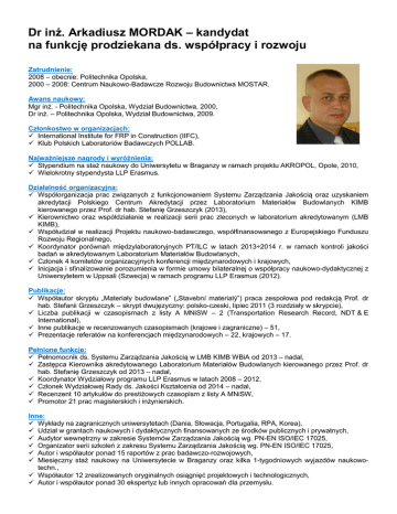 Dr inż. Arkadiusz MORDAK – kandydat na funkcję prodziekana ds. współpracy i rozwoju Zatrudnienie: 2008 – obecnie: Politechnika Opolska, 2000 – 2008: Centrum Naukowo-Badawcze Rozwoju Budownictwa MOSTAR. Awans naukowy: Mgr inż. - Politechnika Opolska, Wydział Budownictwa, 2000, Dr inż. – Politechnika Opolska, Wydział Budownictwa, 2009. Członkostwo w organizacjach: International Institute for FRP in Construction (IIFC), Klub Polskich Laboratoriów Badawczych POLLAB. Najważniejsze nagrody i wyróżnienia: Stypendium na staż naukowy do Uniwersytetu w Braganzy w ramach projektu AKROPOL, Opole, 2010, Wielokrotny stypendysta LLP Erasmus. Działalność organizacyjna: Współorganizacja prac związanych z funkcjonowaniem Systemu Zarządzania Jakością oraz uzyskaniem akredytacji Polskiego Centrum Akredytacji przez Laboratorium Materiałów Budowlanych KIMB kierowanego przez Prof. dr hab. Stefanię Grzeszczyk (2013), Kierownictwo oraz współdziałanie w realizacji serii prac zleconych w laboratorium akredytowanym (LMB KIMB), Współudział w realizacji Projektu naukowo-badawczego, współfinansowanego z Europejskiego Funduszu Rozwoju Regionalnego, Koordynator porównań międzylaboratoryjnych PT/ILC w latach 2013÷2014 r. w ramach kontroli jakości badań w akredytowanym Laboratorium Materiałów Budowlanych, Członek 4 komitetów organizacyjnych konferencji międzynarodowych i krajowych, Inicjacja i sfinalizowanie porozumienia w formie umowy bilateralnej o współpracy naukowo-dydaktycznej z Uniwersytetem w Uppsali (Szwecja) w ramach programu LLP Erasmus (2012). Publikacje: Współautor skryptu „Materiały budowlane” („Stavební materialý”) praca zespołowa pod redakcją Prof. dr hab. Stefanii Grzeszczyk – skrypt dwujęzyczny: polsko-czeski, lipiec 2011 (3 rozdziały w skrypcie), Liczba publikacji w czasopismach z listy A MNiSW – 2 (Transportation Research Record, NDT & E International), Inne publikacje w recenzowanych czasopismach (krajowe i zagraniczne) – 51, Prezentacje referatów na konferencjach międzynarodowych – 22, krajowych – 17. Pełnione funkcje: Pełnomocnik ds. Systemu Zarządzania Jakością w LMB KIMB WBiA od 2013 – nadal, Zastępca Kierownika akredytowanego Laboratorium Materiałów Budowlanych kierowanego przez Prof. dr hab. Stefanię Grzeszczyk od 2013 – nadal, Koordynator Wydziałowy programu LLP Erasmus w latach 2008 – 2012, Członek Wydziałowej Rady ds. Jakości Kształcenia od 2014 – nadal, Recenzent 10 artykułów do prestiżowych czasopism z listy A MNiSW, Promotor 21 prac magisterskich i inżynierskich. Inne: Wykłady na zagranicznych uniwersytetach (Dania, Słowacja, Portugalia, RPA, Korea), Udział w grantach naukowych i dydaktycznych finansowanych ze środków publicznych i prywatnych, Audytor wewnętrzny w zakresie Systemów Zarządzania Jakością wg. PN-EN ISO/IEC 17025, Organizator serii szkoleń z zakresu Systemu Zarządzania Jakością wg. PN-EN ISO/IEC 17025, Autor i współautor ponad 15 raportów z prac badawczo-rozwojowych, Miesięczny staż naukowy na Uniwersytecie w Braganzy oraz kilka 1-tygodniowych wyjazdów naukowotechn., Współautor 12 zrealizowanych oryginalnych osiągnięć projektowych i technologicznych, Autor i współautor ponad 30 ekspertyz lub innych opracowań dla przemysłu.