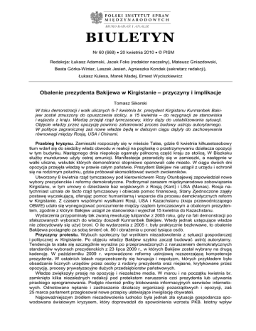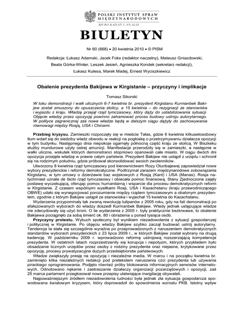 BIURO BADAŃ I ANALIZ BIULETYN Nr 60 (668) 20 kwietnia 2010 © PISM Redakcja: Łukasz Adamski, Jacek Foks (redaktor naczelny), Mateusz Gniazdowski, Beata Górka-Winter, Leszek Jesień, Agnieszka Kondek (sekretarz redakcji), Łukasz Kulesa, Marek Madej, Ernest Wyciszkiewicz Obalenie prezydenta Bakijewa w Kirgistanie – przyczyny i implikacje Tomasz Sikorski W toku demonstracji i walk ulicznych 6-7 kwietnia br. prezydent Kirgistanu Kurmanbek Bakijew został zmuszony do opuszczenia stolicy, a 15 kwietnia – do rezygnacji ze stanowiska i wyjazdu z kraju. Władzę przejął rząd tymczasowy, który dąży do ustabilizowania sytuacji. Objęcie władzy przez opozycję powinno zahamować proces budowy ustroju autorytarnego. W polityce zagranicznej zaś nowe władze będą w dalszym ciągu dążyły do zachowywania równowagi między Rosją, USA i Chinami. Przebieg kryzysu. Zamieszki rozpoczęły się w mieście Tałas, gdzie 6 kwietnia kilkusetosobowy tłum wdarł się do siedziby władz obwodu w reakcji na pogłoskę o przetrzymywaniu działacza opozycji w tym budynku. Następnego dnia niepokoje ogarnęły północną część kraju ze stolicą. W Biszkeku służby mundurowe użyły ostrej amunicji. Manifestacje przerodziły się w zamieszki, a następnie w walki uliczne, wskutek których demonstranci stopniowo opanowali całe miasto. W ciągu dwóch dni opozycja przejęła władzę w prawie całym państwie. Prezydent Bakijew nie ustąpił z urzędu i schronił się na rodzimym południu, gdzie próbował skonsolidować swoich zwolenników. Utworzony 8 kwietnia rząd tymczasowy pod kierownictwem Rozy Otunbajewej zapowiedział nowe wybory prezydenckie i reformy demokratyczne. Podtrzymał zarazem międzynarodowe zobowiązania Kirgistanu, w tym umowy o dzierżawie baz wojskowych z Rosją (Kant) i USA (Manas). Rosja natychmiast uznała de facto rząd tymczasowy i obiecała pomoc finansową. Stany Zjednoczone zajęły postawę wyczekującą, oferując pomoc humanitarną i wsparcie dla procesu demokratycznych reform w Kirgistanie. Z czasem wspólnymi wysiłkami Rosji, USA i Kazachstanu (kraju przewodniczącego OBWE) udało się wynegocjować porozumienie między rządem tymczasowym a obalonym prezydentem, zgodnie z którym Bakijew ustąpił ze stanowiska i wyjechał 15 kwietnia do Kazachstanu. Wydarzenia przypominały tak zwaną rewolucję tulipanów z 2005 roku, gdy na fali demonstracji po sfałszowanych wyborach do władzy doszedł Kurmanbek Bakijew. Wtedy jednak ustępujące władze nie zdecydowały się użyć broni. O ile wydarzenia z 2005 r. były praktycznie bezkrwawe, to obalenie Bakijewa pociągnęło za sobą śmierć ok. 80 i obrażenia u ponad tysiąca osób. Przyczyny protestu. Wybuch społeczny był wynikiem niezadowolenia z sytuacji gospodarczej i politycznej w Kirgistanie. Po objęciu władzy Bakijew szybko zaczął budować ustrój autorytarny. Tendencja ta stała się szczególnie wyraźna po przeprowadzonych z naruszeniem demokratycznych standardów wyborach prezydenckich z 23 lipca 2009 r., w których Bakijew został wybrany na drugą kadencję. W październiku 2009 r. wprowadzono reformę ustrojową rozszerzającą kompetencje prezydenta. W ostatnich latach rozprzestrzeniły się korupcja i nepotyzm, których przykładem było obsadzanie licznych urzędów przez osoby z rodziny prezydenta oraz niejasne, krytykowane przez opozycję, procesy prywatyzacyjne dużych przedsiębiorstw państwowych. Władze zwiększyły presję na opozycję i niezależne media. W marcu i na początku kwietnia br. zamknięto kilka niezależnych redakcji pod pretekstem naruszenia czci prezydenta lub używania pirackiego oprogramowania. Podjęto również próby blokowania informacyjnych serwisów internetowych. Odnotowano nękanie i zastraszanie działaczy organizacji pozarządowych i opozycji, zaś 25 marca parlament przegłosował nowe przepisy ułatwiające inwigilację obywateli. Najpoważniejszym źródłem niezadowolenia ludności była jednak zła sytuacja gospodarcza spowodowana światowym kryzysem, który doprowadził do spowolnienia wzrostu PKB. Istotny wpływ 2200 Polski Instytut Spraw Międzynarodowych miało również ograniczenie dostępu do rosyjskiego rynku pracy kirgiskim gastarbeiterom. Ponadto dały o sobie znać skutki populistycznych decyzji sprzed wyborów, na przykład 50-procentowej podwyżki płac w sektorze budżetowym od 1 czerwca 2009 r. Wytworzona w ten sposób presja inflacyjna wymusiła podwyżki opłat za elektryczność i ogrzewanie od początku br., bezpośrednio zaś przed zamieszkami władze zapowiedziały wzrost cen benzyny. Protesty opozycji trwały z różnym nasileniem od wyborów prezydenckich z 2009 r. W marcu br. ich częstotliwość wzrosła, a na 7 kwietnia zwołano kurułtaje (wiece) na obszarze całego kraju. Pośrednią rolę w zwiększeniu aktywności demonstrantów odegrała wizyta sekretarza generalnego ONZ Ban Ki-moona 3 kwietnia w Biszkeku. Reakcja Rosji. Natychmiastowe uznanie rządu tymczasowego przez Rosję wynikało z rozczarowania polityką Bakijewa. W 2009 r. wyraźnie narastało napięcie w stosunkach rosyjsko-kirgiskich. W zamian za udzieloną wówczas pożyczkę i pomoc bezzwrotną Rosja liczyła, że Kirgistan doprowadzi do zamknięcia amerykańskiej bazy lotniczej Manas. Bakijew nie spełnił jednak tych oczekiwań. W czerwcu 2009 r. podpisał roczną umowę z USA przekształcającą bazę w „centrum przewozów logistycznych” działające na tych samych zasadach. W zamian Stany Zjednoczone zwiększyły pomoc finansową dla Kirgistanu. Kolejne wydarzenia, jak rozmowy między Kirgistanem a USA o budowie kolejnej bazy (centrum antyterrorystycznego) utrwaliły Rosję w przekonaniu o proamerykańskości prezydenta Bakijewa. Prawdopodobnie w odpowiedzi na działania prezydenta Rosja nie wywiązała się ze złożonej w 2009 r. obietnicy udzielenia kredytu w wysokości 1,7 mld dol. przeznaczonego na budowę hydroelektrowni Kambarata-1. W rzec