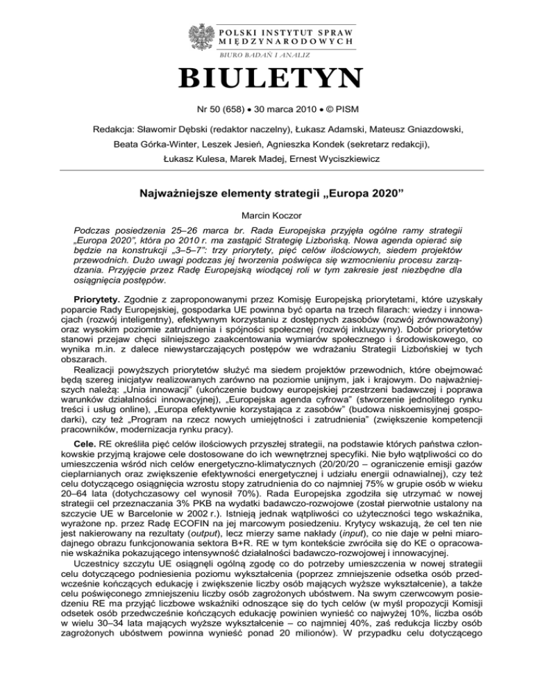 BIURO BADAŃ I ANALIZ BIULETYN Nr 50 (658) 30 marca 2010 © PISM Redakcja: Sławomir Dębski (redaktor naczelny), Łukasz Adamski, Mateusz Gniazdowski, Beata Górka-Winter, Leszek Jesień, Agnieszka Kondek (sekretarz redakcji), Łukasz Kulesa, Marek Madej, Ernest Wyciszkiewicz Najważniejsze elementy strategii „Europa 2020” Marcin Koczor Podczas posiedzenia 25–26 marca br. Rada Europejska przyjęła ogólne ramy strategii „Europa 2020”, która po 2010 r. ma zastąpić Strategię Lizbońską. Nowa agenda opierać się będzie na konstrukcji „3–5–7”: trzy priorytety, pięć celów ilościowych, siedem projektów przewodnich. Dużo uwagi podczas jej tworzenia poświęca się wzmocnieniu procesu zarządzania. Przyjęcie przez Radę Europejską wiodącej roli w tym zakresie jest niezbędne dla osiągnięcia postępów. Priorytety. Zgodnie z zaproponowanymi przez Komisję Europejską priorytetami, które uzyskały poparcie Rady Europejskiej, gospodarka UE powinna być oparta na trzech filarach: wiedzy i innowacjach (rozwój inteligentny), efektywnym korzystaniu z dostępnych zasobów (rozwój zrównoważony) oraz wysokim poziomie zatrudnienia i spójności społecznej (rozwój inkluzywny). Dobór priorytetów stanowi przejaw chęci silniejszego zaakcentowania wymiarów społecznego i środowiskowego, co wynika m.in. z dalece niewystarczających postępów we wdrażaniu Strategii Lizbońskiej w tych obszarach. Realizacji powyższych priorytetów służyć ma siedem projektów przewodnich, które obejmować będą szereg inicjatyw realizowanych zarówno na poziomie unijnym, jak i krajowym. Do najważniejszych należą: „Unia innowacji” (ukończenie budowy europejskiej przestrzeni badawczej i poprawa warunków działalności innowacyjnej), „Europejska agenda cyfrowa” (stworzenie jednolitego rynku treści i usług online), „Europa efektywnie korzystająca z zasobów” (budowa niskoemisyjnej gospodarki), czy też „Program na rzecz nowych umiejętności i zatrudnienia” (zwiększenie kompetencji pracowników, modernizacja rynku pracy). Cele. RE określiła pięć celów ilościowych przyszłej strategii, na podstawie których państwa członkowskie przyjmą krajowe cele dostosowane do ich wewnętrznej specyfiki. Nie było wątpliwości co do umieszczenia wśród nich celów energetyczno-klimatycznych (20/20/20 – ograniczenie emisji gazów cieplarnianych oraz zwiększenie efektywności energetycznej i udziału energii odnawialnej), czy też celu dotyczącego osiągnięcia wzrostu stopy zatrudnienia do co najmniej 75% w grupie osób w wieku 20–64 lata (dotychczasowy cel wynosił 70%). Rada Europejska zgodziła się utrzymać w nowej strategii cel przeznaczania 3% PKB na wydatki badawczo-rozwojowe (został pierwotnie ustalony na szczycie UE w Barcelonie w 2002 r.). Istnieją jednak wątpliwości co użyteczności tego wskaźnika, wyrażone np. przez Radę ECOFIN na jej marcowym posiedzeniu. Krytycy wskazują, że cel ten nie jest nakierowany na rezultaty (output), lecz mierzy same nakłady (input), co nie daje w pełni miarodajnego obrazu funkcjonowania sektora B+R. RE w tym kontekście zwróciła się do KE o opracowanie wskaźnika pokazującego intensywność działalności badawczo-rozwojowej i innowacyjnej. Uczestnicy szczytu UE osiągnęli ogólną zgodę co do potrzeby umieszczenia w nowej strategii celu dotyczącego podniesienia poziomu wykształcenia (poprzez zmniejszenie odsetka osób przedwcześnie kończących edukację i zwiększenie liczby osób mających wyższe wykształcenie), a także celu poświęconego zmniejszeniu liczby osób zagrożonych ubóstwem. Na swym czerwcowym posiedzeniu RE ma przyjąć liczbowe wskaźniki odnoszące się do tych celów (w myśl propozycji Komisji odsetek osób przedwcześnie kończących edukację powinien wynieść co najwyżej 10%, liczba osób w wielu 30–34 lata mających wyższe wykształcenie – co najmniej 40%, zaś redukcja liczby osób zagrożonych ubóstwem powinna wynieść ponad 20 milionów). W przypadku celu dotyczącego 2185 Polski Instytut Spraw Międzynarodowych edukacji, trudności z jego uszczegółowieniem zostały w dużej mierze spowodowane oporem Niemiec (wspieranych m.in. przez Austrię), gdzie kompetencje w zakresie polityki edukacyjnej należą do landów, dlatego też zgoda na konkretne cele wymaga osiągnięcia uprzedniego porozumienia wewnętrznego. W odniesieniu do celu dotyczącego redukcji zagrożenia ubóstwem, wątpliwości szeregu państw wzbudziły z kolei formalne możliwości działania UE w tym zakresie (na podstawie art. 153 Traktatu o funkcjonowaniu Unii Europejskiej, UE posiada kompetencje wspierające i uzupełniające w odniesieniu do różnych dziedzin polityki społecznej), a także trudności z jego skutecznym pomiarem. Programowanie. Zaproponowana przez KE struktura zarządzania nową strategią odzwierciedla konieczność pogodzenia działań w ramach fiskalnej strategii wyjścia (służących zmniejszeniu deficytu i długu publicznego) z inicjatywami na rzecz realizacji nowej agendy. Składa się z dwóch filarów: tzw. podejścia tematycznego i sprawozdań krajowych. Podejście tematyczne obejmować będzie działania na rzecz realizacji celów ilościowych nowej strategii. Na szczeblu krajowym głównym dokumentem ich wdrażania pozostanie krajowy program reform, przygotowywany w oparciu o zintegrowane wytyczne, obejmujące ogólne wytyczne polityki gospodarczej (Broad Economic Policy Guidelines – BEPG, art. 121 ust. 2 TFUE) i wytyczne dotyczące zatrudnienia (Employment Guidelines – EG, art. 148 TFUE). Nie zostało jeszcze przesądzone, jak długi będzie cykl obowiązywania wytycznych i tym samym cały okres programowania (od 2005 r. były to trzy lata). Komisja uważa, że wytyczne, które mają być przyjęte w drugiej połowie bieżącego roku, nie powinny podlegać zasadniczym zmianom do 2014 r., co oznacza, że czas ich obowiązywania byłby podobny do obe