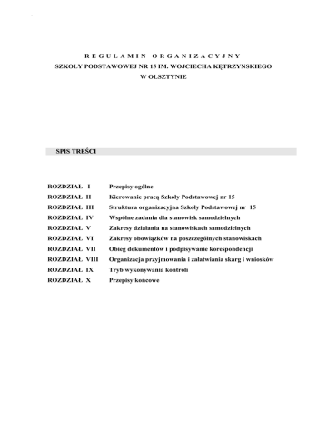 . REGULAMIN ORGANIZACYJNY SZKOŁY PODSTAWOWEJ NR 15 IM. WOJCIECHA KĘTRZYNSKIEGO W OLSZTYNIE SSPPIISS T TR RE EŚŚC CII ROZDZIAŁ I Przepisy ogólne ROZDZIAŁ II Kierowanie pracą Szkoły Podstawowej nr 15 ROZDZIAŁ III Struktura organizacyjna Szkoły Podstawowej nr 15 ROZDZIAŁ IV Wspólne zadania dla stanowisk samodzielnych ROZDZIAŁ V Zakresy działania na stanowiskach samodzielnych ROZDZIAŁ VI Zakresy obowiązków na poszczególnych stanowiskach ROZDZIAŁ VII Obieg dokumentów i podpisywanie korespondencji ROZDZIAŁ VIII Organizacja przyjmowania i załatwiania skarg i wniosków ROZDZIAŁ IX Tryb wykonywania kontroli ROZDZIAŁ X Przepisy końcowe . ROZDZIAŁ I Przepisy ogólne § 1. 1. Regulamin Organizacyjny Szkoły Podstawowej nr 15 im. Wojciecha Kętrzyńskiego w Olsztynie zwany dalej Regulaminem, określa szczegółową organizację oraz zasady funkcjonowania, kierowania, sprawowania nadzoru , a także wykaz zadań i odpowiedzialności dla poszczególnych stanowisk w placówce. 2. Ilekroć w Regulaminie jest mowa o: 1) dyrektorze - należy przez to rozumieć Dyrektora Szkoły Podstawowej nr 15 im. Wojciecha Kętrzyńskiego w Olsztynie; 2) statucie - należy przez to rozumieć Statut Szkoły Podstawowej nr 15 im. Wojciecha Kętrzyńskiego w Olsztynie; 3) ustawie - należy przez to rozumieć ustawę z ustawę z dnia 7 września 1991 o systemie oświaty ( tekst jednolity: Dz.U. z 2004 r. Nr 256 , poz. 2572 ze zm.1 ); 4) nauczycielu - należy przez to rozumieć nauczycieli zatrudnionych w Szkole Podstawowej nr 15 5) pracowniku samorządowym - należy przez to rozumieć pracowników szkoły; 6) szkole – należy przez to rozumieć Szkołę Podstawową nr 15 im. Wojciecha Kętrzyńskiego w Olsztynie; § 2. 1. Szkoła Podstawowa nr 15 im. Wojciecha Kętrzyńskiego w Olsztynie jest jednostką budżetową, powołaną do wykonywania przynależnych zadań publicznych określonych przepisami prawa: 1) oświatowego; 2) o rachunkowości; 3) o finansach publicznych; 4) powszechnie obowiązującego; 5) przejętych w drodze porozumień zawartych z organami administracji rządowej i samorządowej; 6) wewnątrzszkolnego. 2. Siedzibą Szkoły Podstawowej nr 15 im. Wojciecha Kętrzyńskiego w Olsztynie jest budynek przy ulicy Kętrzyńskiego nr 10. 3. Organem prowadzącym szkołę jest Gmina Olsztyn. 4. Nadzór pedagogiczny na szkołą sprawuje Warmińsko – Mazurskie Kuratorium Oświaty. § 3. 1. Podstawą prawną działania Szkoły Podstawowej nr 15 im. Wojciecha Kętrzyńskiego w Olsztynie są: 1) orzeczenie organizacyjne z dnia 30 marca 1983 r. wydane przez Inspektora Oświaty i Wychowania mgr Mieczysława Krygiera; 2) Statut szkoły. § 4. 1. Akty wewnątrzszkolne , o których mowa w § 2 ust. 1 pkt 4 , wydawane są w formie pisemnej przez Radę Pedagogiczną Szkoły Podstawowej nr 15, Dyrektora szkoły, lub z jego upoważnienia przez inne osoby, a także na podstawie szczegółowych upoważnień, wynikających z przepisów prawnych. 2. Aktami wewnątrzszkolnymi są; 1) uchwały Rady Pedagogicznej; 1 Zmiany tekstu jednolitego wymienionej ustawy zostały ogłoszone w Dz.U. z 2004 r. Nr 273, poz.2703 i Nr 281, poz. 2781, z 2005 r. Nr 17, poz.141, Nr 94, poz.788, Nr 122, poz.1020, Nr 131, poz.1091, Nr 167, poz.1400 i Nr 249, poz.2104, z 2006 r. Nr 144, poz.1043, Nr 108, pioz.1532 i Nr 227, poz.1658 , z 2007 r. Nr 42, poz.273, Nr 80, poz.542 oraz z 2008 r. Nr 70, poz.416, Nr 145, poz.917, Nr 216, poz. 1370, Nr 235, poz.1618 . 2) zarządzenia Dyrektora Szkoły; 3) decyzje administracyjne; 4) komunikaty; 5) pisma okólne. 3. Uchwały Rady Pedagogicznej rozstrzygają w szczególności sprawy, o których mowa w §26 statutu szkoły, zapisane są w protokołach z zebrań Rady Pedagogicznej. 4. Zarządzenia dyrektora szkoły regulują zasadnicze dla szkoły sprawy wymagające trwałego unormowania. Pracownicy szkoły zapoznawani są z Zarządzeniami poprzez zamieszczenie informacji na tablicy ogłoszeń, dodatkowo drogą elektroniczną lub Zarządzenia omawiane są na zebraniach Rady pedagogicznej, pracowników niepedagogicznych. 5. Decyzjami rozstrzyga się sprawy o charakterze indywidualnym lub których czas obowiązywania jest ściśle określony. 6. Pisma okólne powiadamiają o czymś , co nie wchodzi w zakres zarządzeń i decyzji, a jest istotne dla sprawnego funkcjonowania szkoły. 7. Komunikatami podawane są do wiadomości pracowników i uczniów informacje o bieżącej działalności szkoły. § 5. 1. Zbiory aktów normatywnych powszechnie obowiązujących i resortowych prowadzi specjalista. 2. Zbiór i ewidencję aktów wewnątrzszkolnych prowadzi specjalista. § 6. 1. Szkoła Podstawowa nr 15 jest jednostką budżetową, której gospodarka finansowa prowadzona jest na zasadach określonych w ustawie z dnia 27 sierpnia 2009 r. o finansach publicznych (Dz. U. Nr 157, poz. 1241) 2. Podstawą gospodarki finansowej szkoły jest roczny plan finansowy zatwierdzony przez Radę Miasta w Olsztynie. 3. Szkoła pokrywa swoje wydatki bezpośrednio z budżetu miasta a pobrane dochody budżetowe odprowadza na rachunek budżetu miasta. 4. Szkoła prowadzi rachunkowość w oparciu o obowiązujące przepisy i sporządza na ich podstawie sprawozdawczość finansową. 5. Dyrektor szkoły odpowiada za dyscyplinę budżetową. ROZDZIAŁ II Kierowanie pracą Szkoły Podstawowej nr 15 § 7. Funkcjonowanie szkoły opiera się na zasadach jednoosobowego kierownictwa, służbowego podporządkowania, podziału czynności i indywidualnej odpowiedzialności za wykonanie powierzonych zadań. § 8. 1. Dyrektor szkoły pełni funkcję Przewodniczącego Rady Pedagogicznej. 2. Dyrektor szkoły kieruje pracą szkoły przy pomocy wicedyrektora, głównego księgowego, kierownika gospodarczego. 3. Dyrektor realizuje uprawnienia zwierzchnika służbowego w stosunku do pracowników szkoły . § 9. 1. Zakresy zadań wicedyrektora i osób pełniących funkcje kierownicze w szkole określa dyrektor szkoły na piśmie w formie zada